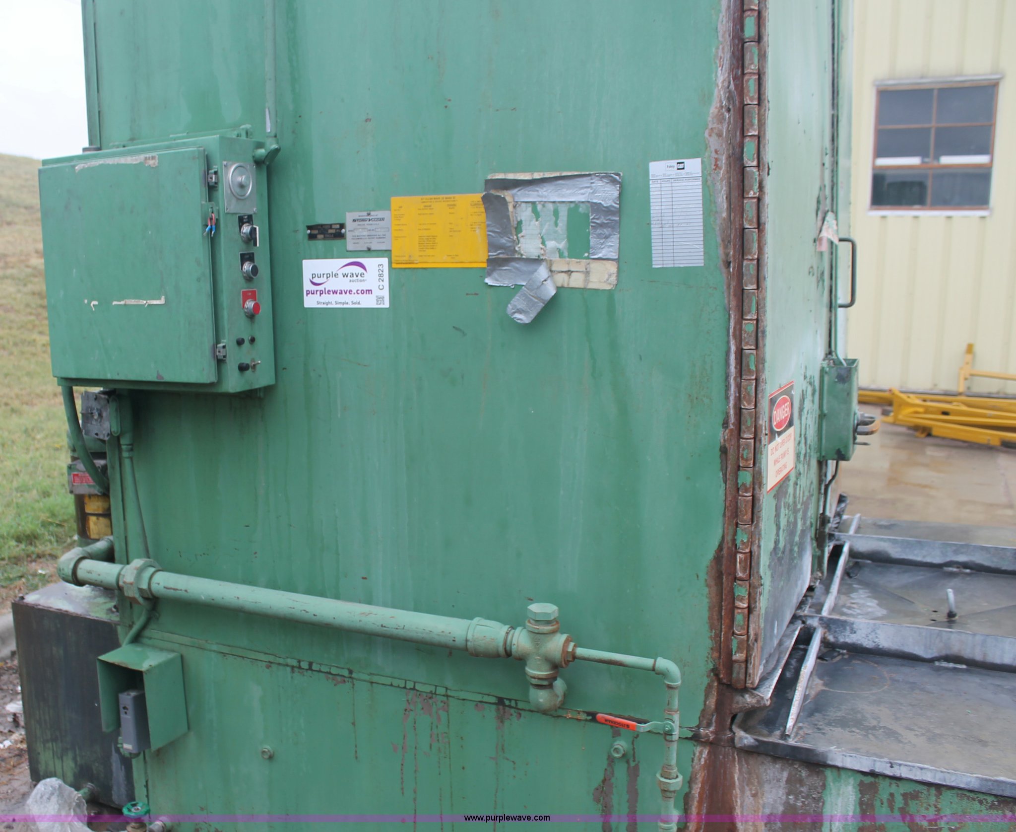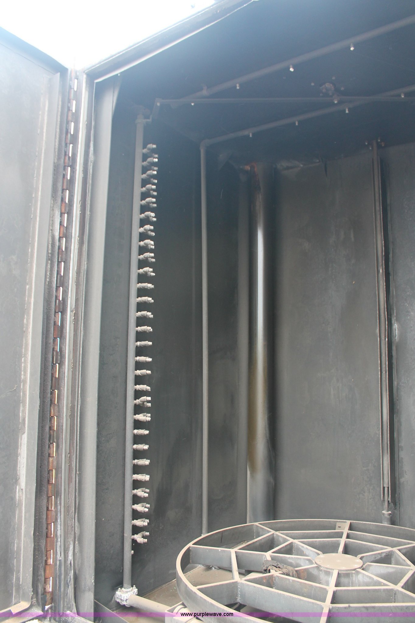 Purple Wave is selling a used Tools in Kansas. This item is a Storm Vulcan Mark IV industrial wash cabinet with the following: 43.7 amps, 230V, 60 cycle, (2) 7.5 HP centrifugal pumps, 225 gallon water capacity, 147,400 natural gas burner, Power vapor draft, 50" diameter turn table, 76" load height, 76"W x 106"D x 120"H overall, Stored indoors, Operational when removed from service in Spring 2010, Serial 203