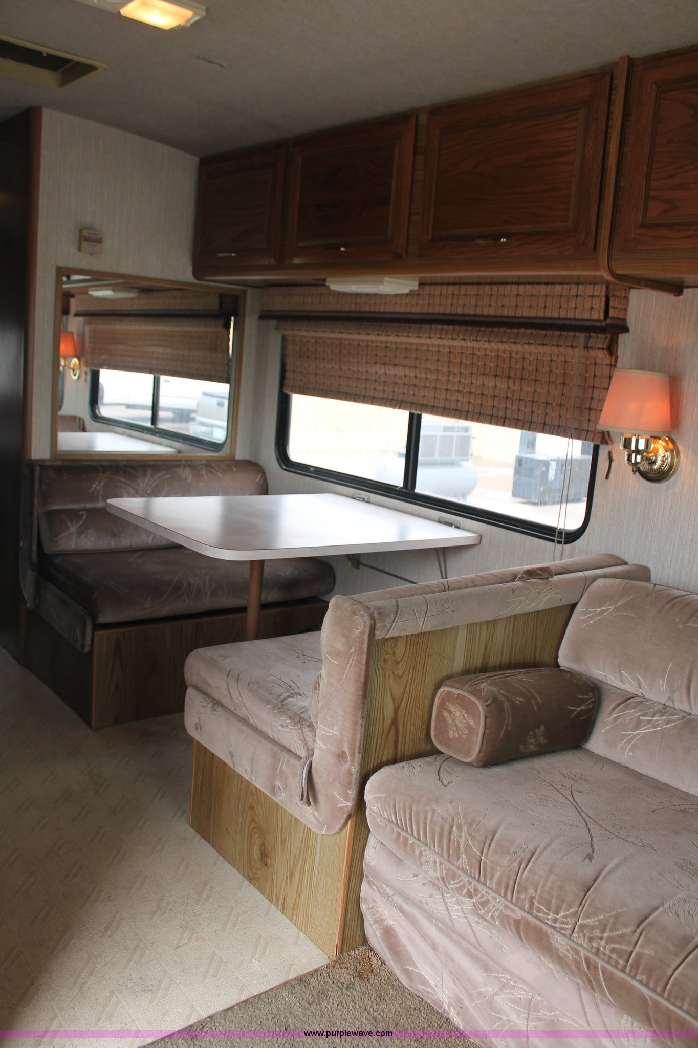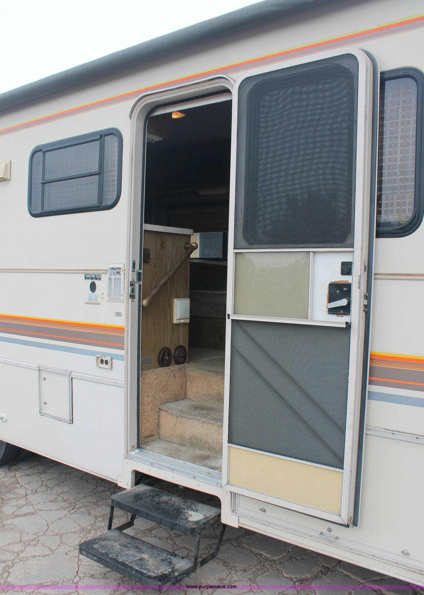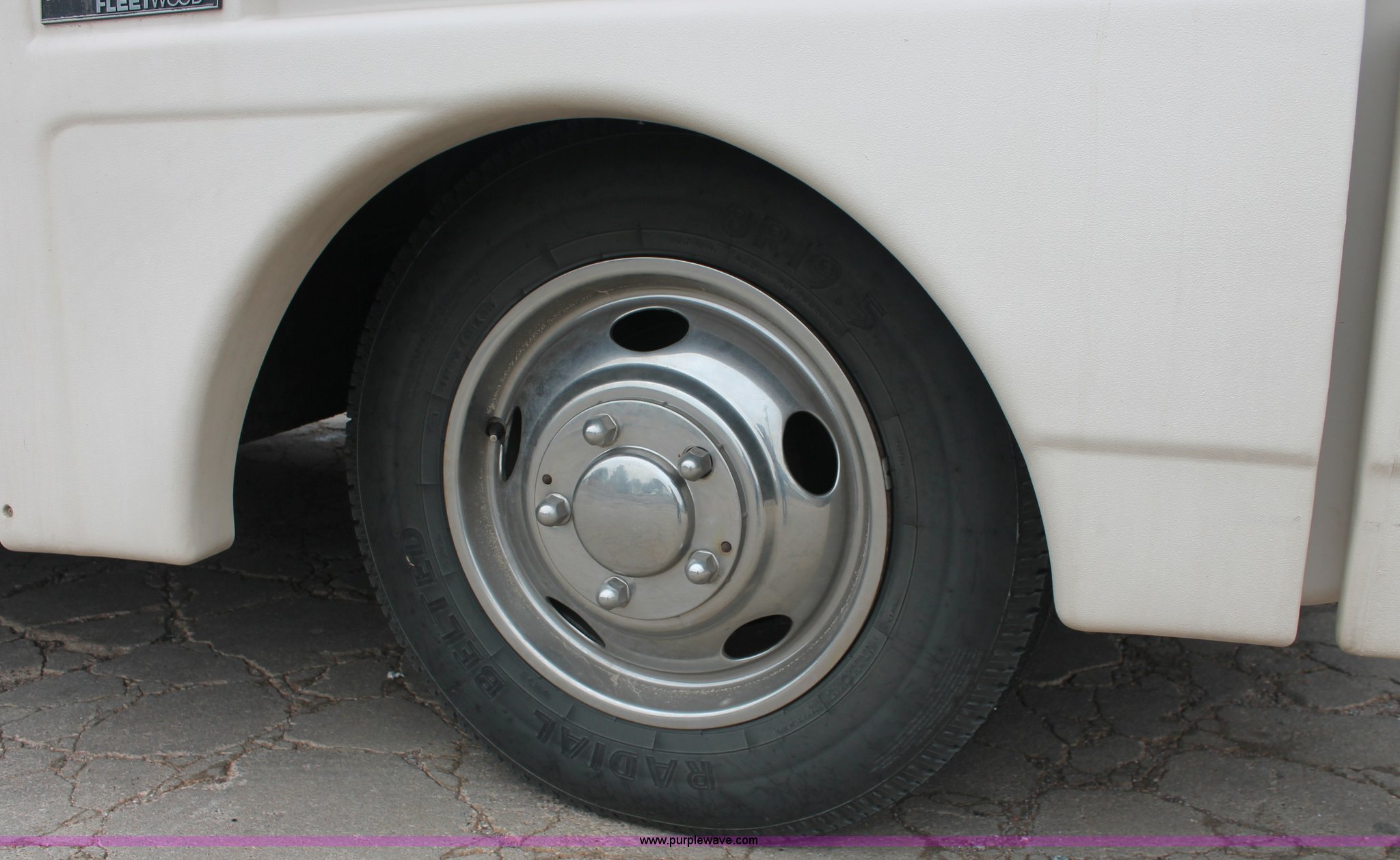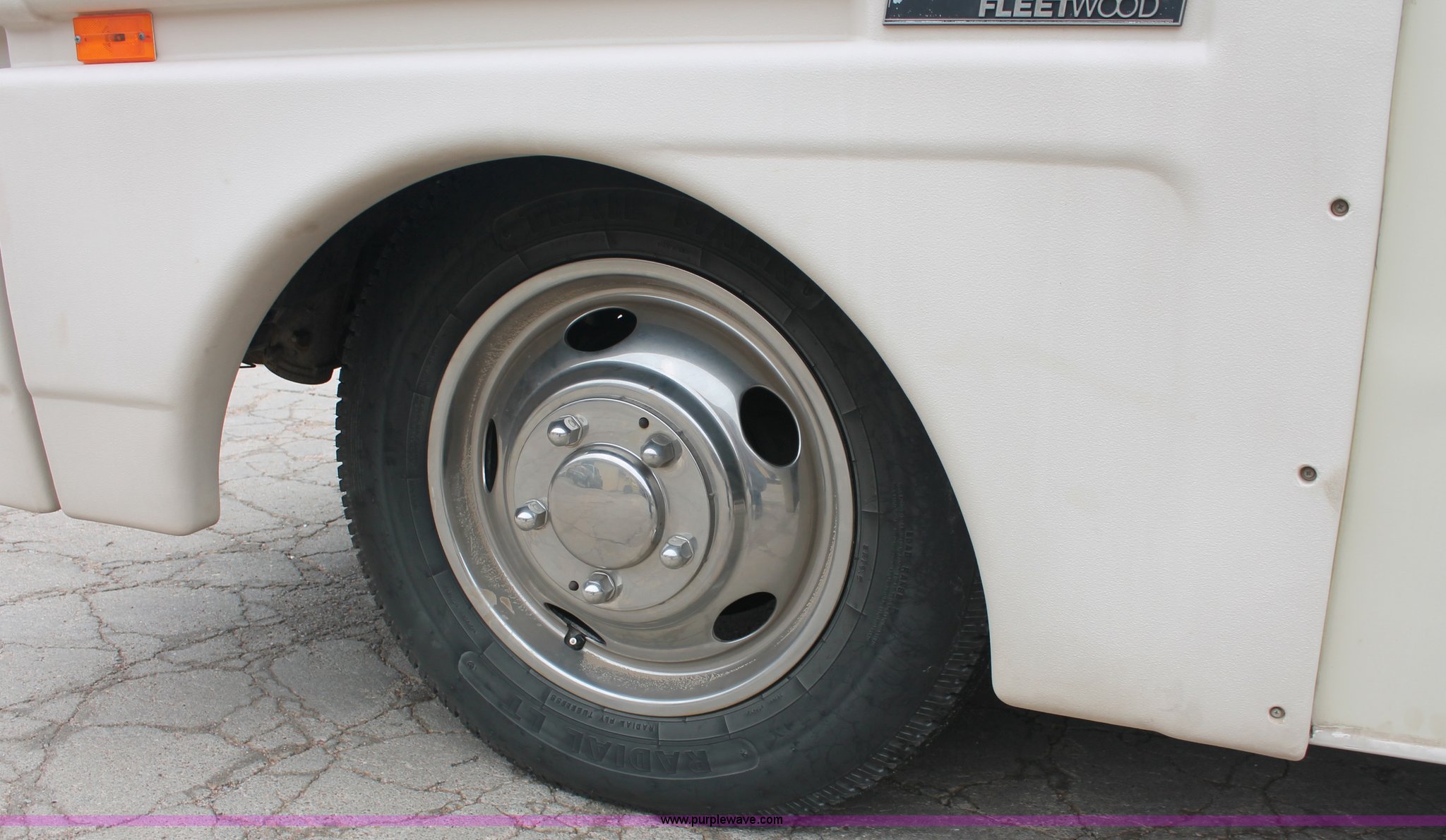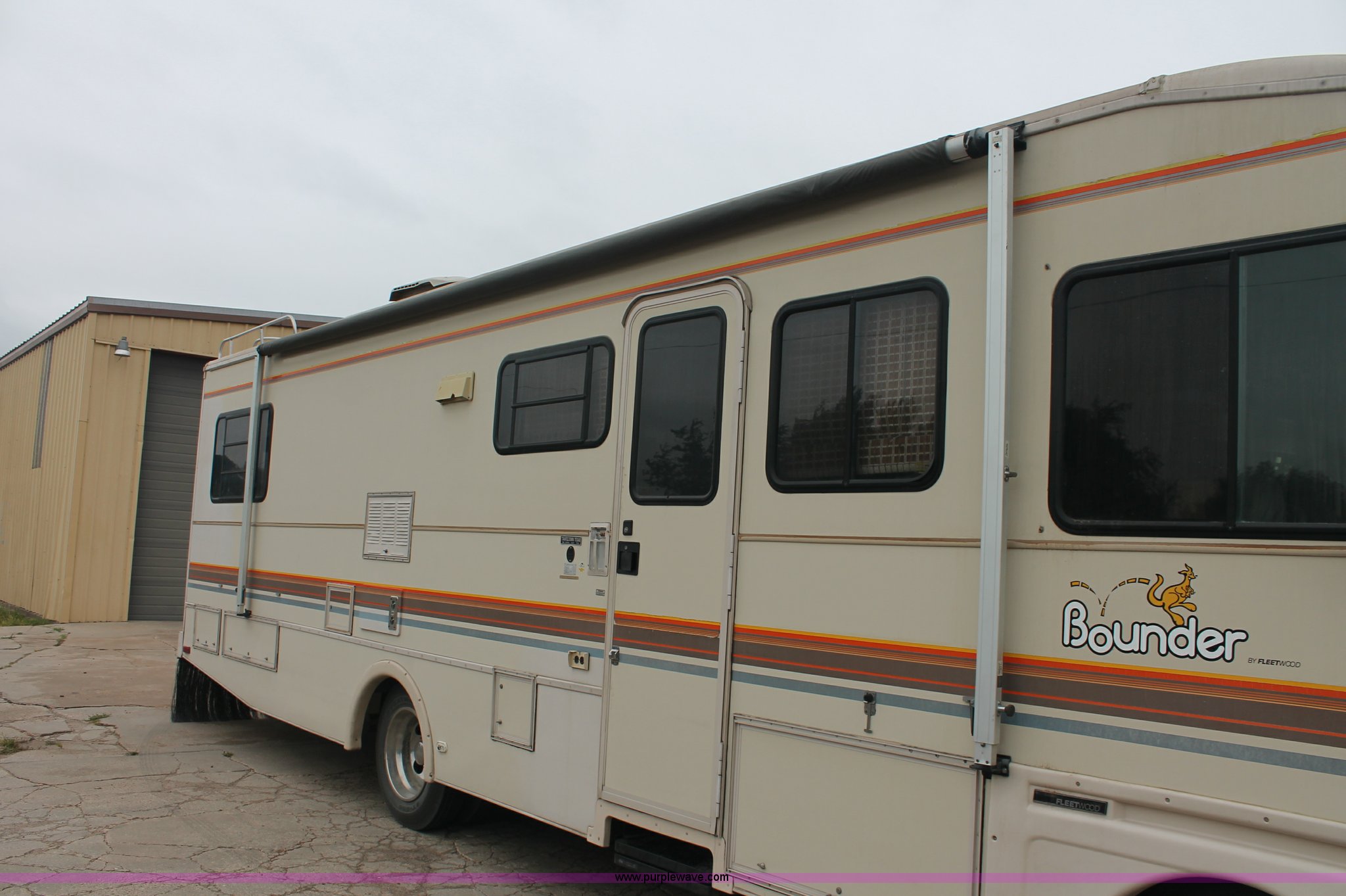 Purple Wave is selling a used RV in Kansas. This item is a 1991 Fleetwood Bounder 31' RV camper with the following: 53,594 actual miles, Chevrolet 454 V8 gas engine, Turbo 400 automatic transmission, AC and heat, Tilt, Cruise, AM/FM/CD, Manual windows and locks, Cobra 18 weatherband CB radio, Cloth interior, Six person capacity, (2) Panasonic televisions, Optimus sound system, Onan 6500 Emerald Plus GenSet, 867 hours on meter, Two basin sink, Black & Decker coffee maker, Magic Chef microwave, Magic Chef four burner range and oven, Norcold refrigerator/freezer combo, Toilet, lavatory, and shower, (2) Colman AC units, Central heat, Private master bedroom, Master shut-off switch, Oak trim, Electric entry steps, Retractable awning, Exterior storage, Receiver hitch, 2" ball, Trailer wiring, 8R19.5 tires, Recently replaced, Engine oil leak