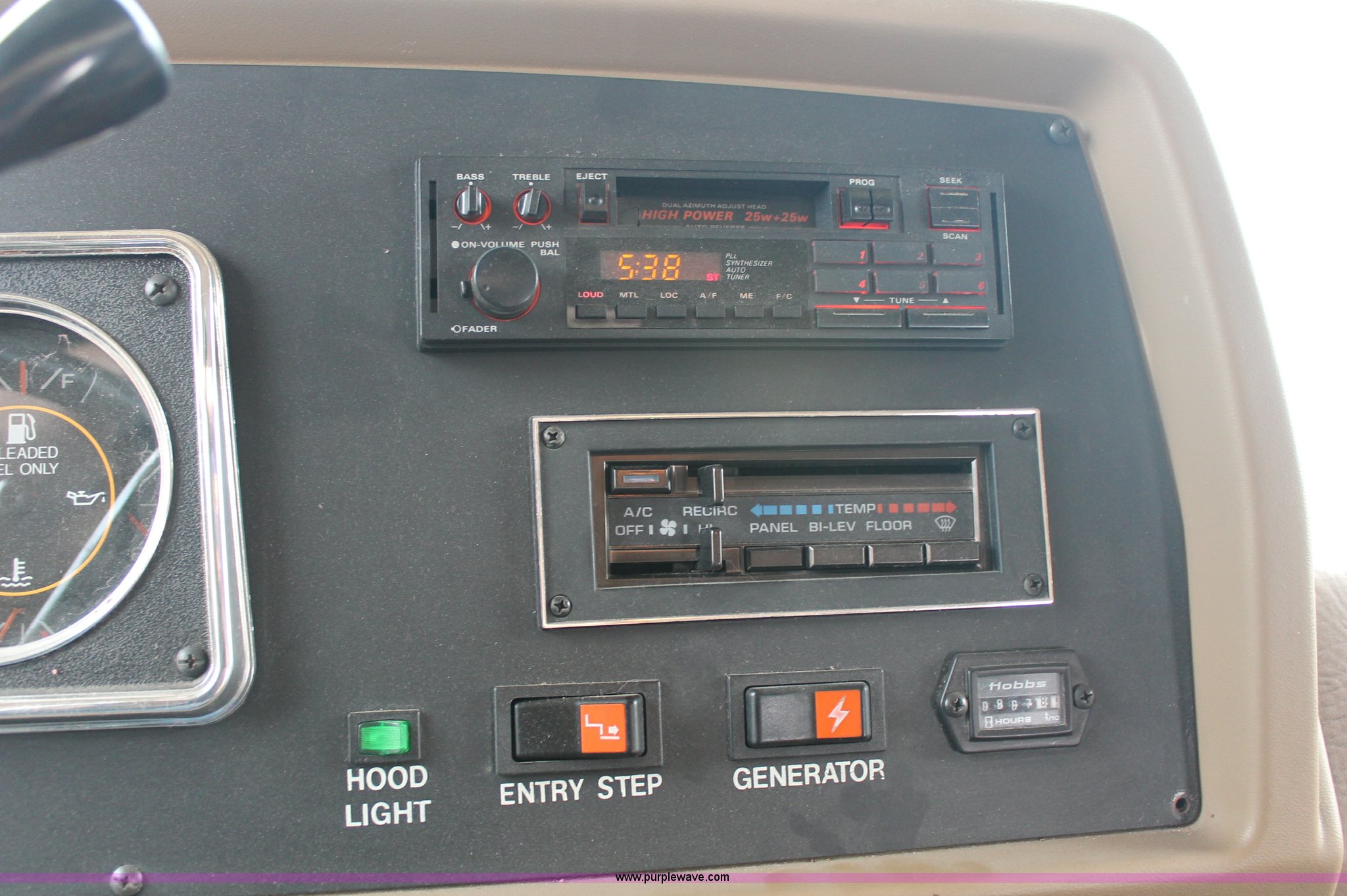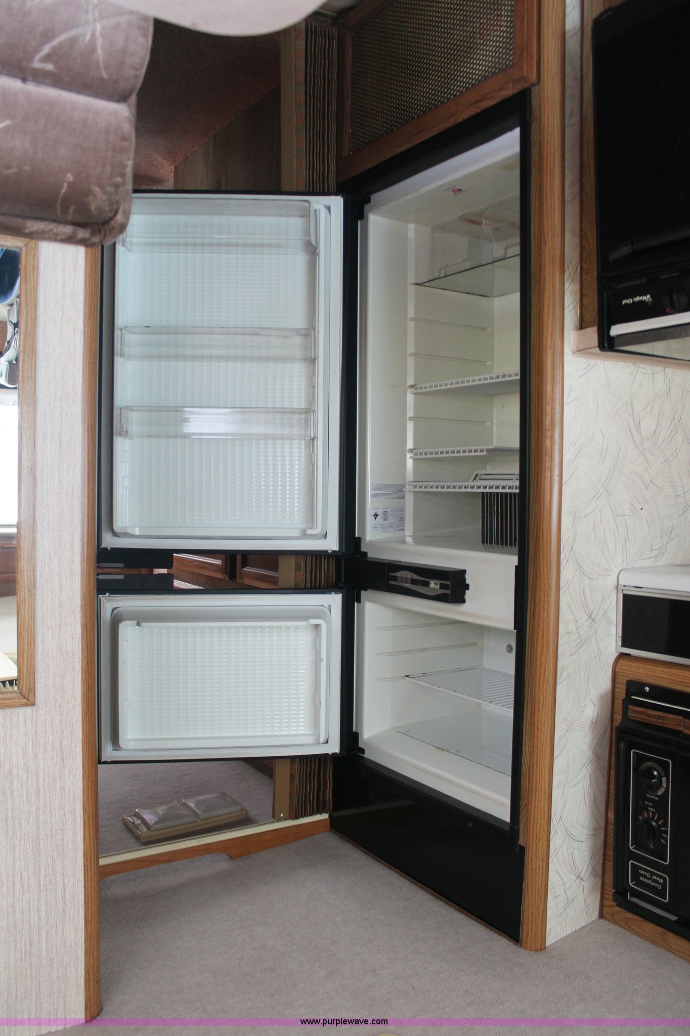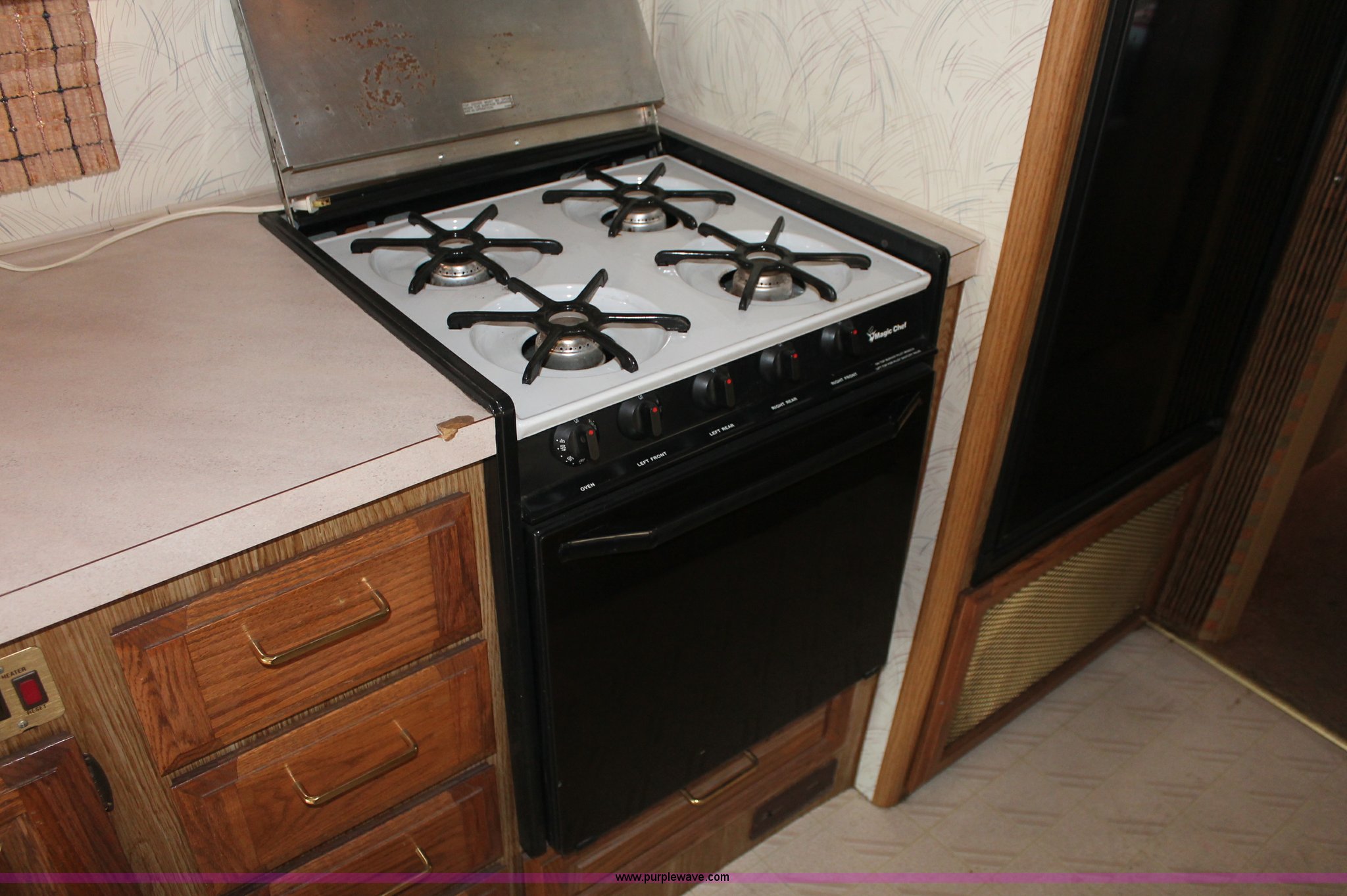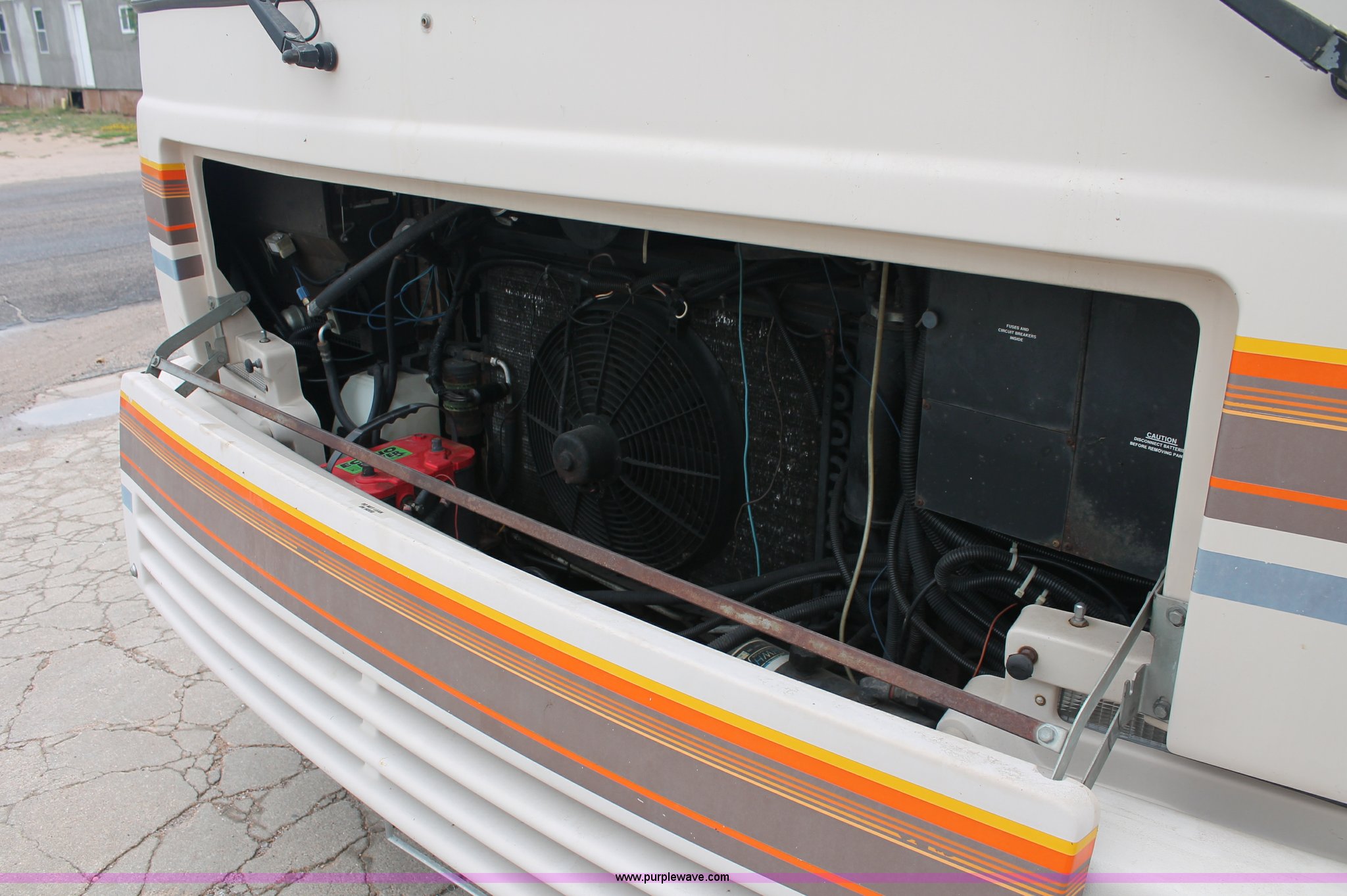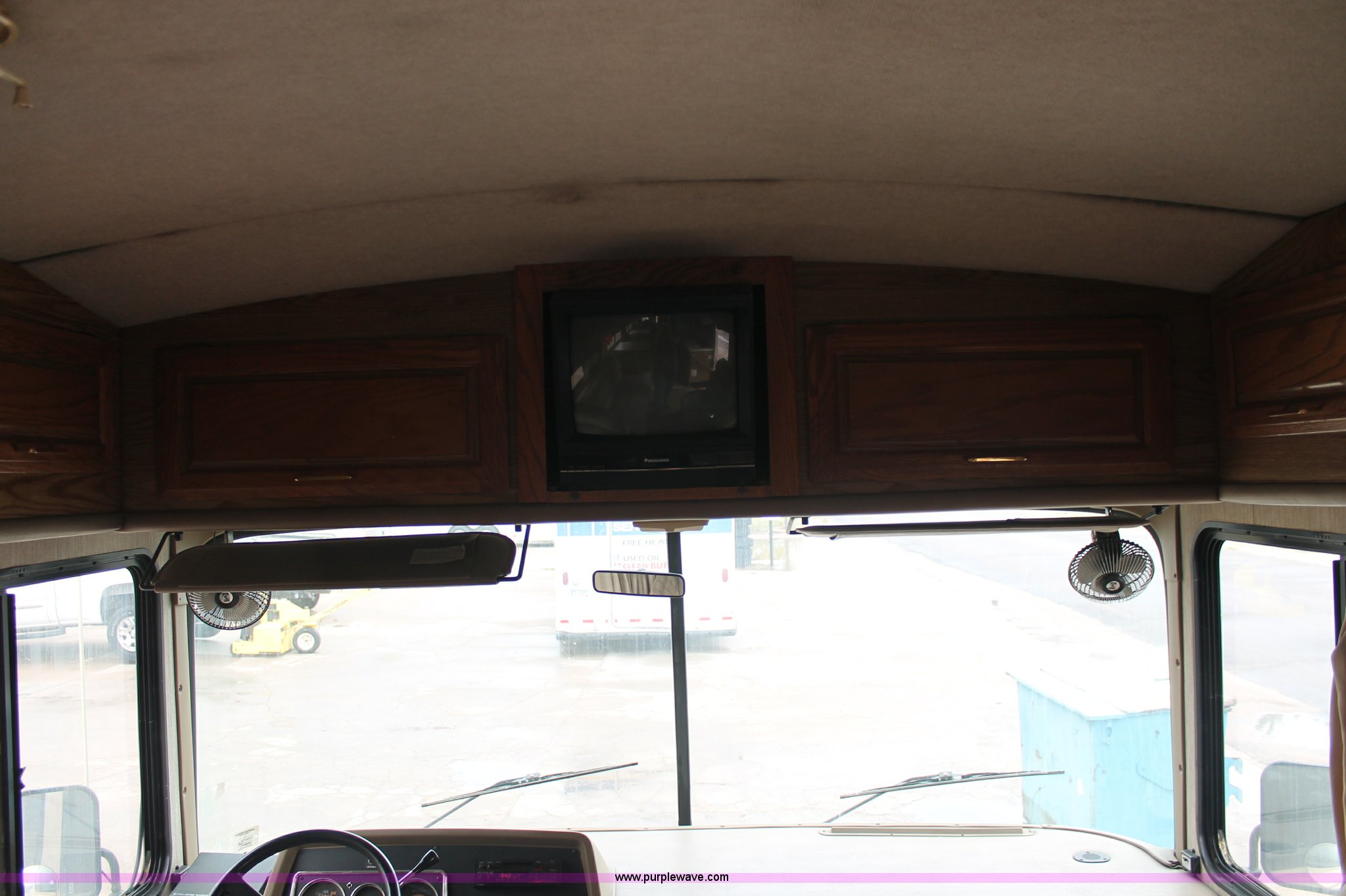 Purple Wave is selling a used RV in Kansas. This item is a 1991 Fleetwood Bounder 31' RV camper with the following: 53,594 actual miles, Chevrolet 454 V8 gas engine, Turbo 400 automatic transmission, AC and heat, Tilt, Cruise, AM/FM/CD, Manual windows and locks, Cobra 18 weatherband CB radio, Cloth interior, Six person capacity, (2) Panasonic televisions, Optimus sound system, Onan 6500 Emerald Plus GenSet, 867 hours on meter, Two basin sink, Black & Decker coffee maker, Magic Chef microwave, Magic Chef four burner range and oven, Norcold refrigerator/freezer combo, Toilet, lavatory, and shower, (2) Colman AC units, Central heat, Private master bedroom, Master shut-off switch, Oak trim, Electric entry steps, Retractable awning, Exterior storage, Receiver hitch, 2" ball, Trailer wiring, 8R19.5 tires, Recently replaced, Engine oil leak
