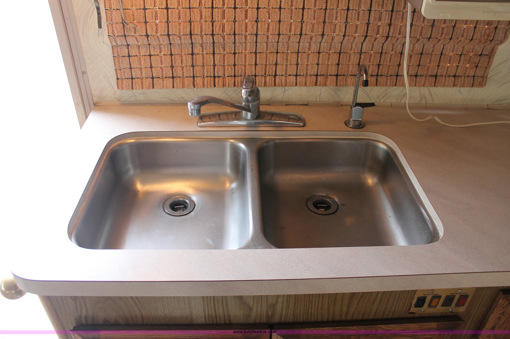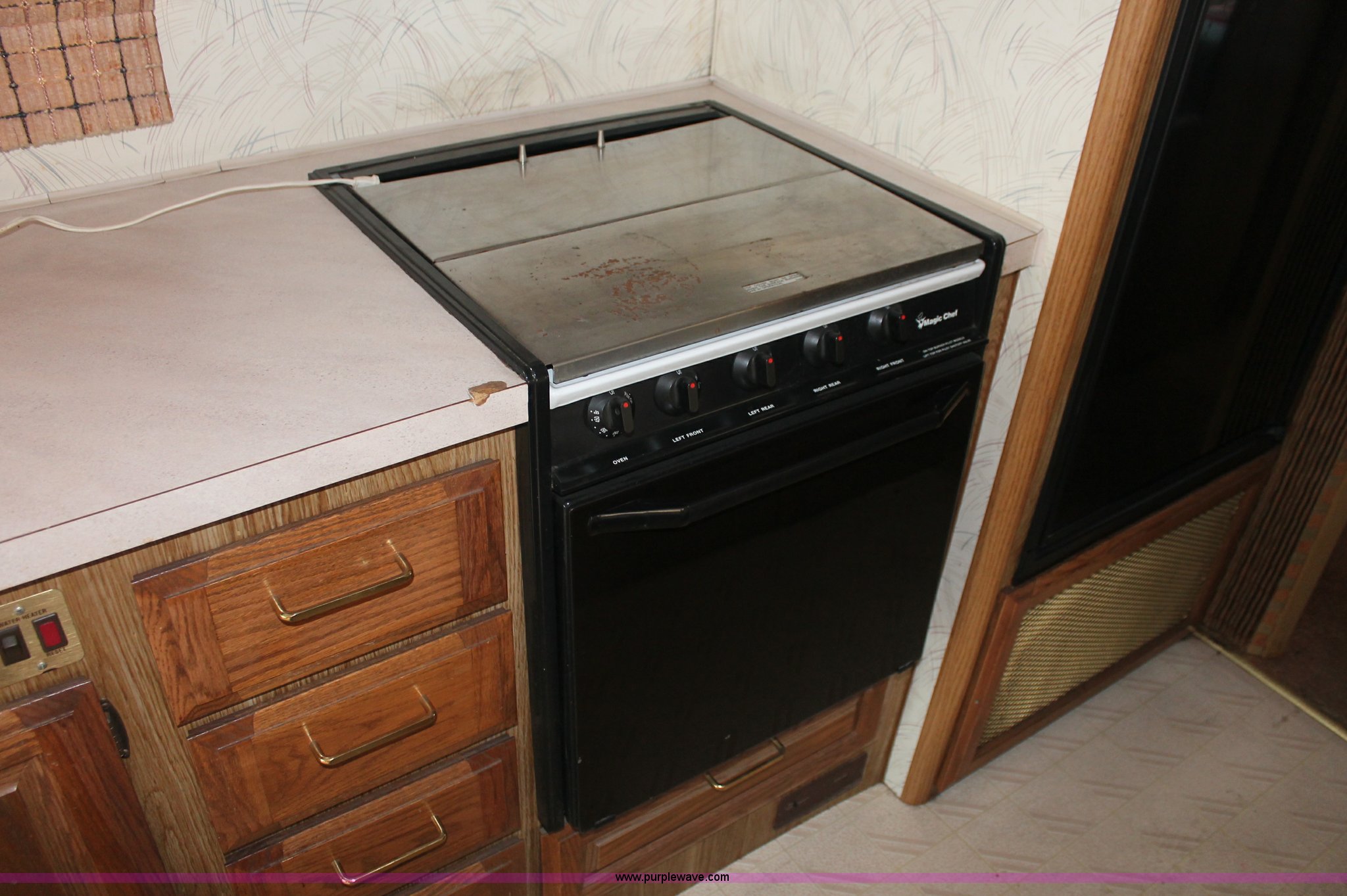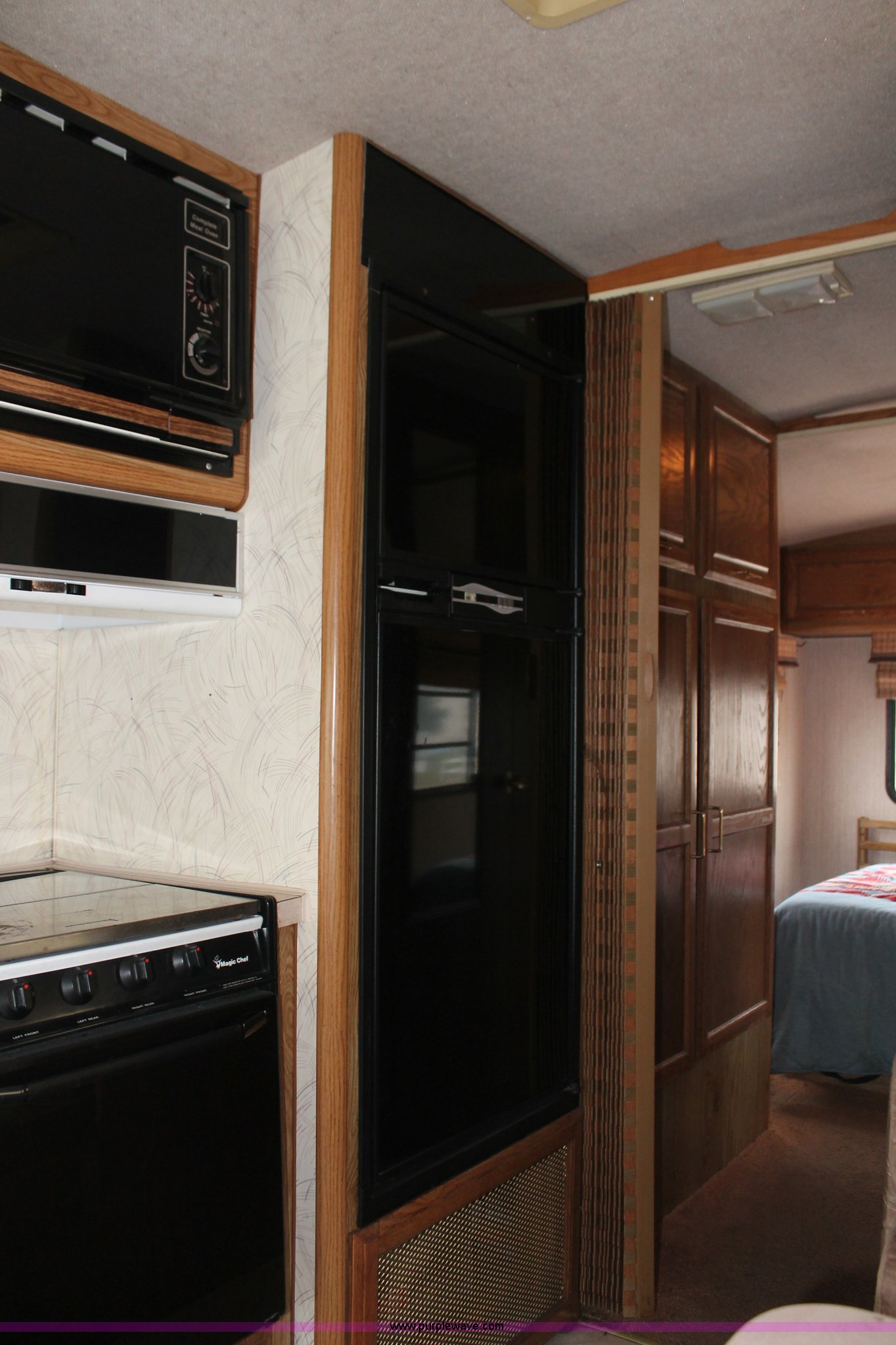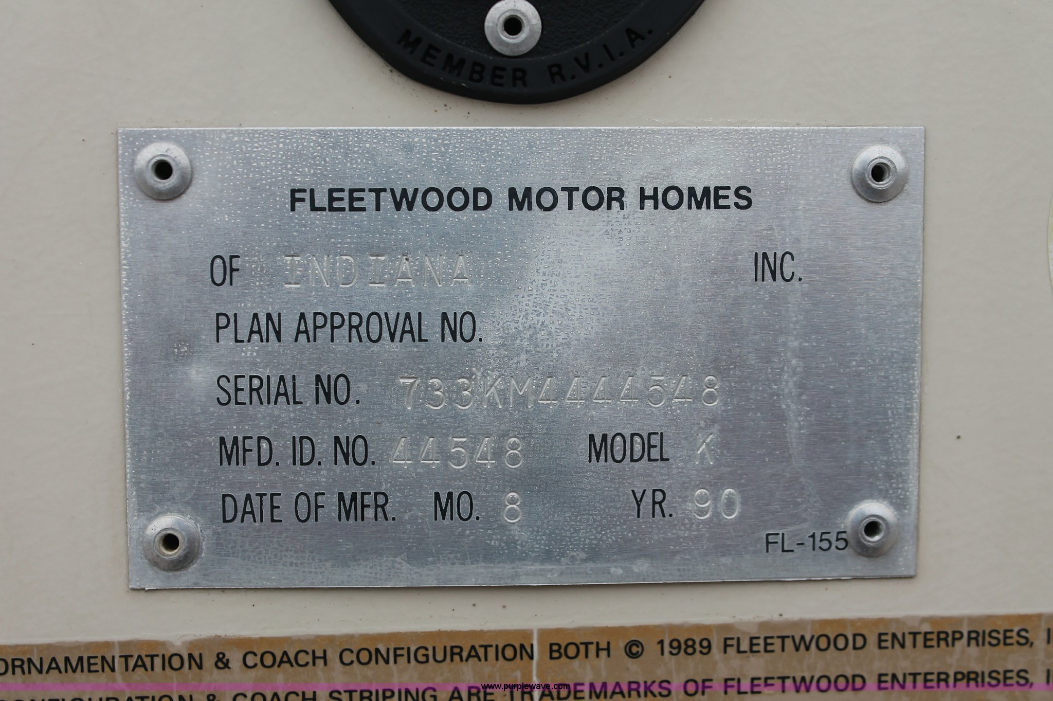 Purple Wave is selling a used RV in Kansas. This item is a 1991 Fleetwood Bounder 31' RV camper with the following: 53,594 actual miles, Chevrolet 454 V8 gas engine, Turbo 400 automatic transmission, AC and heat, Tilt, Cruise, AM/FM/CD, Manual windows and locks, Cobra 18 weatherband CB radio, Cloth interior, Six person capacity, (2) Panasonic televisions, Optimus sound system, Onan 6500 Emerald Plus GenSet, 867 hours on meter, Two basin sink, Black & Decker coffee maker, Magic Chef microwave, Magic Chef four burner range and oven, Norcold refrigerator/freezer combo, Toilet, lavatory, and shower, (2) Colman AC units, Central heat, Private master bedroom, Master shut-off switch, Oak trim, Electric entry steps, Retractable awning, Exterior storage, Receiver hitch, 2" ball, Trailer wiring, 8R19.5 tires, Recently replaced, Engine oil leak