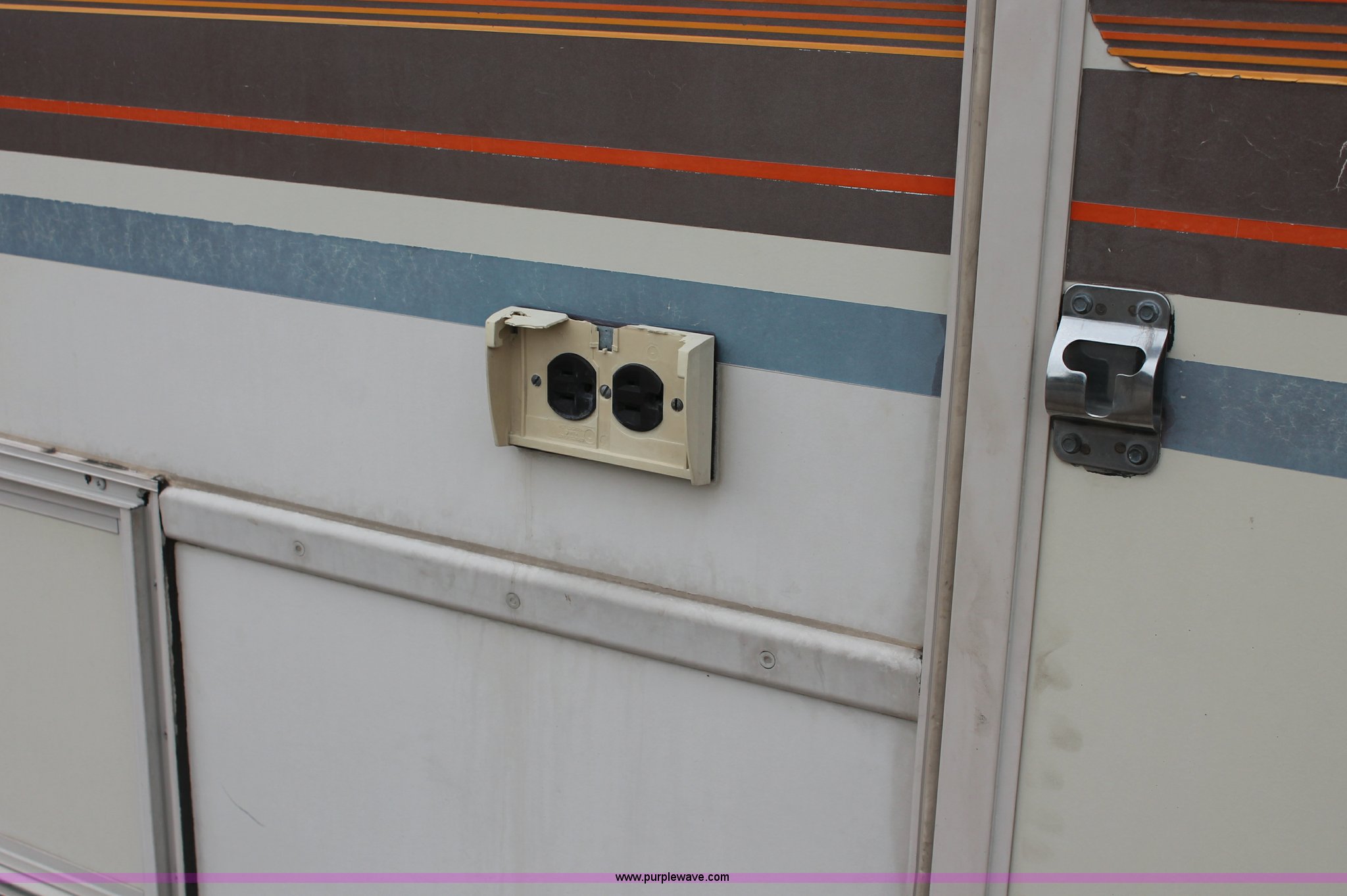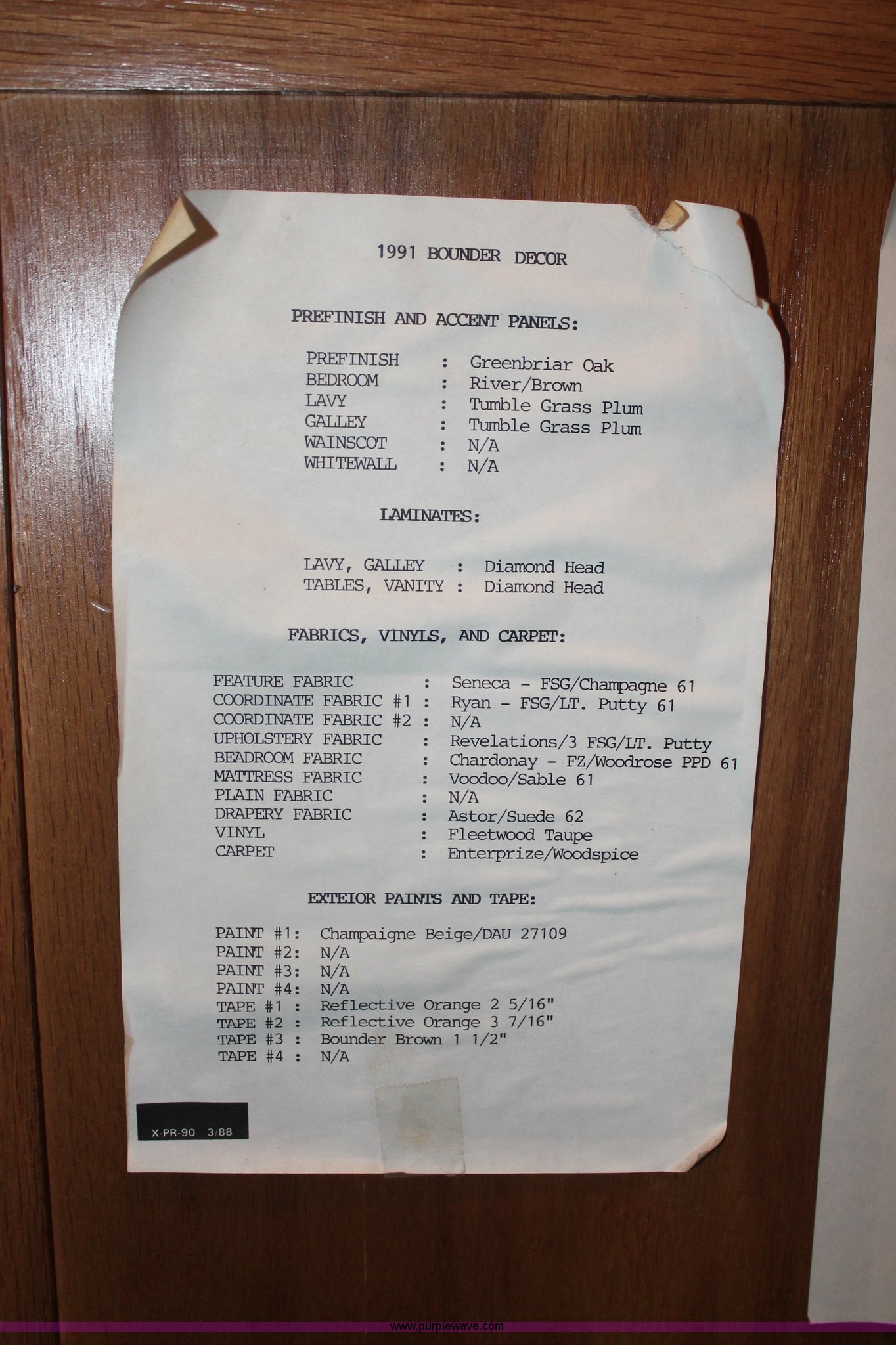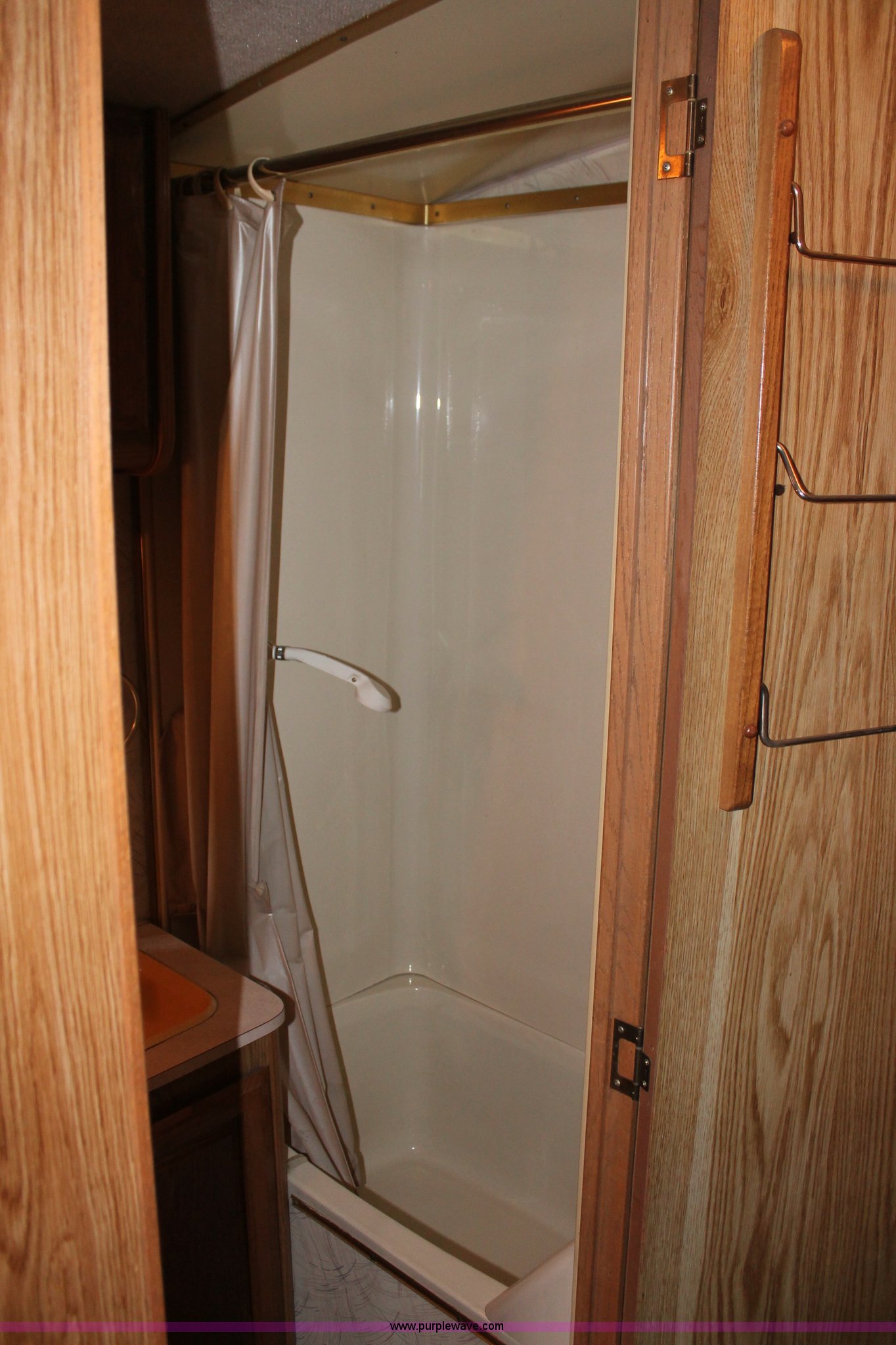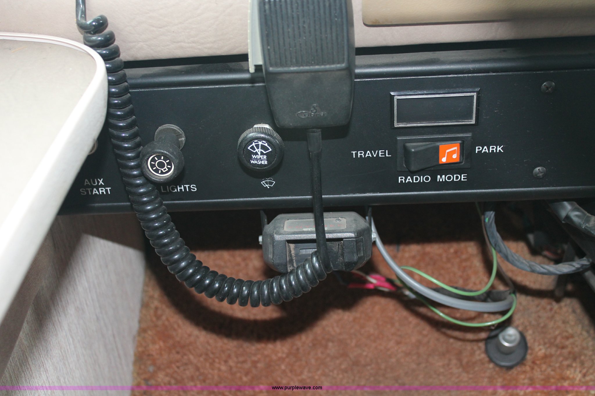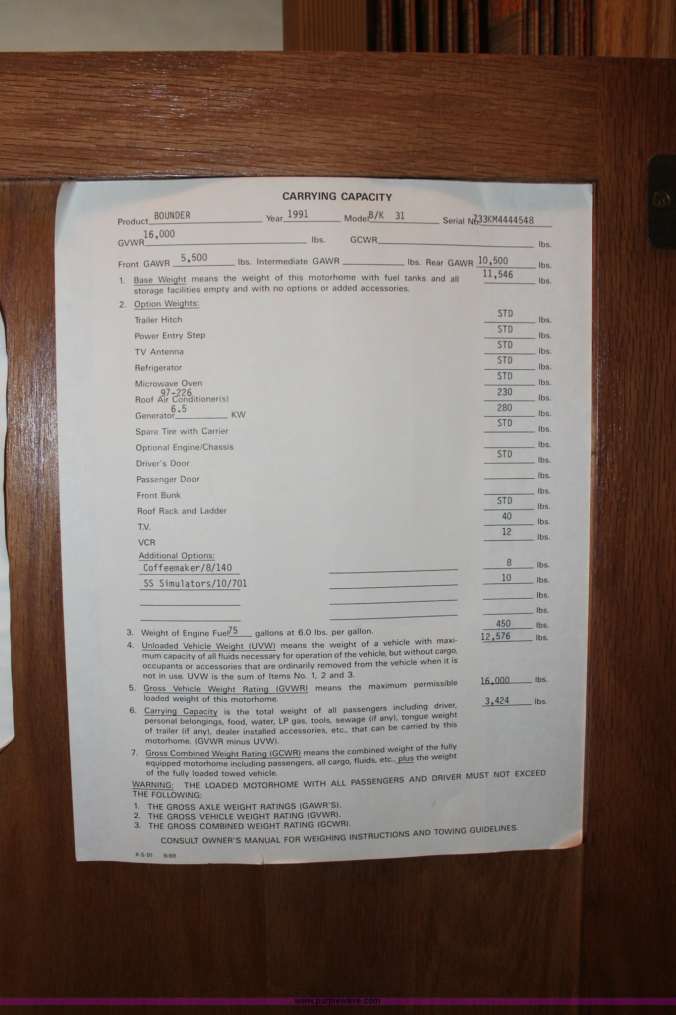 Purple Wave is selling a used RV in Kansas. This item is a 1991 Fleetwood Bounder 31' RV camper with the following: 53,594 actual miles, Chevrolet 454 V8 gas engine, Turbo 400 automatic transmission, AC and heat, Tilt, Cruise, AM/FM/CD, Manual windows and locks, Cobra 18 weatherband CB radio, Cloth interior, Six person capacity, (2) Panasonic televisions, Optimus sound system, Onan 6500 Emerald Plus GenSet, 867 hours on meter, Two basin sink, Black & Decker coffee maker, Magic Chef microwave, Magic Chef four burner range and oven, Norcold refrigerator/freezer combo, Toilet, lavatory, and shower, (2) Colman AC units, Central heat, Private master bedroom, Master shut-off switch, Oak trim, Electric entry steps, Retractable awning, Exterior storage, Receiver hitch, 2" ball, Trailer wiring, 8R19.5 tires, Recently replaced, Engine oil leak