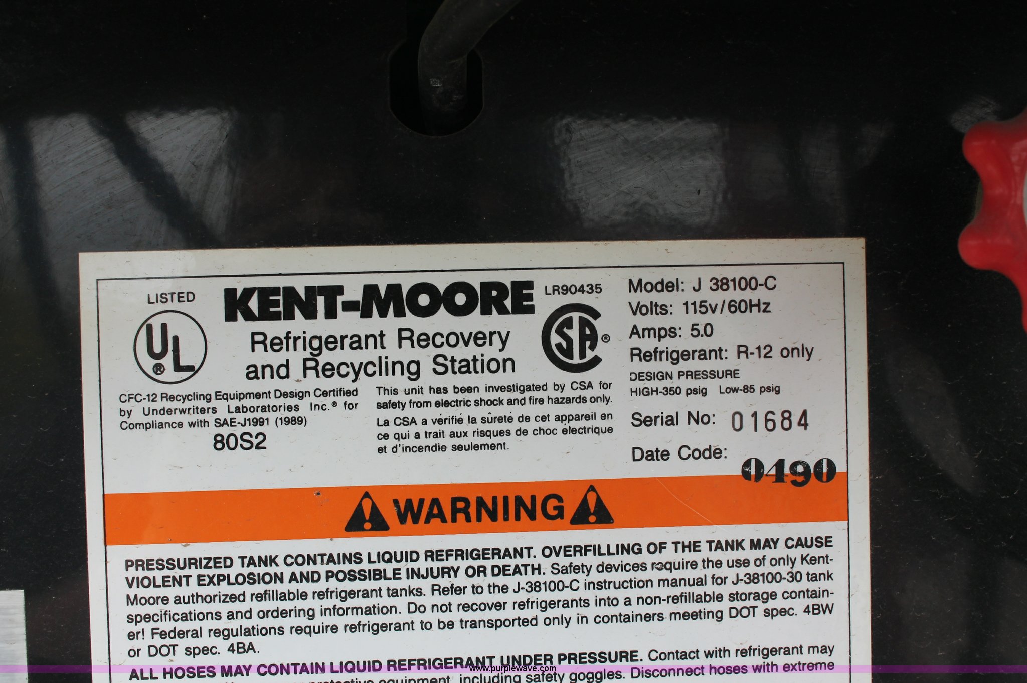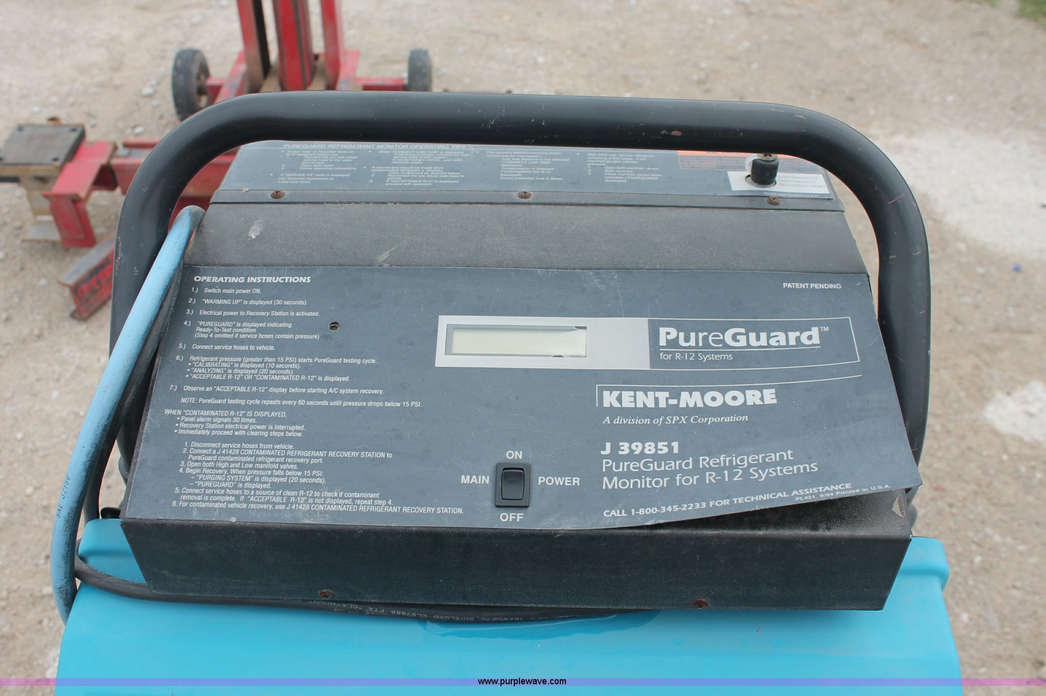 Kent-Moore air conditioning, refrigerant recovery, and recycling system. Kent-Moore J39851 Pureguard refrigerant monitor, 115V, Tank included, For R12 systems, Serial 01684. Shipping quotes available. 1204 Minneola Rd. Dodge City, KS 67801