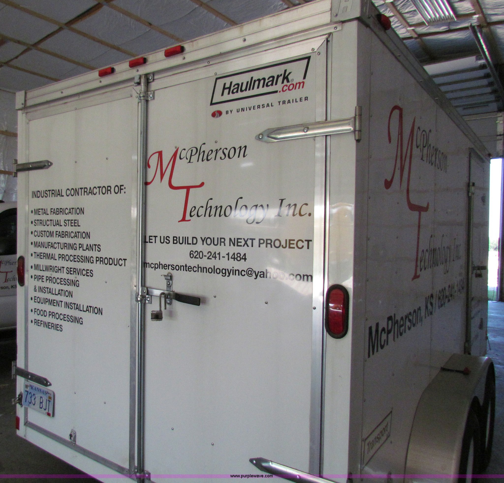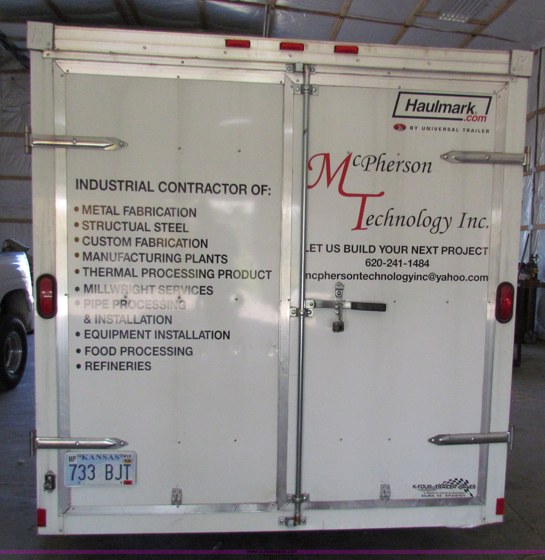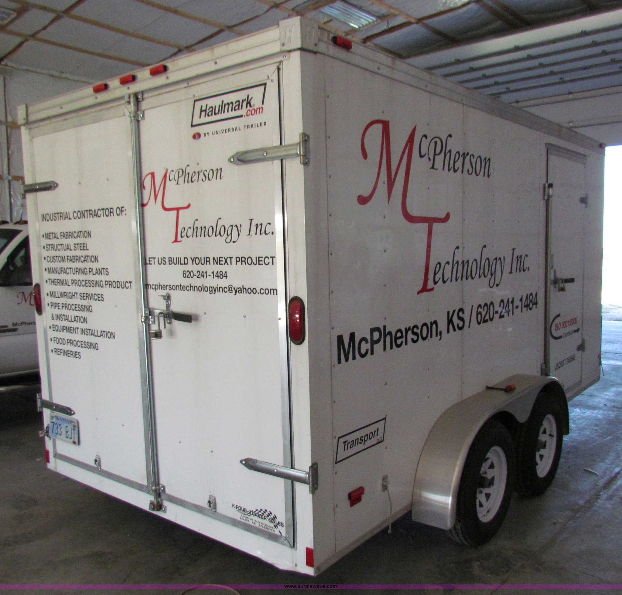 2009 Haulmark 14' enclosed trailer. V-nose, 7'W, 2 5/16" ball, (2) 7,000 lb axles, 205/75R15 tires, Contents not included. Title distribution may be delayed up to 14 days from verification of funds. 16HPB14219H177222. Shipping quotes available. McPherson Technology. McPherson, KS 67460