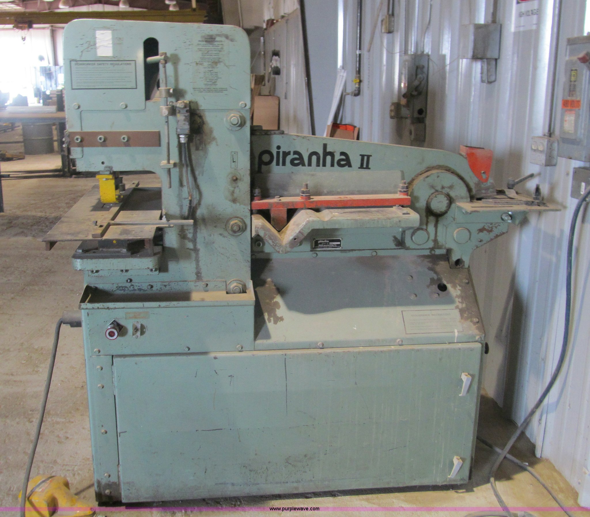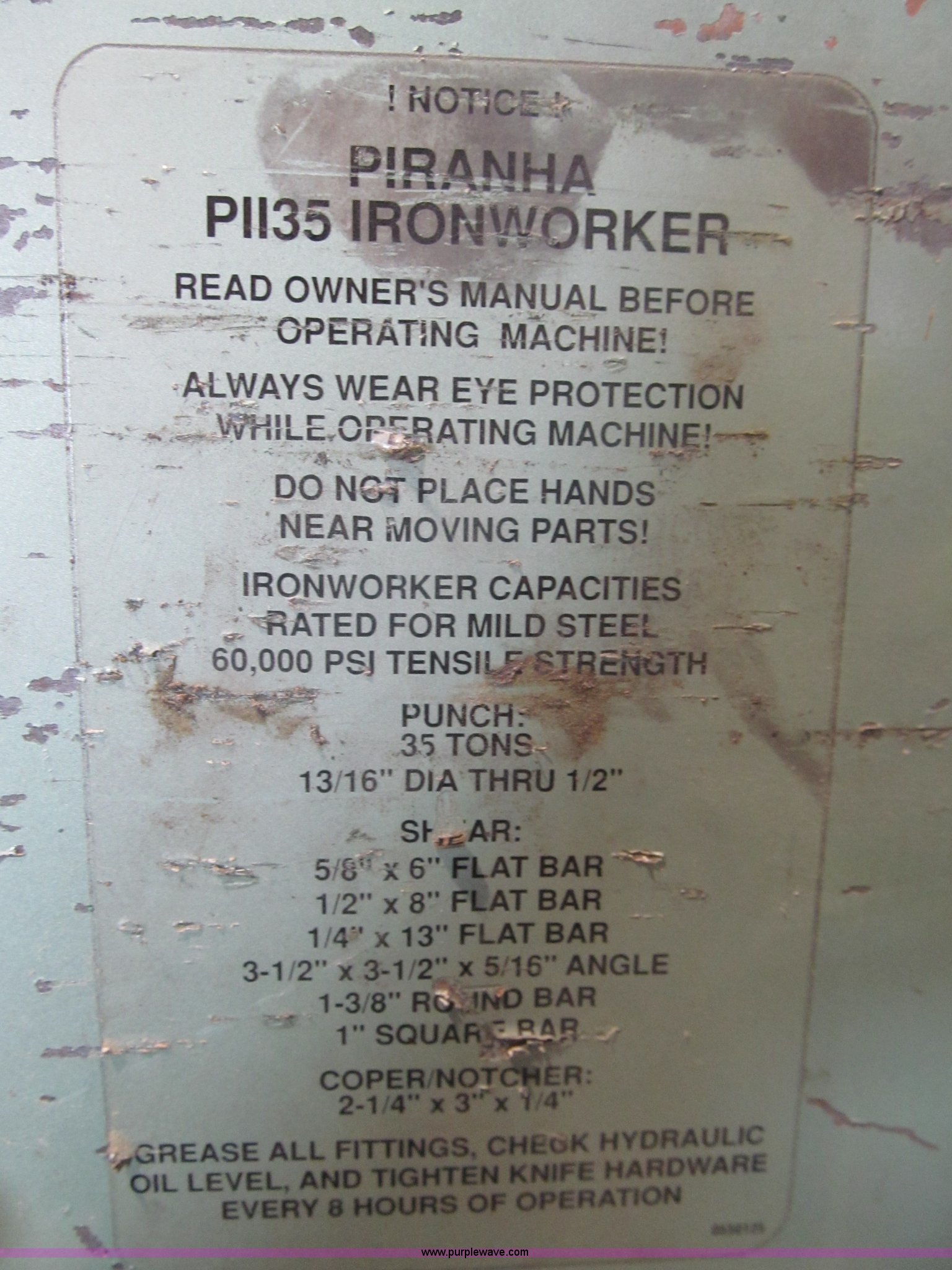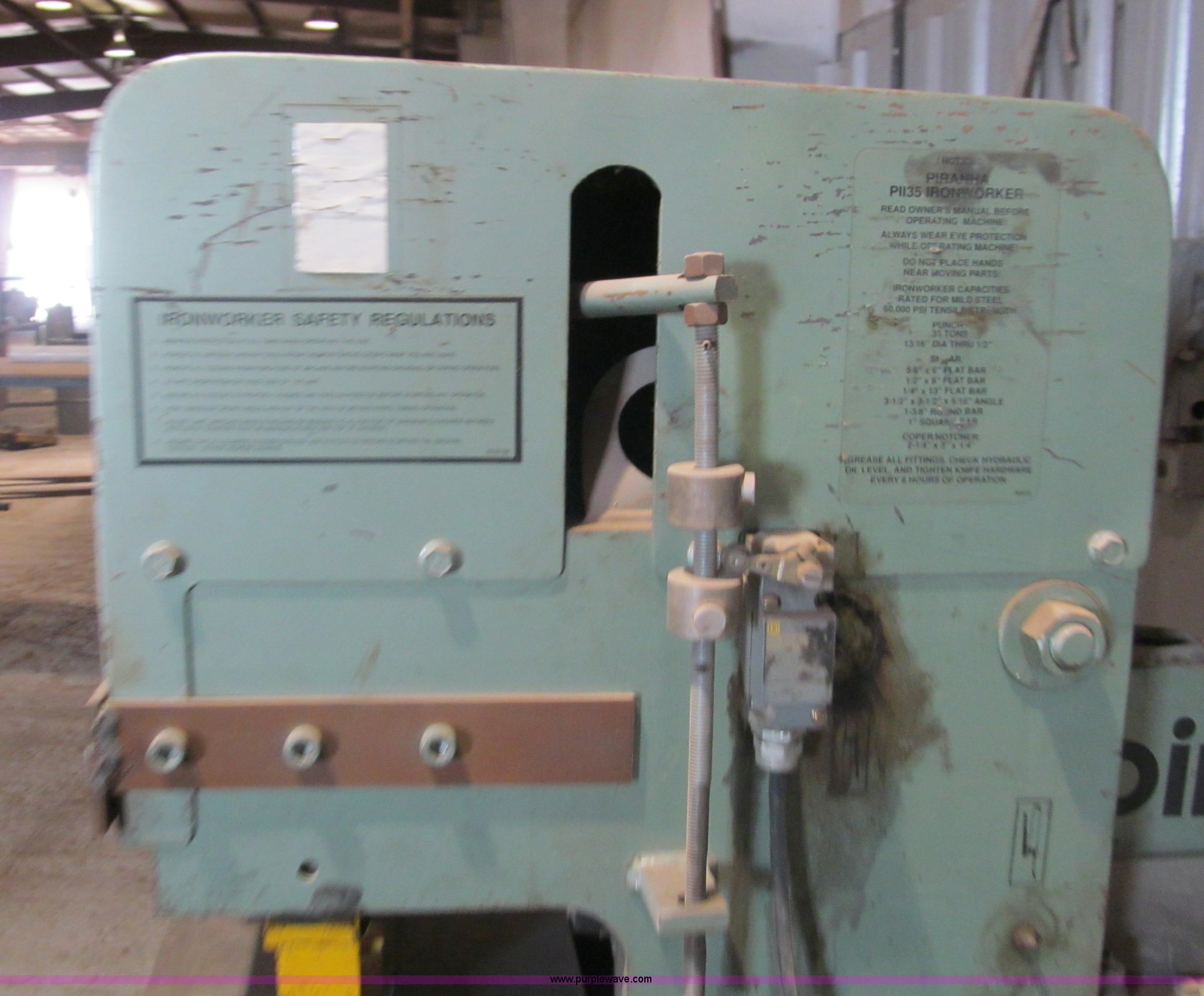 Purple Wave is selling a used Tools in Oklahoma. This item is a Piranna P1135 Iron Worker metal shear and punch press with the following: Foot pump operated, 480V, 5/16" and 3/8" punches included, 35 tons punch, 13/16" diameter through 1/2", Serial PII35