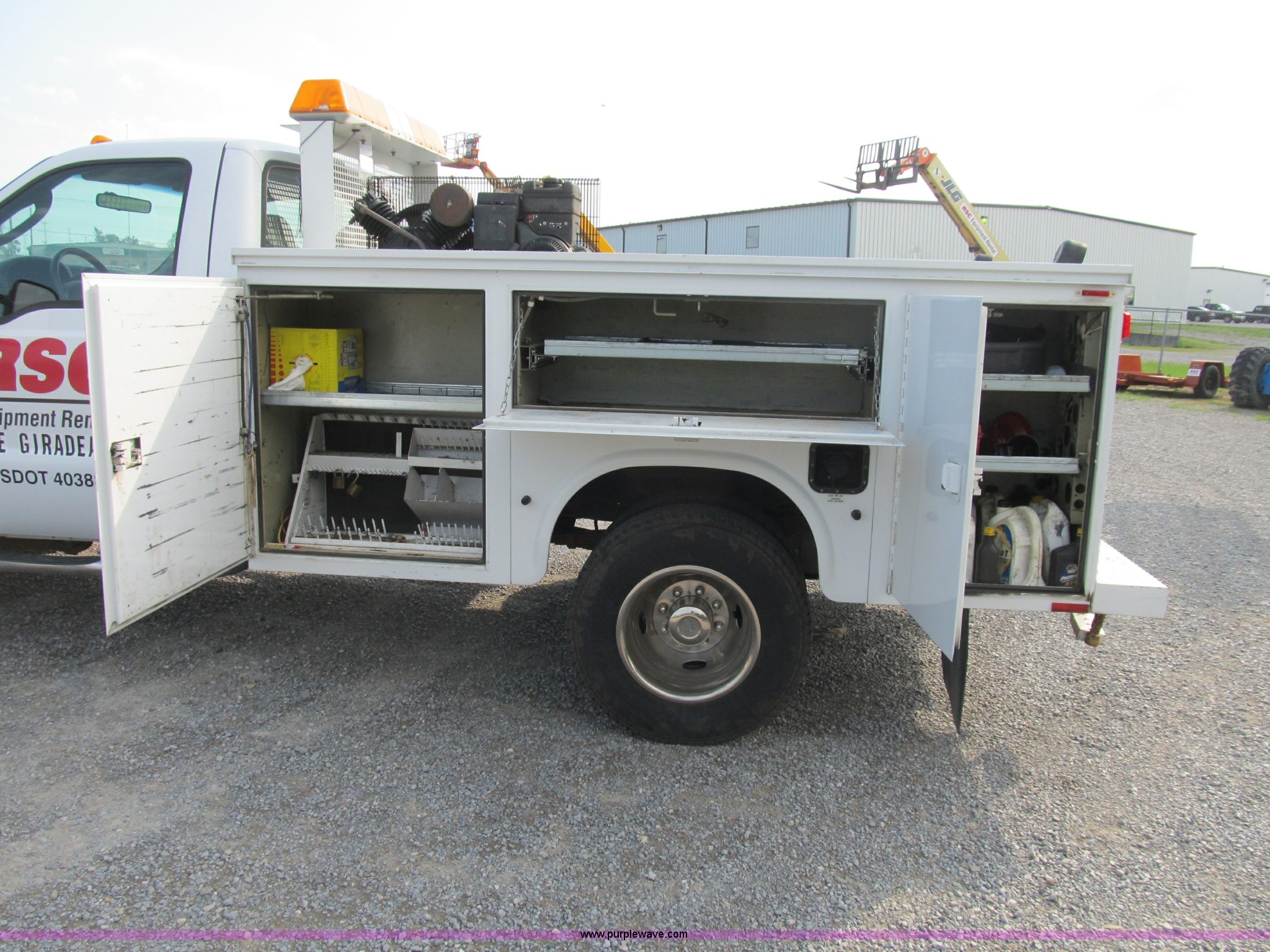 Purple Wave is selling a used Service Truck in Missouri. This item is a 2005 Ford F350 XL Super Duty service truck with the following: 130,336 miles on odometer, Powerstroke 6.0L V8 turbo diesel engine, New engine installed at approx. 110,000 miles, Automatic transmission, Four wheel drive, AC and heat, Tilt, Cruise, Manual windows and locks, Cloth/vinyl interior, Internal controls, Rotating and flashing lights, Rear work lights, Turbo Beam 2000 safety lights, Knapheide utility bed, Model 6108D54FJ40, Serial 098399-20055, Headache rack, 9'L x 54"W between storage areas, (6) storage compartments, Contents not included, Miller BlueStar 185 welder/generator, Kohler 12.75 HP gas engine, 24 hours on meter, CC/DC welder, 6,000 watt generator, Champion air compressor, Model CDEVPA01-HGM3, 8 HP gas engine, 140-170 psig, Hose reel and hose, Rear bumper mounted 5" vise, Rear safety steps, Running boards, Front tow hooks, Receiver hitch, Trailer wiring, Chrome wheels, LT235/80R17 tires, GVWR 13,000 lbs, EIN 560213RA