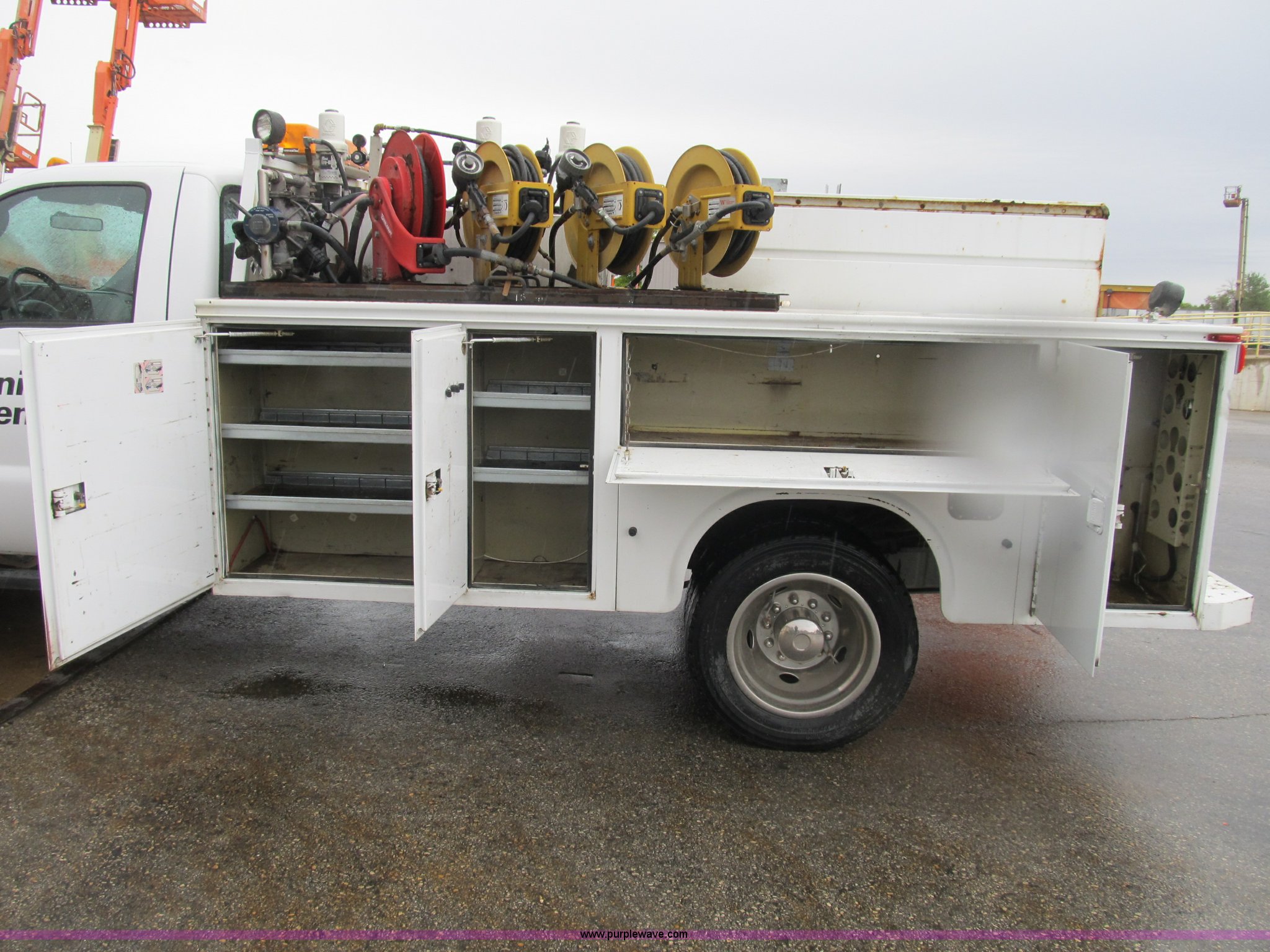 Purple Wave is selling a used Service Truck in Missouri. This item is a 2007 Ford F550 XL Super Duty service truck with the following: 197,994 miles on odometer, Powerstroke 6.0L V8 turbo diesel engine, Automatic transmission, AC and heat, AM/FM, Manual windows and locks, Vinyl interior, Auxiliary lighting controls, Knapheide service bed, 11'L x 8'W, Model 6132D54J, Headache rack, (8) storage compartments, Diamond steel plate, Receiver hitch, Trailer wiring, Additional toolbox mounted in bed, W/W Engineering oil storage tank, Model K135A4, (3) engine/hydraulic oil, Waste oil, Pneumatic pumps, Hose reel assemblies, Morrison suction pump/discharge, (4) rear flood lights, Turbo beam strobe/rotating safety lights, Bug deflector, Running boards, 225/70R19.5 tires, GVWR 19,000 lbs, EIN 894309