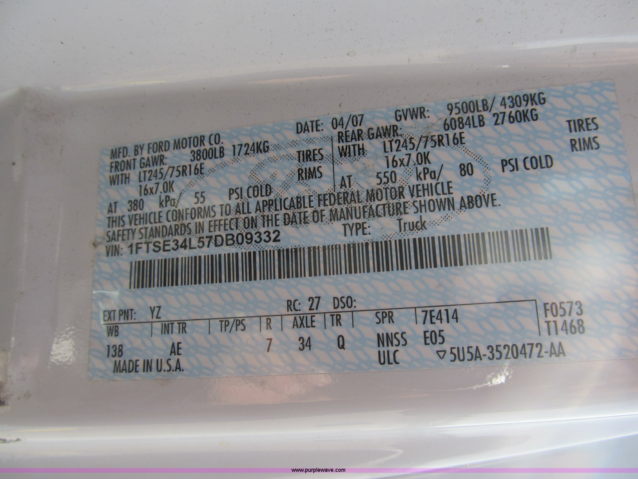 Purple Wave is selling a used 3/4 or 1 Ton Pickup or Van in Illinois. This item is a 2007 Ford Econoline E350 service van with the following: 89,934 miles on odometer, 5.4L V8 EFI gas engine, Automatic transmission, AC and heat, Tilt, Cruise, AM/FM, Power windows, locks, and mirrors, Vinyl interior, Rear and side door access, Rear storage shelving, 112"L floor space, 6'11"H body, Rear tinted windows, Rear safety bars, Backup alarm, LT245/75R16 tires, GVWR 9,500 lbs, Minor exterior damage, EIN 1003616