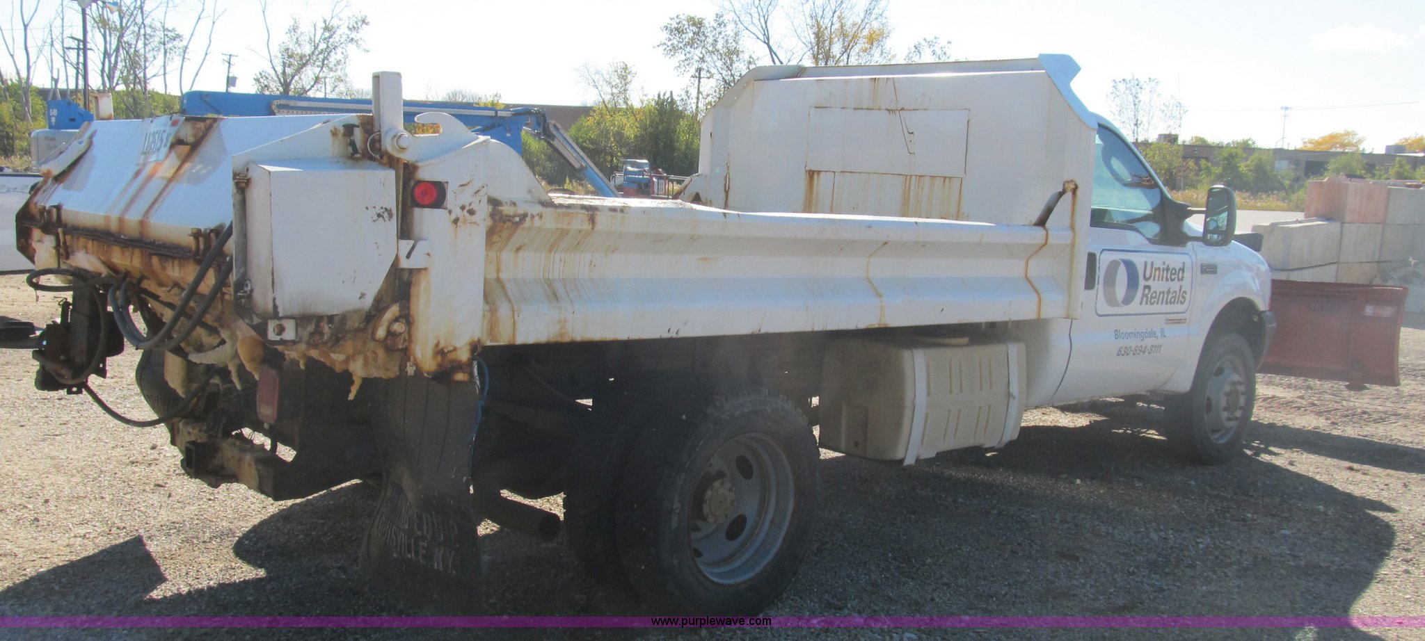 2004 Ford F550 XL Super Duty pickup truck. 17,731 actual miles, Powerstroke 6.0L V8 turbo diesel engine, Automatic transmission, Four wheel drive, AC and heat, AM/FM, Tilt, Cruise, Manual windows and locks, Vinyl and cloth interior, In-cab spreader controls Salt and sand, Blade, TJ series handheld remote controls, Western front snow plow attachment 9' Pro Plow, Western Ultra mount assembly, Safety chains, Hydraulics, Bolt-on cutting edge, Steel frame dump bed 11'L x 8'W x 12"H, 7' auger with side discharge, Headache rack, Receiver hitch, Trailer wiring, 225/70R19.5 tires, GVWR 17,500 lbs, RAWR 13,500 lbs, Bed will be cleaned out prior to sale, Vehicle only used on seller's property, EIN 553400. 1FDAF57P24EA31161. Shipping quotes available. United Rentals - Addison. 225 S Fairbank St. Addison, IL 60101