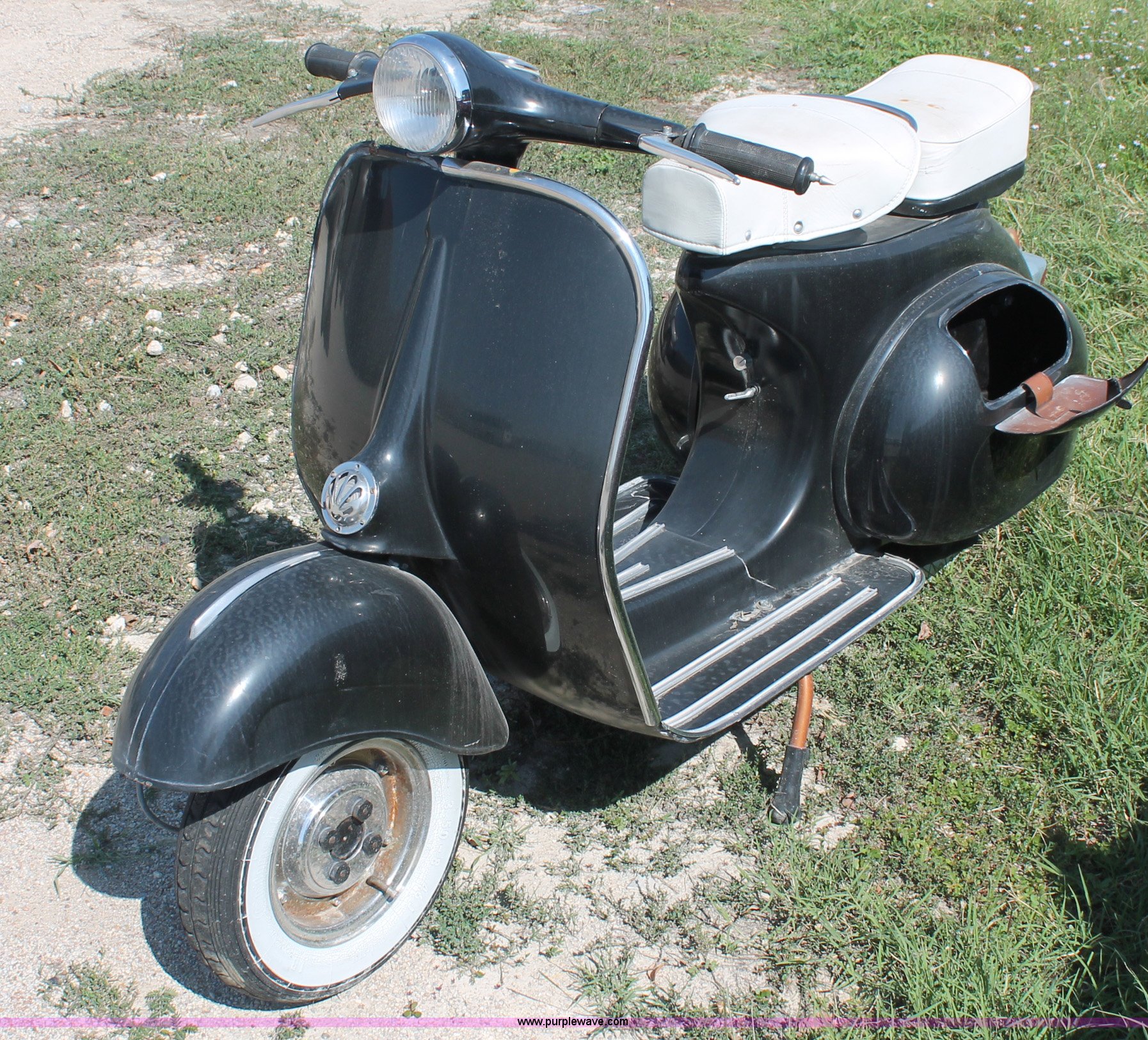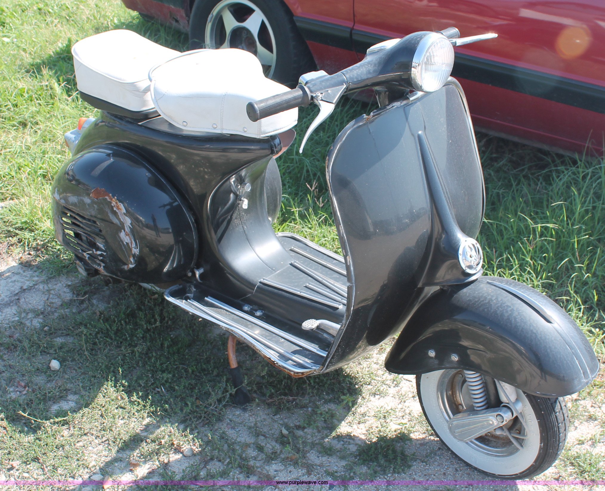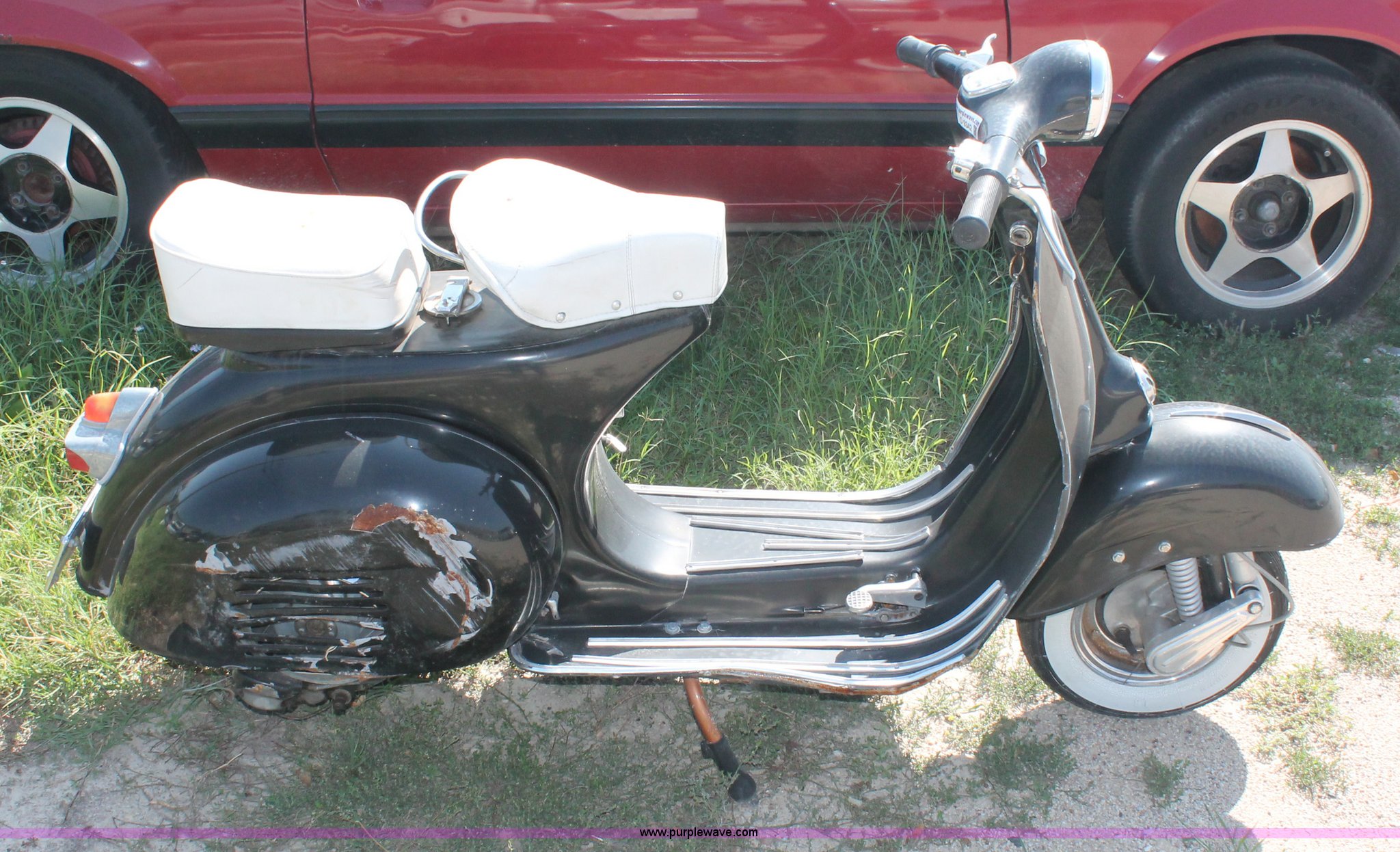 Purple Wave is selling a used Wrecked and Abandoned in Kansas. This item is a 1961 Vespa moped with the following: 2,596 km on odometer, Not Actual Mileage, Gas engine, Automatic transmission, Leather seat, Storage compartment, Keys, 3.50-8 tires, Unknown running condition