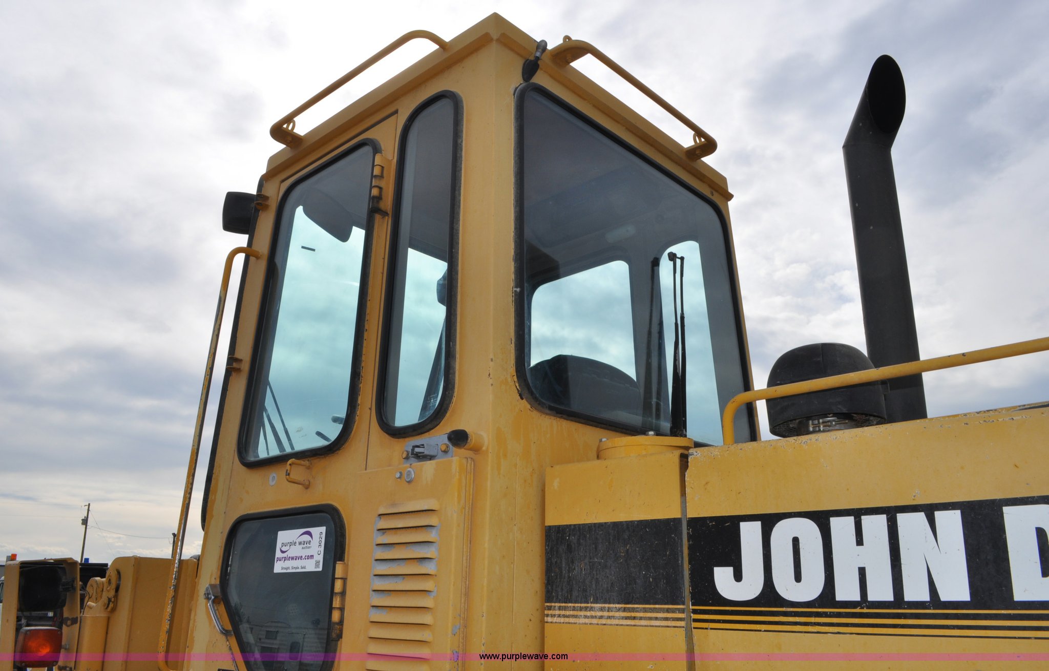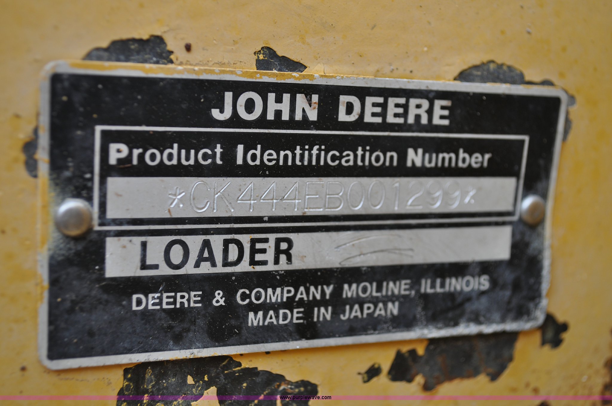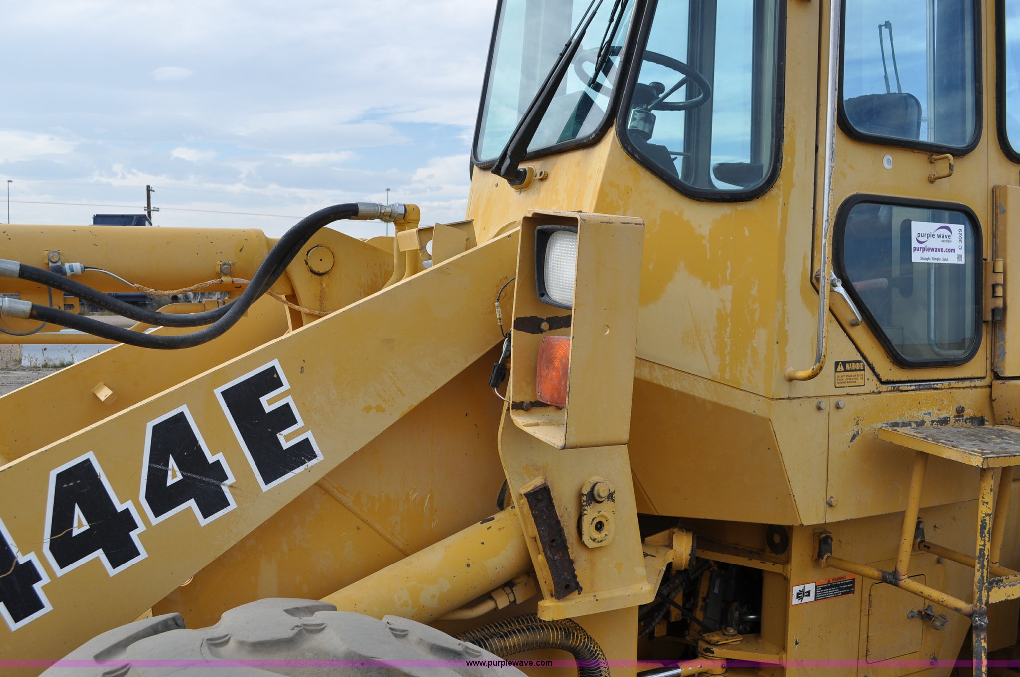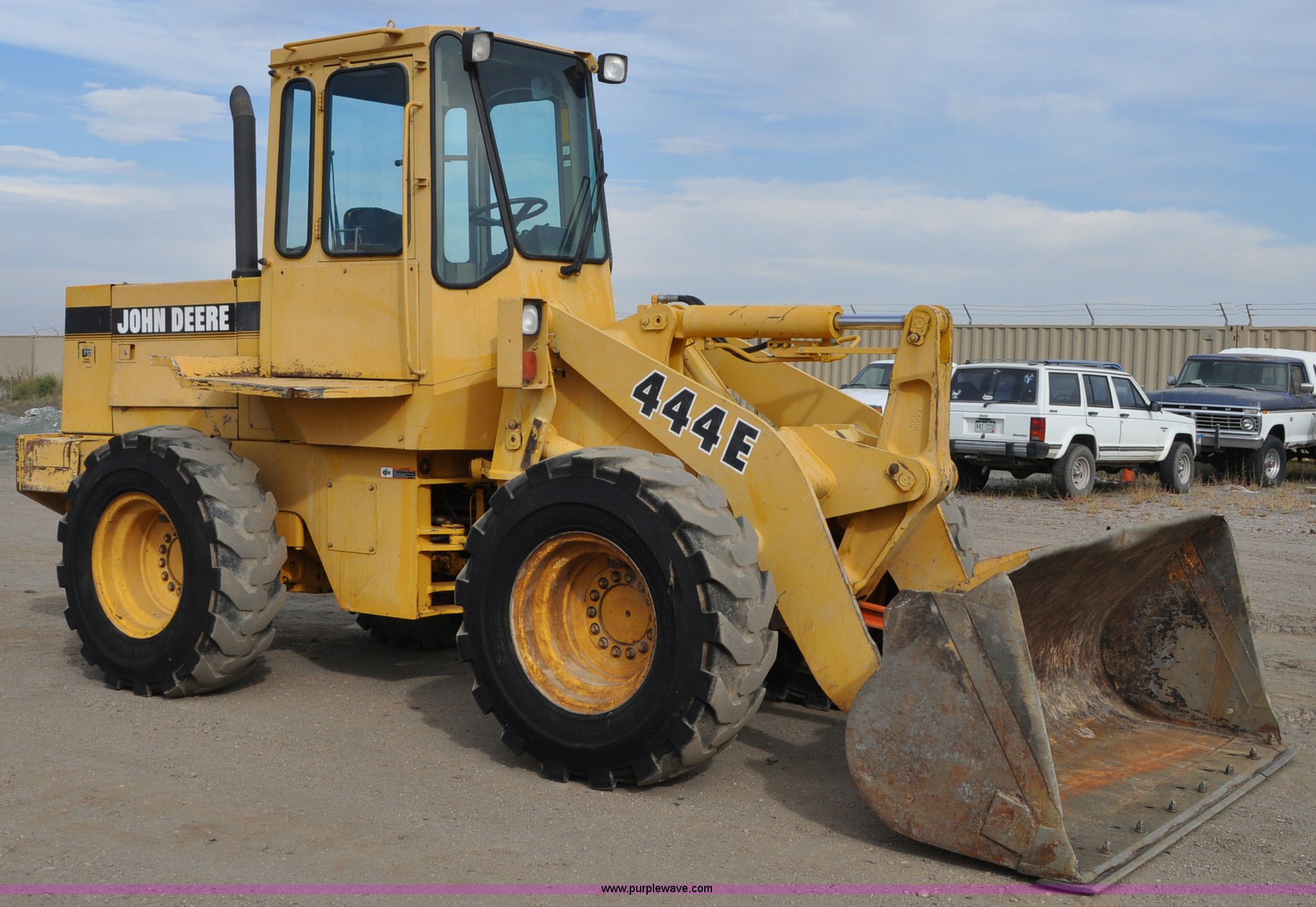 Purple Wave is selling a used Wheel Loader in Colorado. This item is a 1988 John Deere 444E articulated wheel loader with the following: 19,433 hours on meter, John Deere 4045TT four cylinder turbo engine, 95 HP, Serial T04045T388038, Two speed shuttle shift transmission, Enclosed cab, Heat, AM/FM, Joystick bucket control, Work lights, 93" bucket, 1.75 cu. yd. capacity, Bolt-on edge, 17.5-25 tires, 21,064 lbs. base operating weight, Serial CK444EB00129