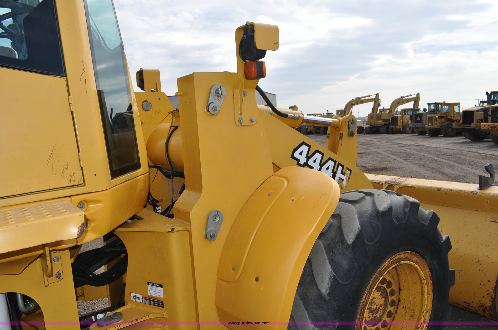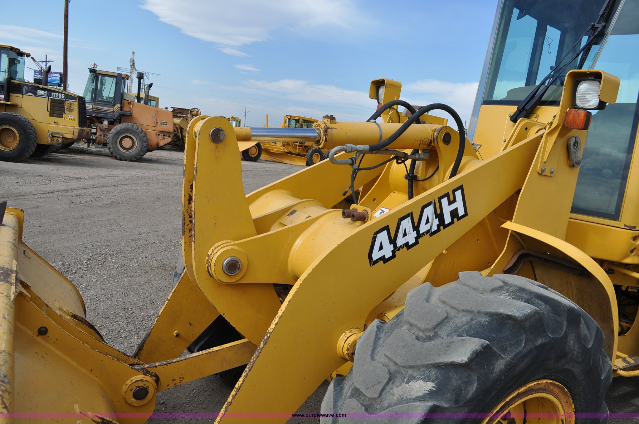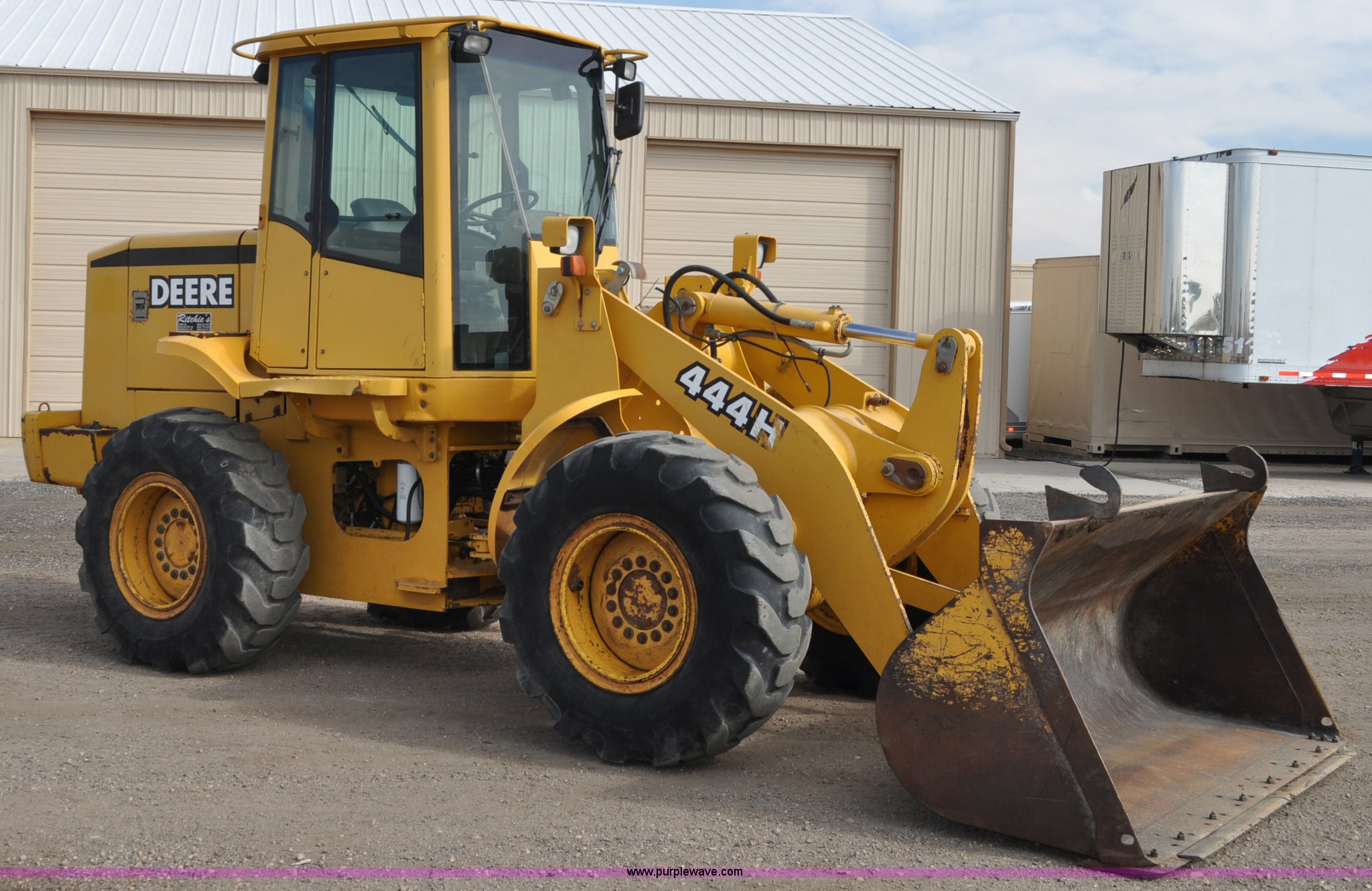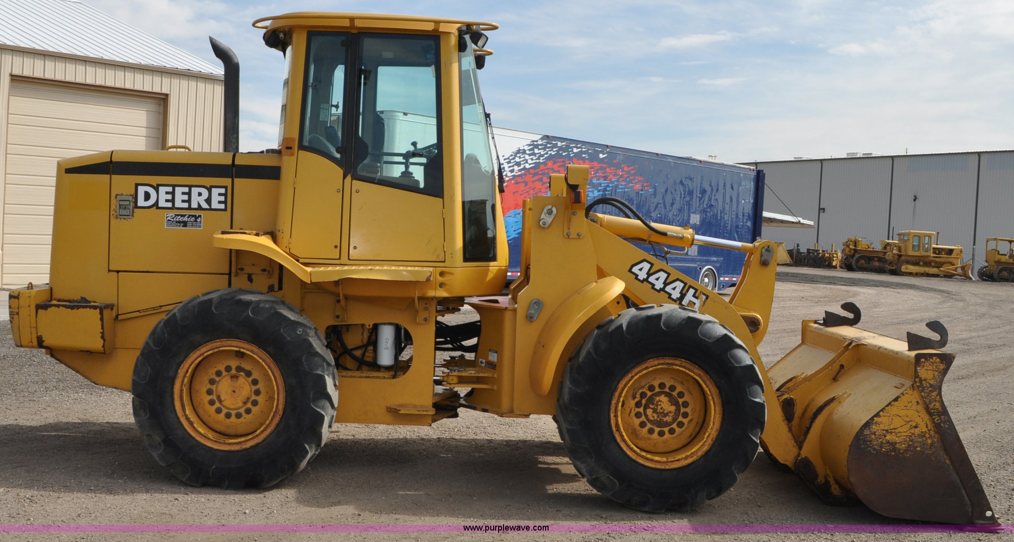 Purple Wave is selling a used Wheel Loader in Colorado. This item is a 2000 John Deere 444H wheel loader with the following: 14,855 hours on meter, John Deere 4045 turbo diesel engine, 110 HP, Serial T04045T844113, Four speed shuttle shift transmission, Enclosed cab, AC and heat, Suspension seat, Tilt steering wheel, Joystick loader control, Work lights, Front and rear windshield wipers, 94" bucket, 2.5 cu. yd. capacity, Bolt-on edge, 17.5-25 tires, 21,457 lbs. base operating weight, Serial DW444HX575579