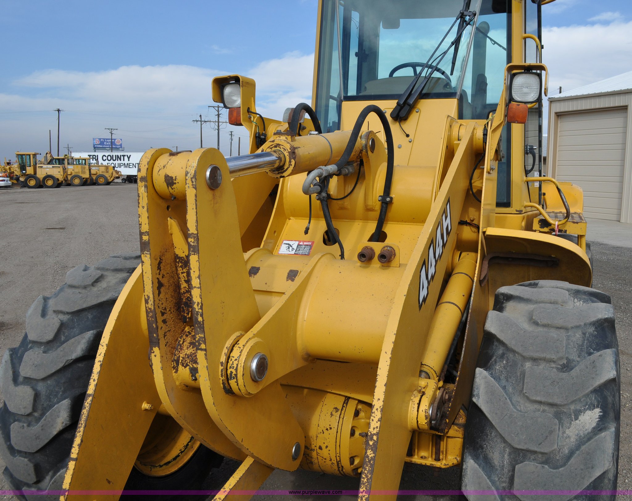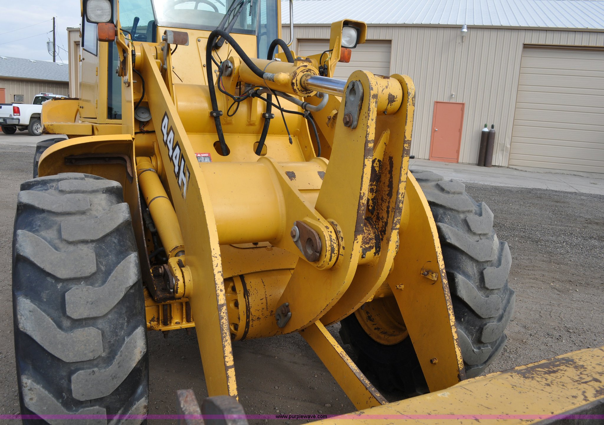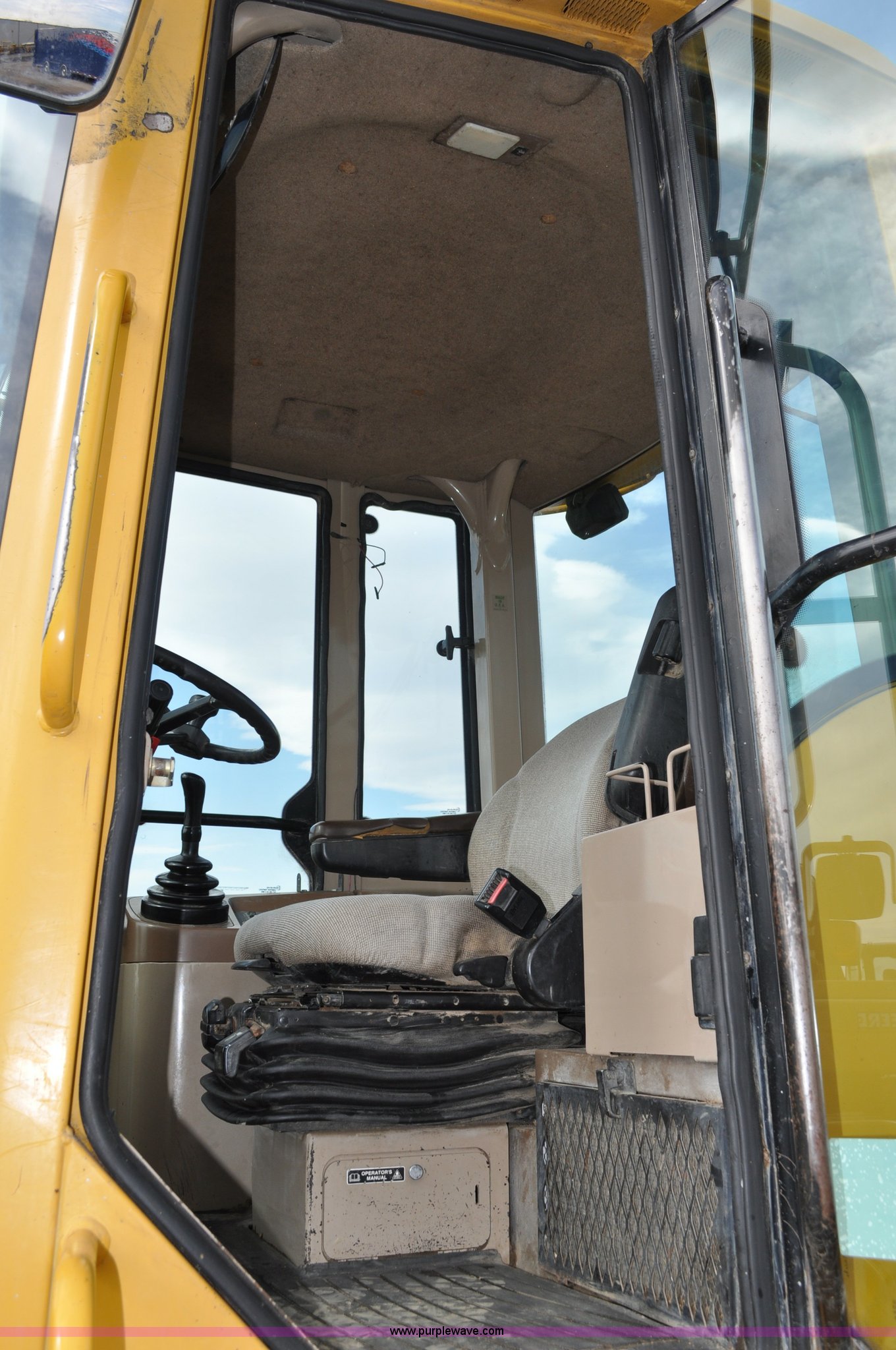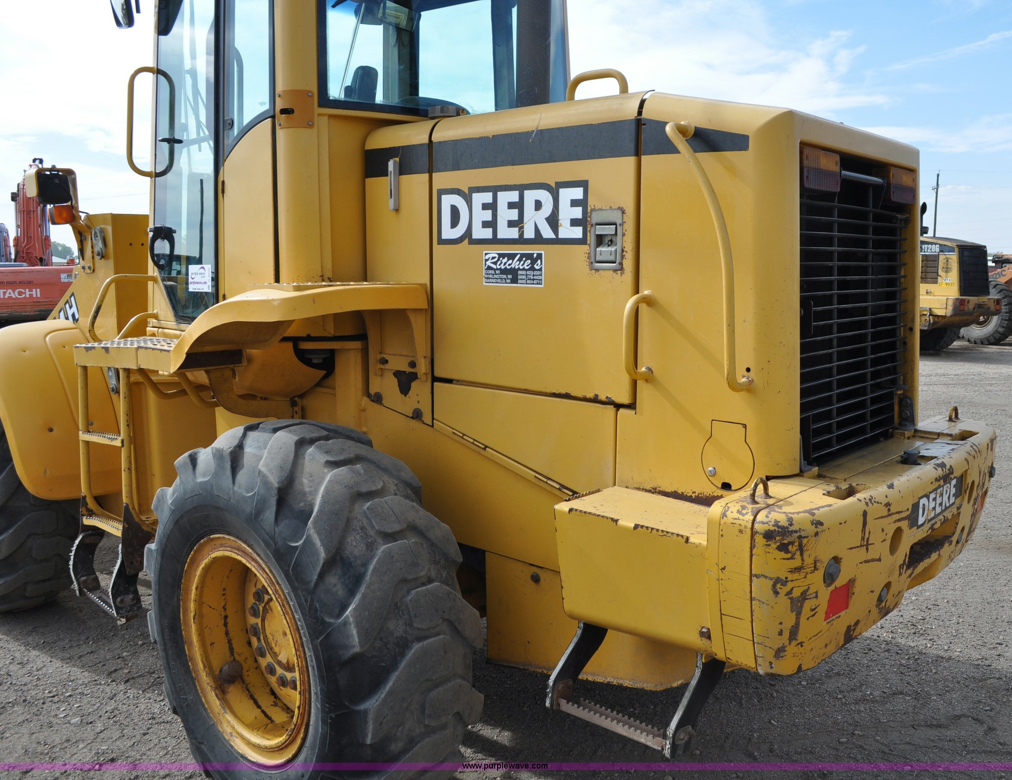 Purple Wave is selling a used Wheel Loader in Colorado. This item is a 2000 John Deere 444H wheel loader with the following: 14,855 hours on meter, John Deere 4045 turbo diesel engine, 110 HP, Serial T04045T844113, Four speed shuttle shift transmission, Enclosed cab, AC and heat, Suspension seat, Tilt steering wheel, Joystick loader control, Work lights, Front and rear windshield wipers, 94" bucket, 2.5 cu. yd. capacity, Bolt-on edge, 17.5-25 tires, 21,457 lbs. base operating weight, Serial DW444HX575579