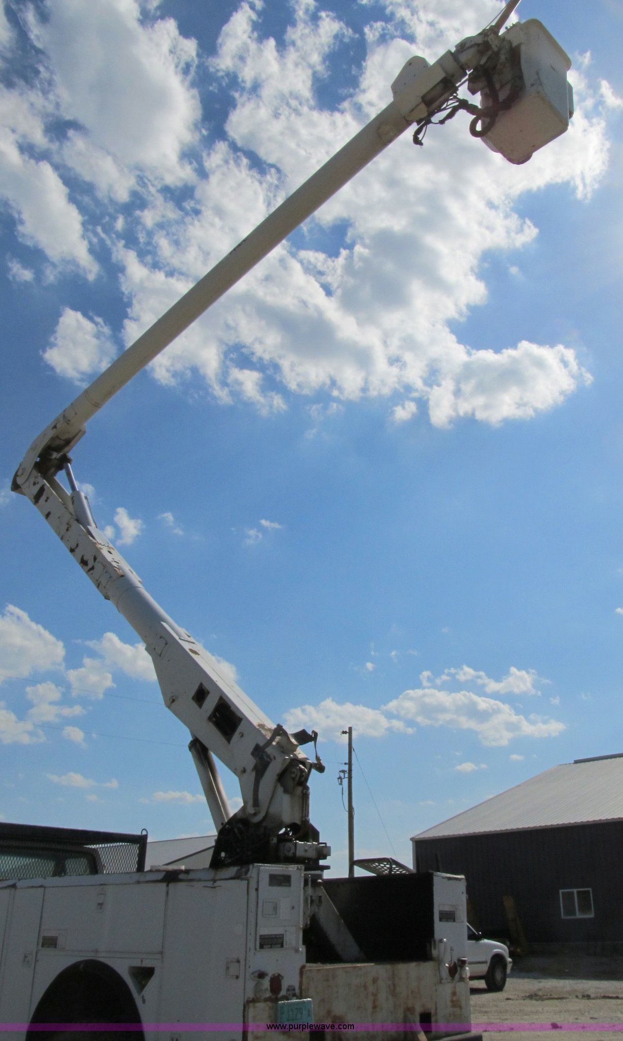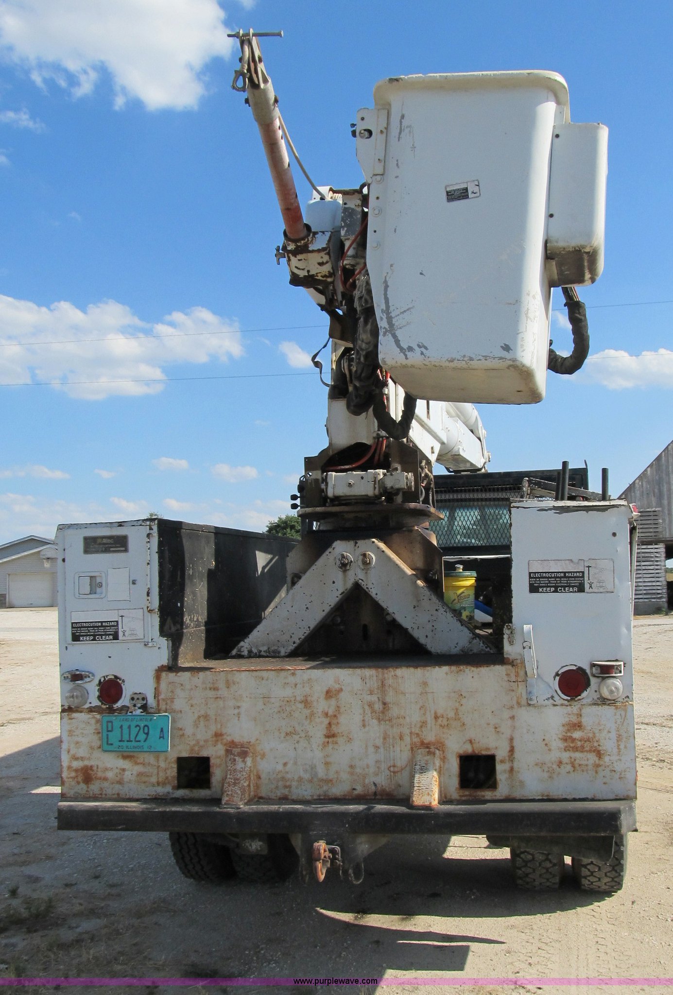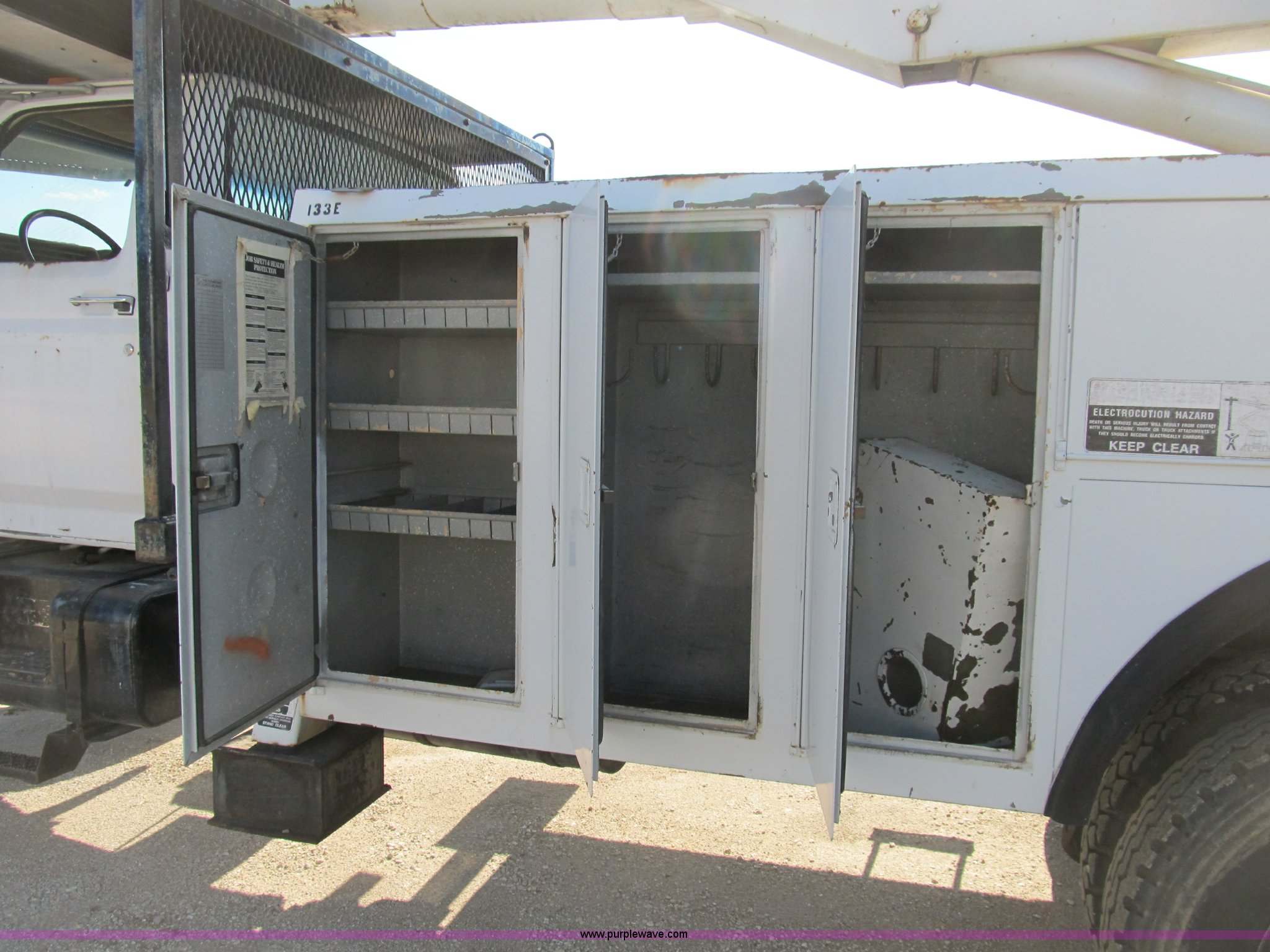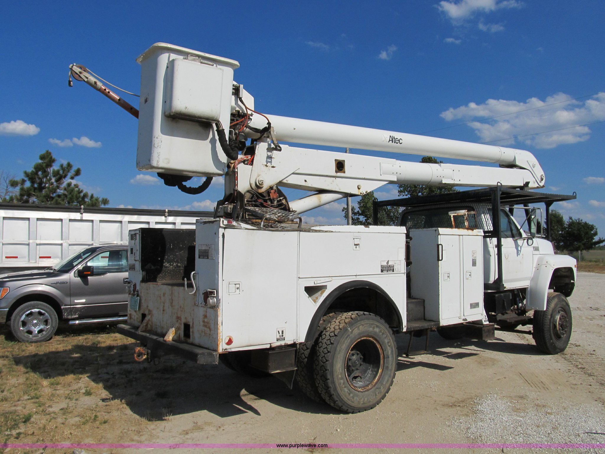 Purple Wave is selling a used Bucket Truck in Illinois. This item is a 1989 Ford F800 bucket truck with the following: 60,949 miles on odometer, Ford 6.8L six cylinder diesel engine, 170 HP, Five speed manual transmission, Four wheel drive, Heater, Manual windows and locks, Altec 13' utility bed, Serial 17-42656, (9) storage areas, 57"W floor space beween storage areas, Headache rack with cab safety shield, Front and rear outriggers, Altec AA600 bucket and boom, 300 lb capacity, 50' max platform height, 3' material handling jib on lift, Upper and lower controls,, PTO driven hydraulics, Pintle hitch, 50 gallon fuel tank, Air brakes, 10.00-20 tires, Front bumper damage, Boom hydraulic fluid leaks, Vehicle vibrates at 35 to 45 mph from uncertain condition, Levels out at higher speeds