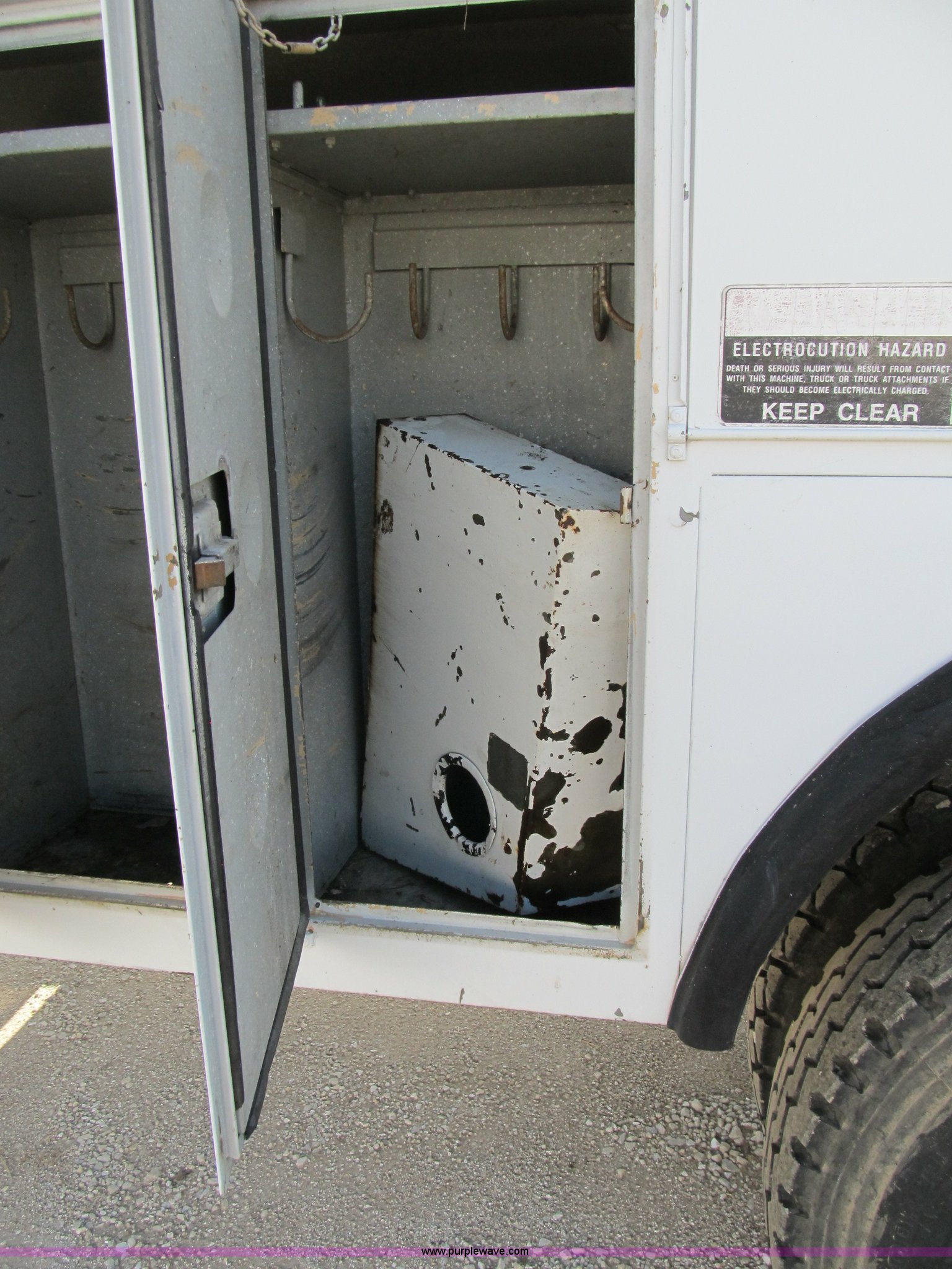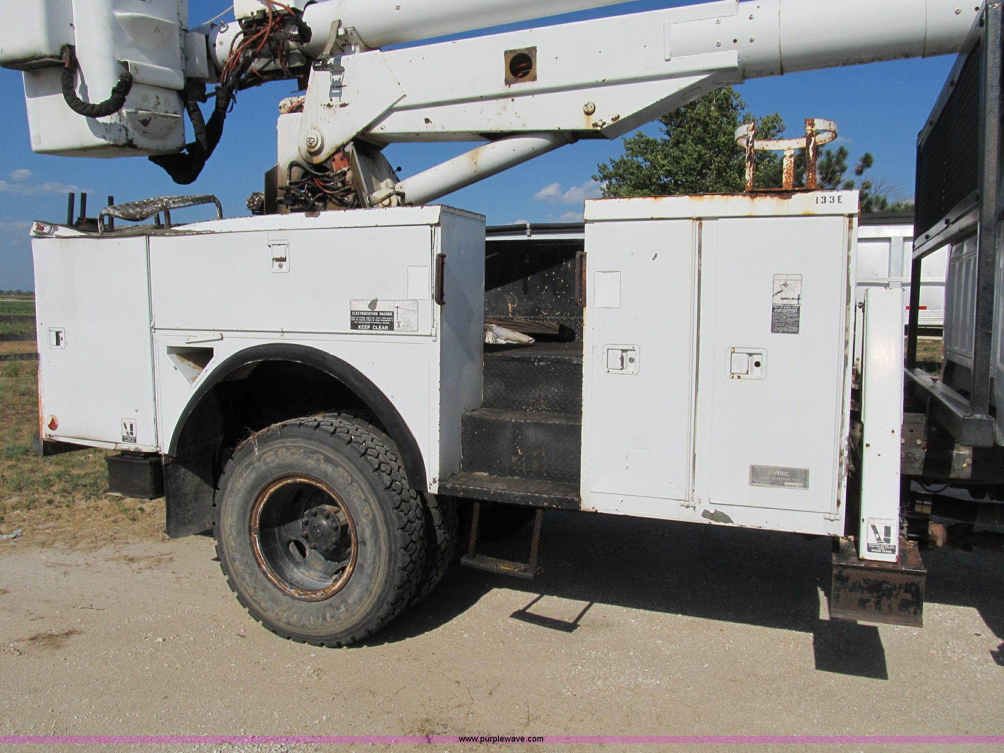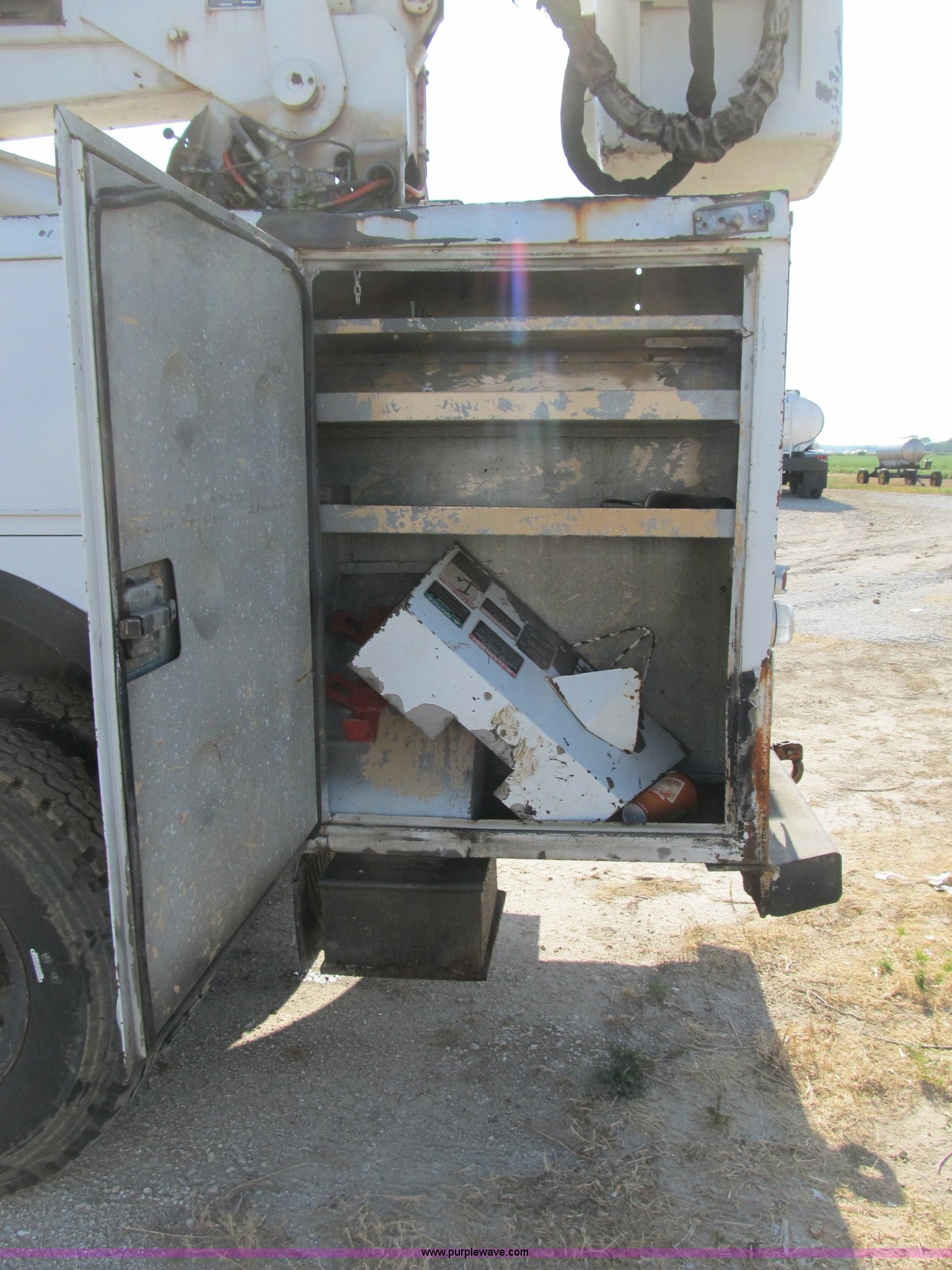 Purple Wave is selling a used Bucket Truck in Illinois. This item is a 1989 Ford F800 bucket truck with the following: 60,949 miles on odometer, Ford 6.8L six cylinder diesel engine, 170 HP, Five speed manual transmission, Four wheel drive, Heater, Manual windows and locks, Altec 13' utility bed, Serial 17-42656, (9) storage areas, 57"W floor space beween storage areas, Headache rack with cab safety shield, Front and rear outriggers, Altec AA600 bucket and boom, 300 lb capacity, 50' max platform height, 3' material handling jib on lift, Upper and lower controls,, PTO driven hydraulics, Pintle hitch, 50 gallon fuel tank, Air brakes, 10.00-20 tires, Front bumper damage, Boom hydraulic fluid leaks, Vehicle vibrates at 35 to 45 mph from uncertain condition, Levels out at higher speeds