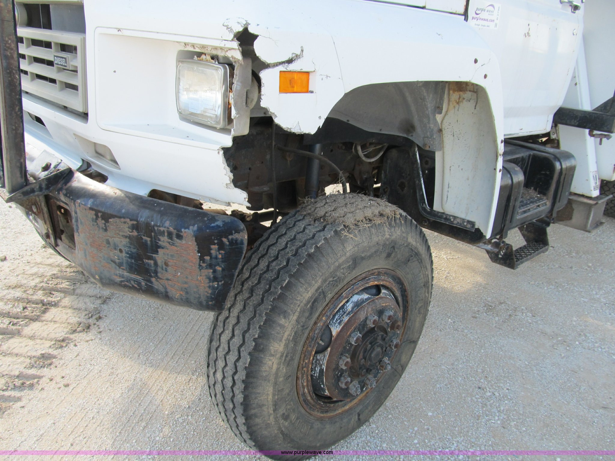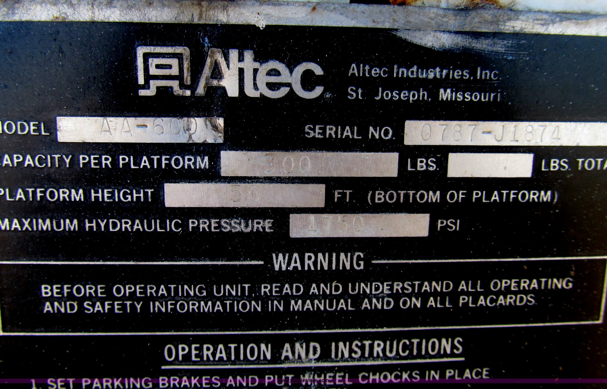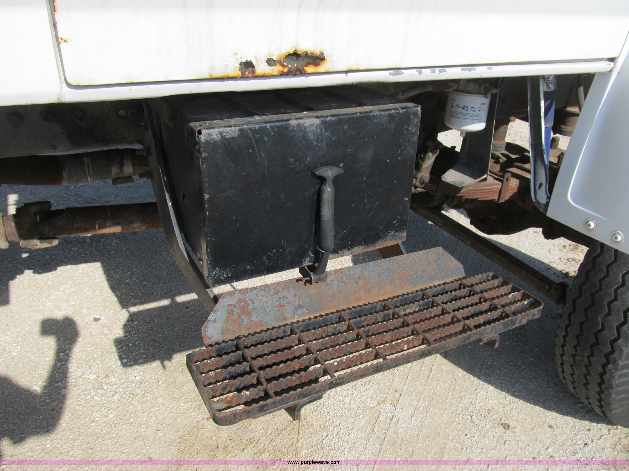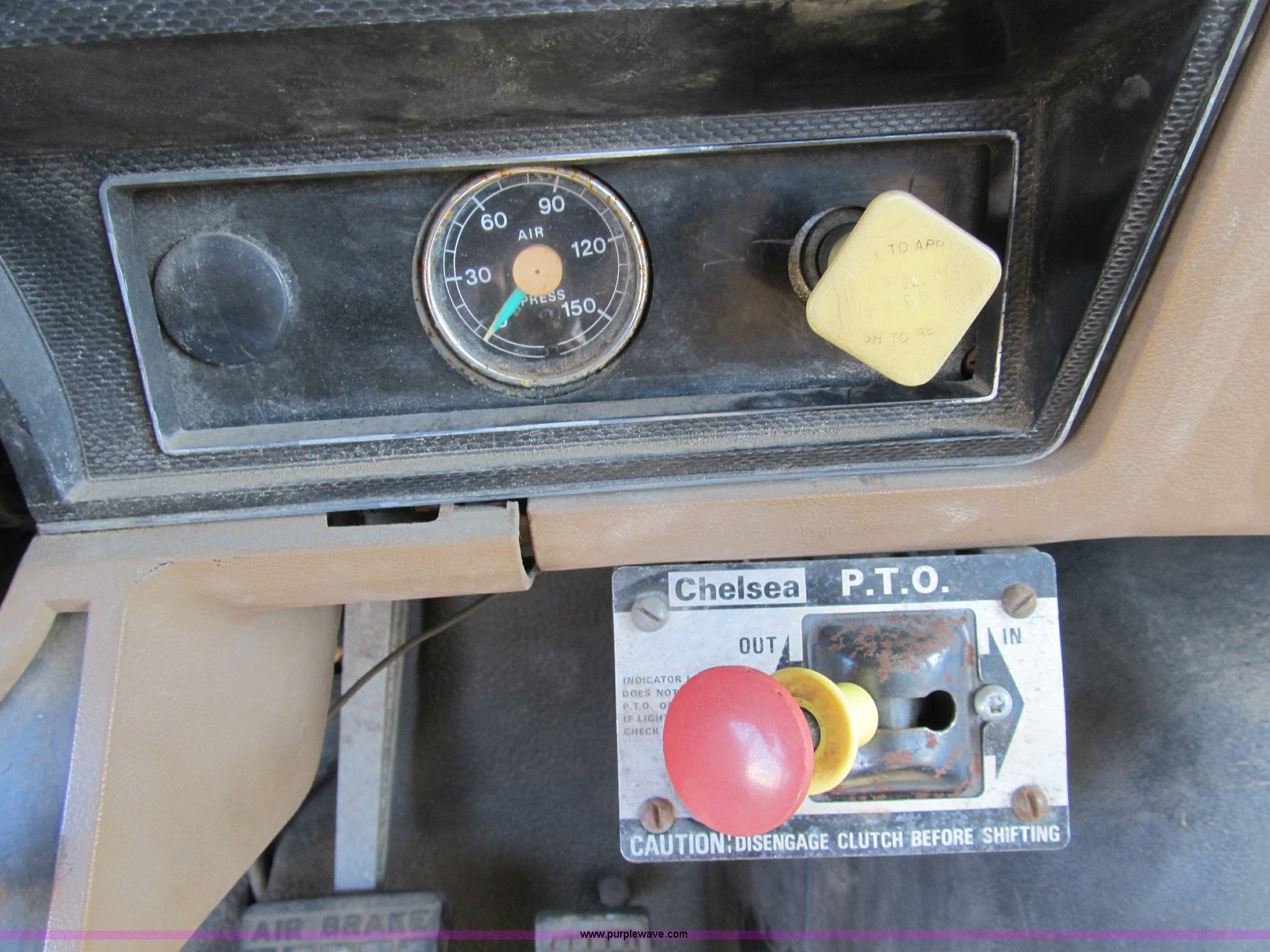 Purple Wave is selling a used Bucket Truck in Illinois. This item is a 1989 Ford F800 bucket truck with the following: 60,949 miles on odometer, Ford 6.8L six cylinder diesel engine, 170 HP, Five speed manual transmission, Four wheel drive, Heater, Manual windows and locks, Altec 13' utility bed, Serial 17-42656, (9) storage areas, 57"W floor space beween storage areas, Headache rack with cab safety shield, Front and rear outriggers, Altec AA600 bucket and boom, 300 lb capacity, 50' max platform height, 3' material handling jib on lift, Upper and lower controls,, PTO driven hydraulics, Pintle hitch, 50 gallon fuel tank, Air brakes, 10.00-20 tires, Front bumper damage, Boom hydraulic fluid leaks, Vehicle vibrates at 35 to 45 mph from uncertain condition, Levels out at higher speeds