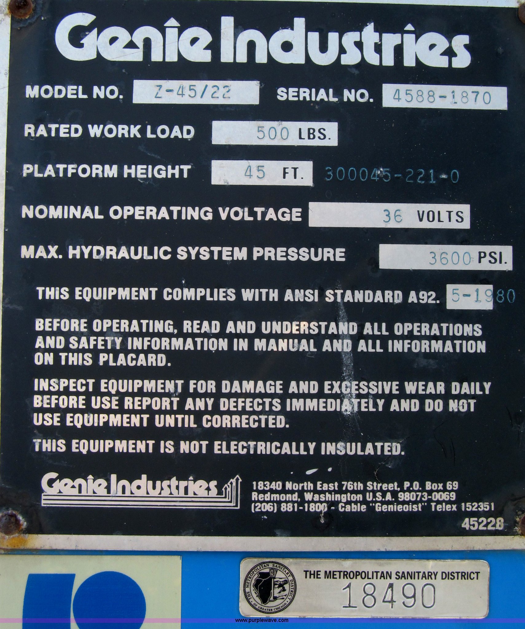 Purple Wave is selling a used Boom Lift in Illinois. This item is a Genie Z45/22 articulated electric boom lift with the following: 615 hours on meter, 36v, Built-in charger, (12) batteries, 45'H platform max, 500 lb rated load capacity, Power to platform, Ground and bucket controls, Recently replaced control board, 9-14.5SLT tires, GVW 13,000 lbs, Serial 45881870