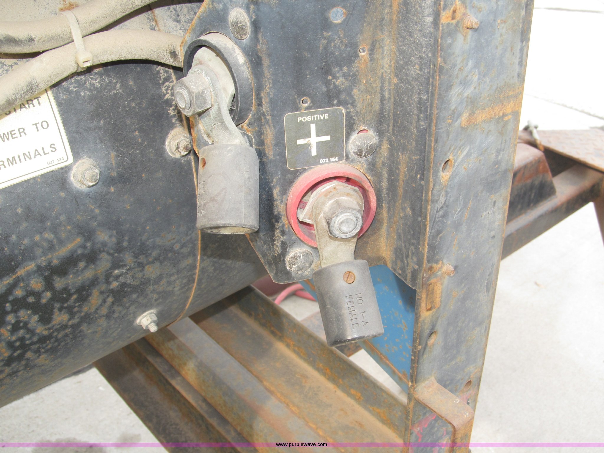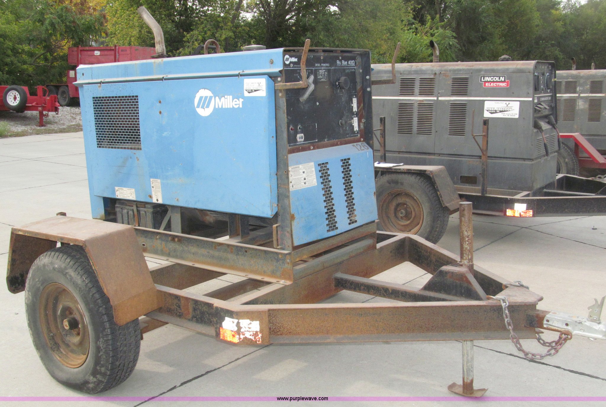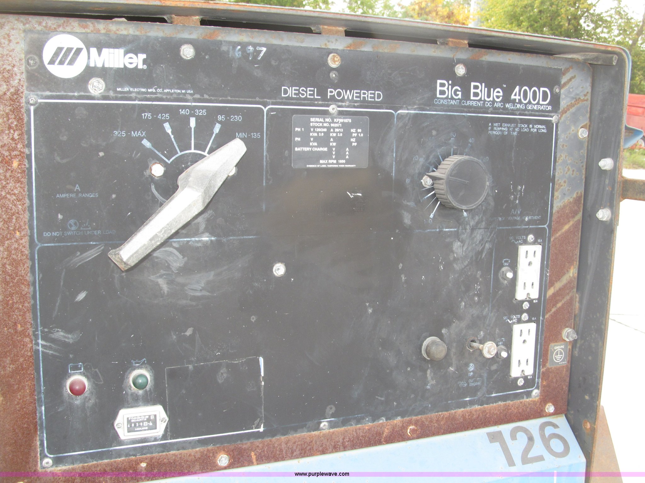 Purple Wave is selling a used Welder (Manual) in Nebraska. This item is a Miller Big Blue 400D portable welder/generator with the following: 4,040 hours on meter, Hours may vary, Deutz three cylinder diesel engine, 400 amps at 100% duty cycle, Welding range 45 to 500 amps, 1,850 RPM max, 12v battery, Front mount cable hangers, Tweco connector, Ground adapter on console, Lifting eye, 2" ball hitch, 2" rear ball hitch, Drain plug with hose extension/coupler for field service, P235/75R15 tires, Approx. 9.5'L x 9.75'W x 6'H overall, Operational, Frame and fender rust, Serial KF991075, EIN 126