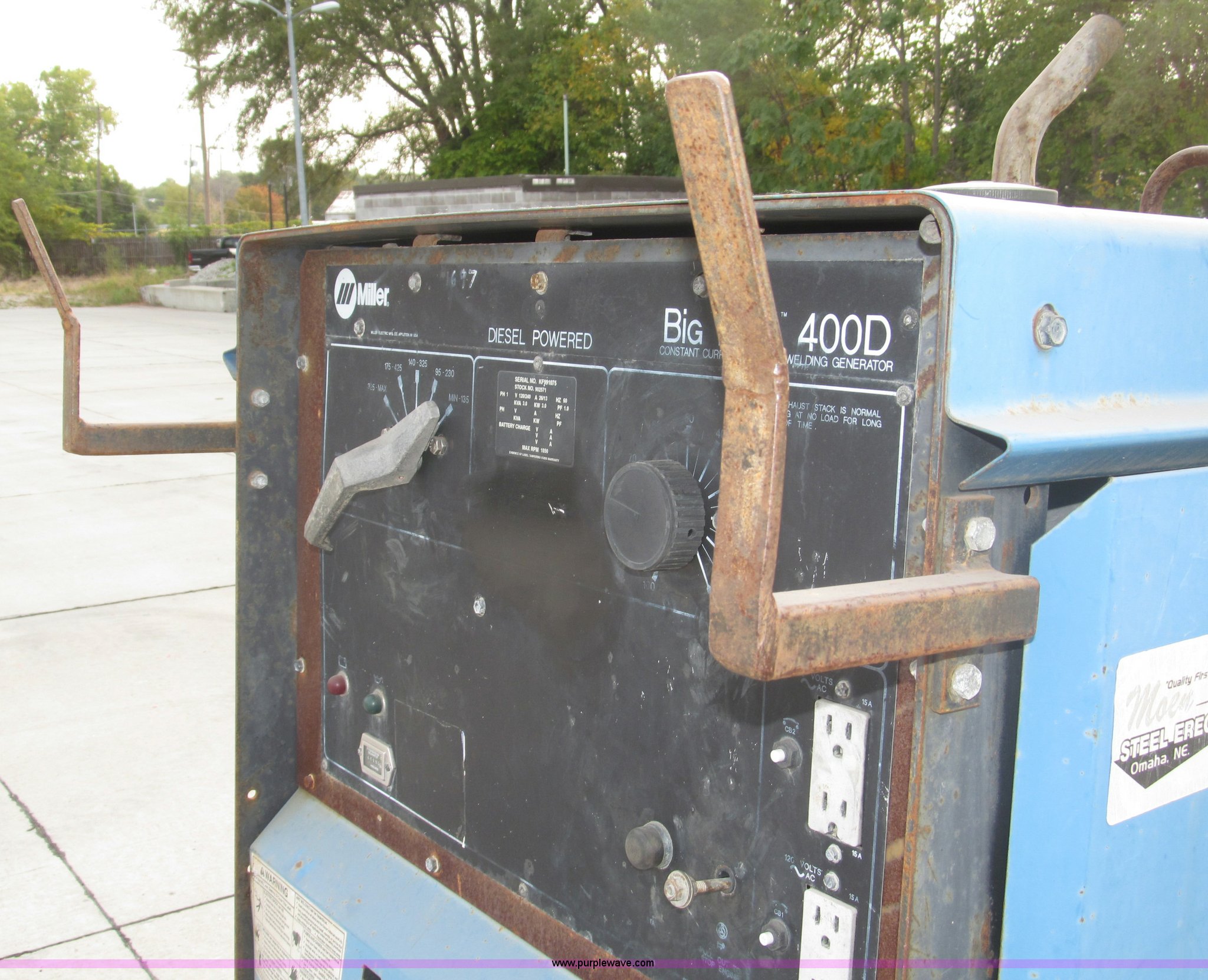 Miller Big Blue 400D portable welder/generator. 4,040 hours on meter Hours may vary, Deutz three cylinder diesel engine, 400 amps at 100% duty cycle, Welding range 45 to 500 amps, 1,850 RPM max, 12v battery, Front mount cable hangers, Tweco connector, Ground adapter on console, Lifting eye, 2" ball hitch, 2" rear ball hitch, Drain plug with hose extension/coupler for field service, P235/75R15 tires, Approx. 9.5'L x 9.75'W x 6'H overall, Operational, Frame and fender rust, Serial KF991075, EIN 126. Manufacturers Specifications. View equipment video. Shipping quotes available. Moen Steel Erection. 4115 Lake St. Omaha, NE 68111