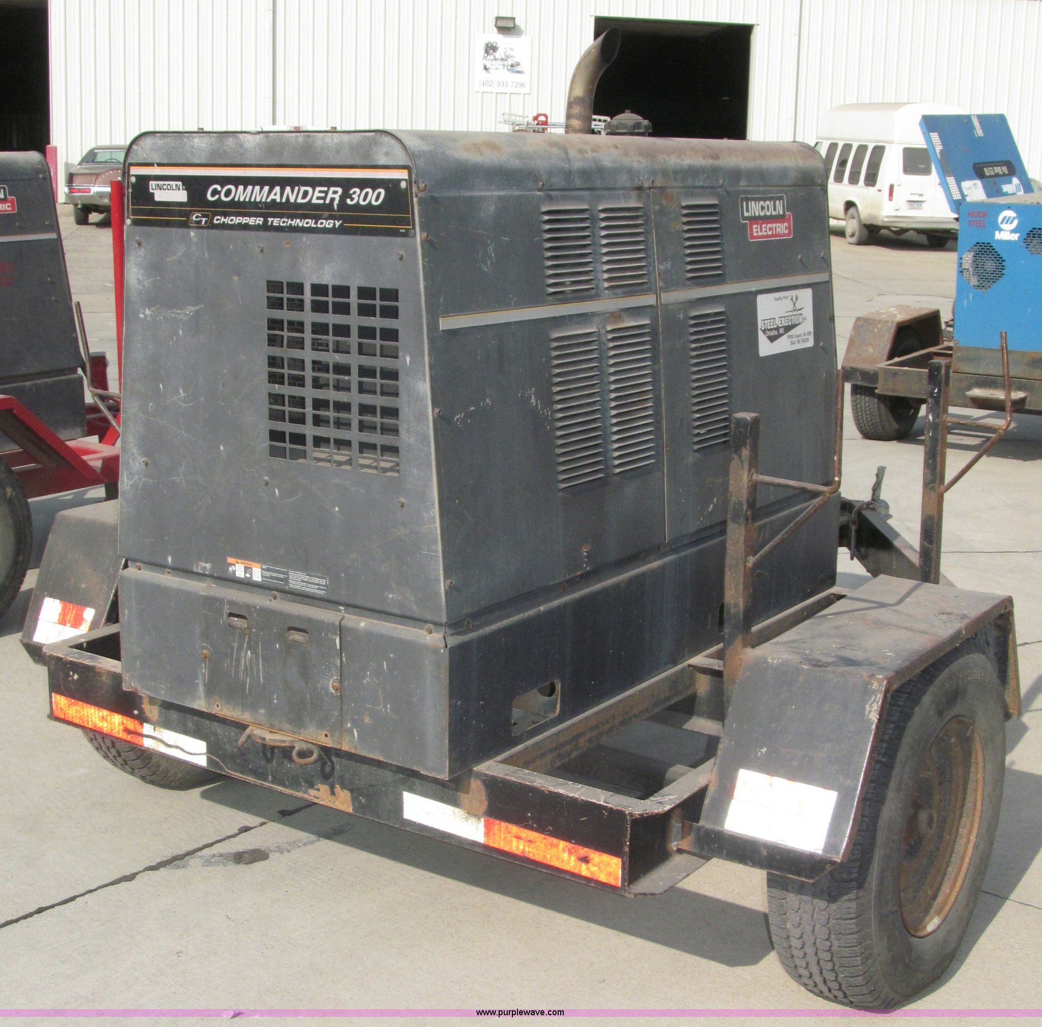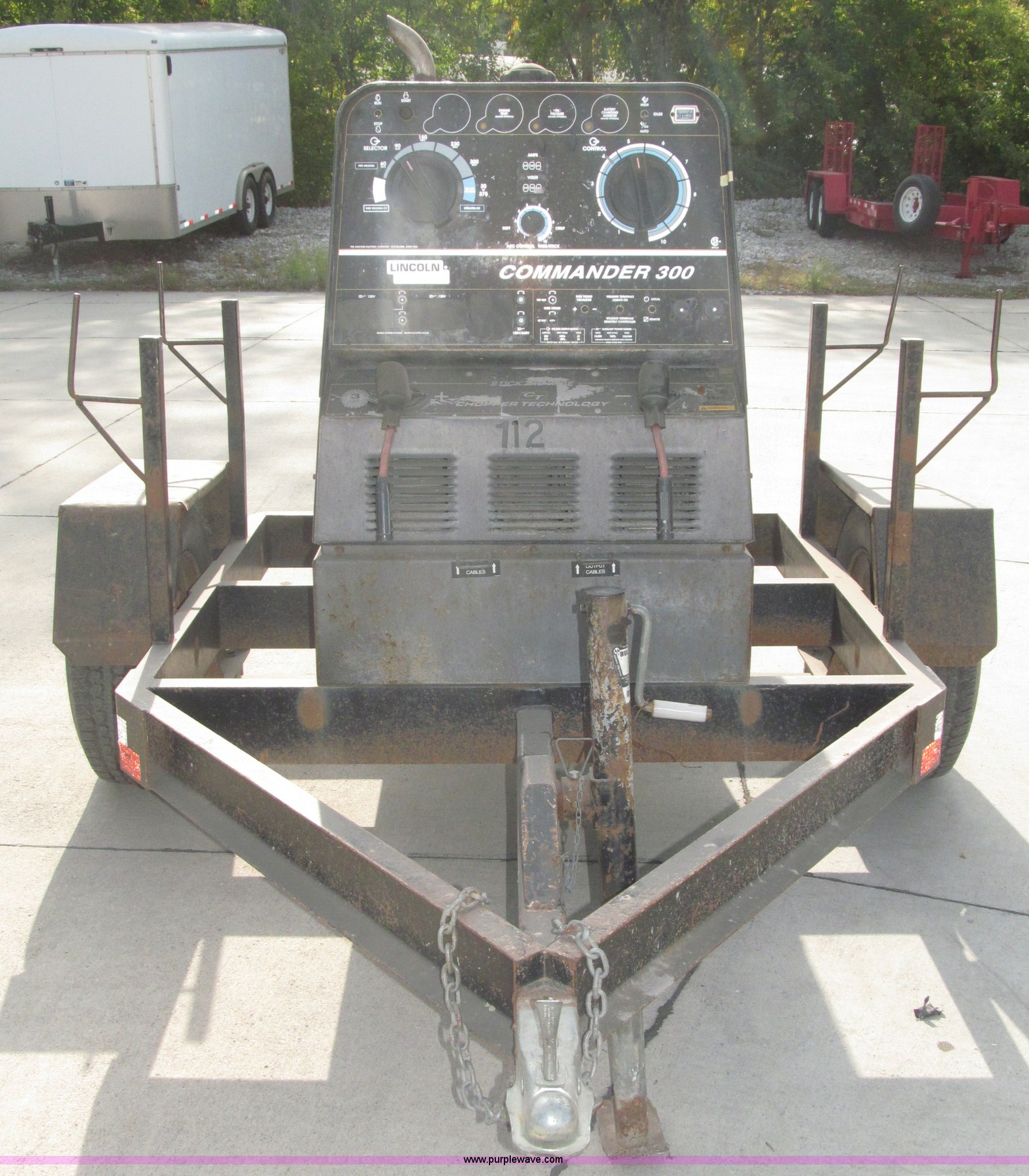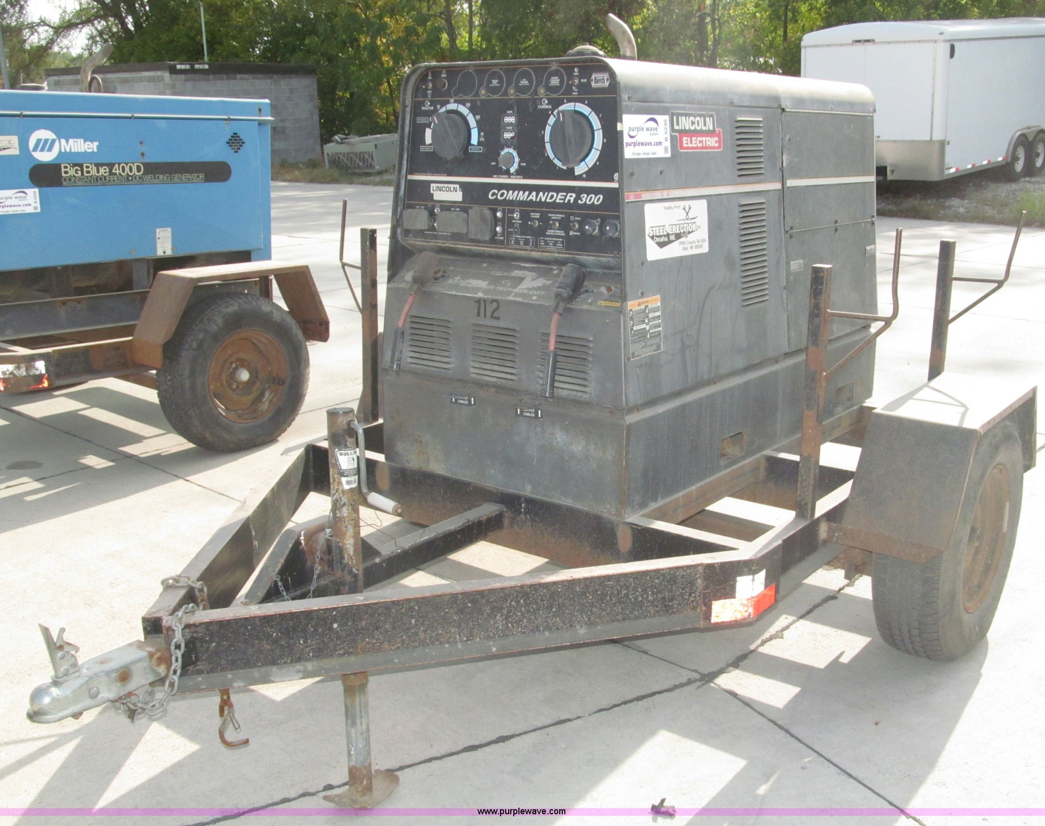 Purple Wave is selling a used Welder (Manual) in Nebraska. This item is a Lincoln Electric Commander 300 portable welder/generator with the following: 8,187 hours on meter, Hours may vary, Deutz three cylinder diesel engine, Stick/TIG - CC and wire welding, 300 amp DC at 100% duty cycle, 375 amp DC at 60% duty cycle, 10,000 watt generator, Wire feeder volt meter, (2) remote connector receptacles, Ground adapter on console, Tweco adapters, Cable hangers, One bent, Lifting eye, Fork pockets, (2) 110v outlets, One damaged, 125/250v 50 amp outlet, Drain plug with hose extension/coupler for field service, 2" ball hitch, (2) safety chains, Rear hitch/chains, Unusable due to welder placement on frame, Approx. 9'7"L x 6'9"W x 70"H overall, P235/75R15 tires, Serial U1990702950, EIN 112