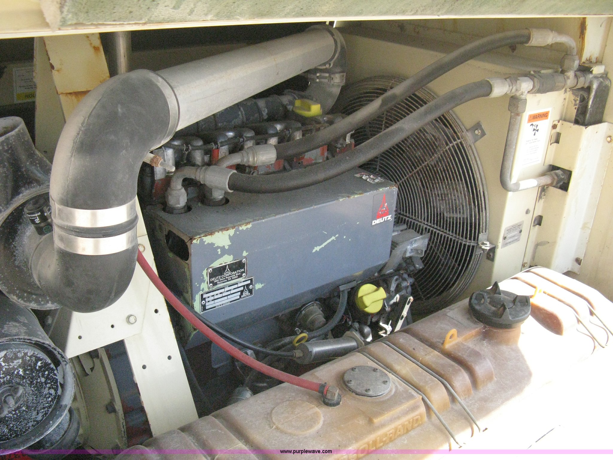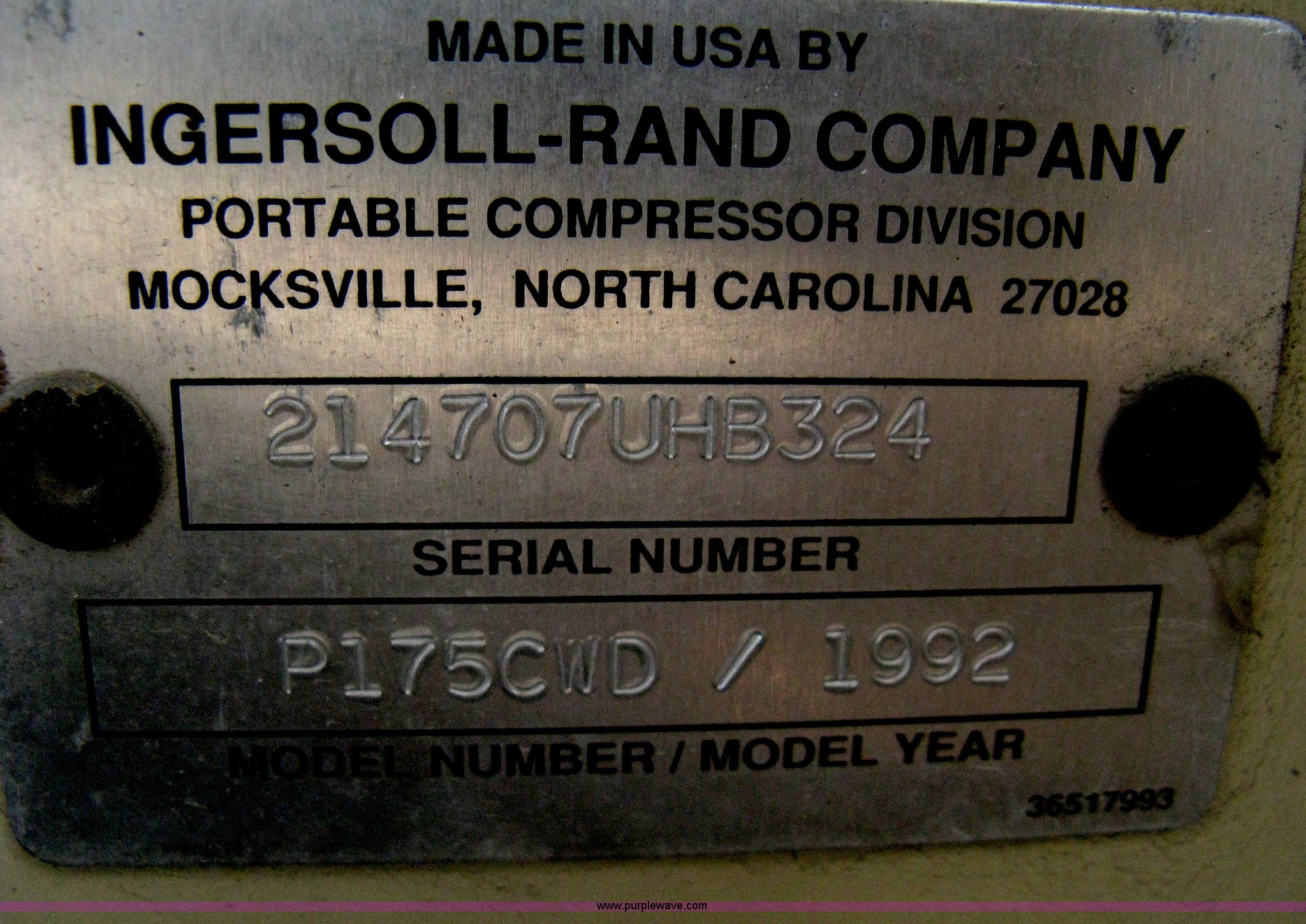 Purple Wave is selling a used Air Compressor in Kansas. This item is a 1992 Ingersoll-Rand 175 mobile compressor with the following: Model P175CWD, 3,142 hours on meter, Deutz four cylinder diesel engine, Adjustable pintle hitch, Trailer lights, Five lug, 15" wheels, 7.00-15LT tires, Serial 214707UHB324
