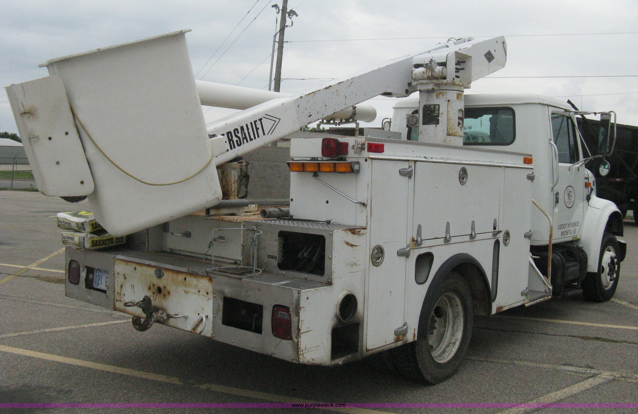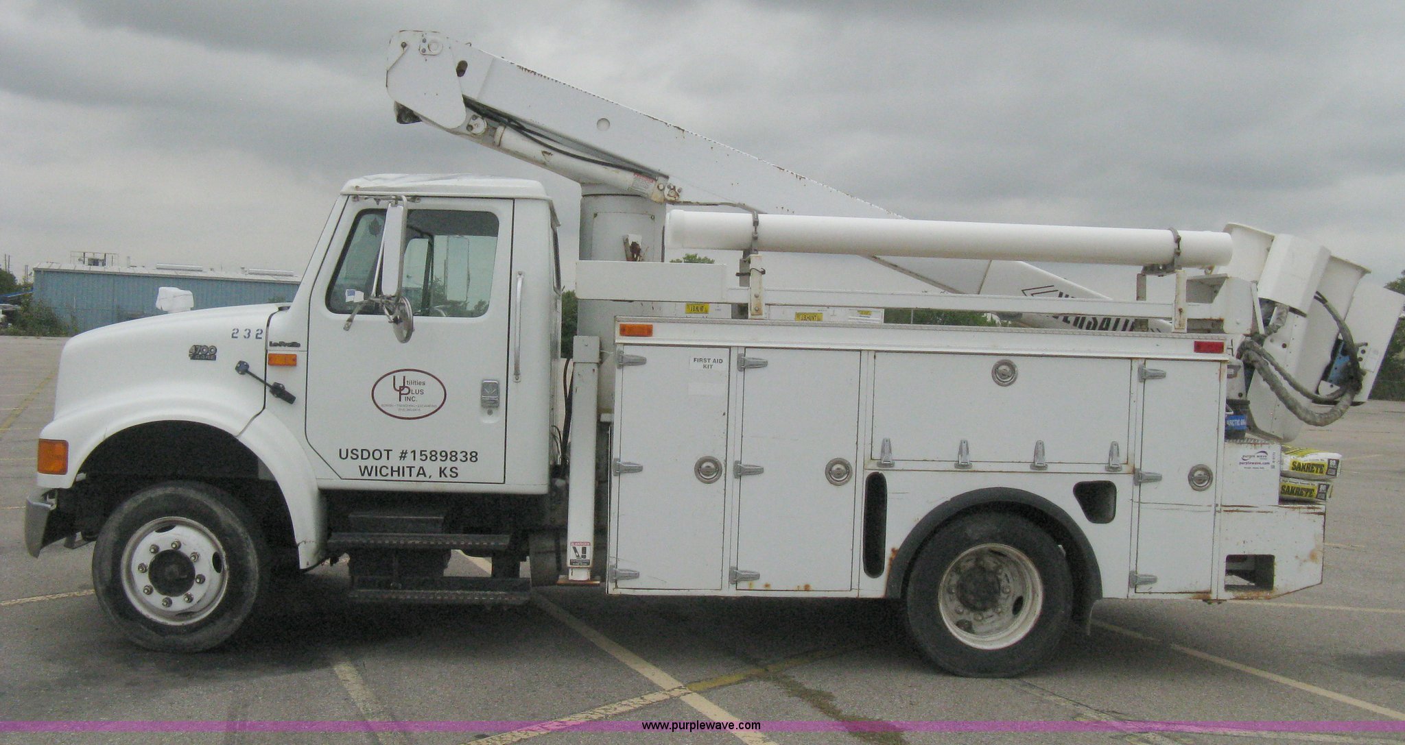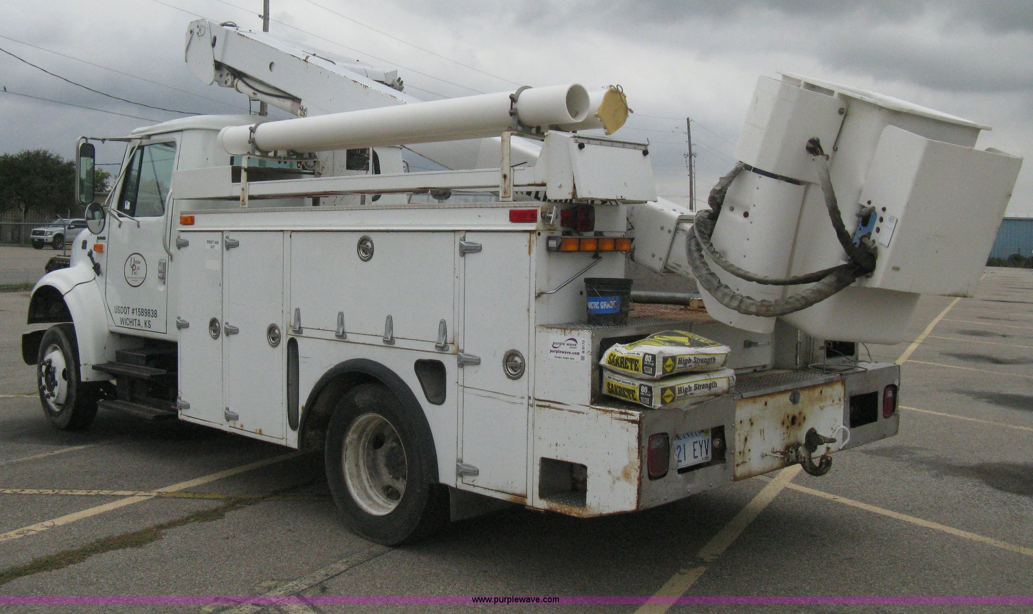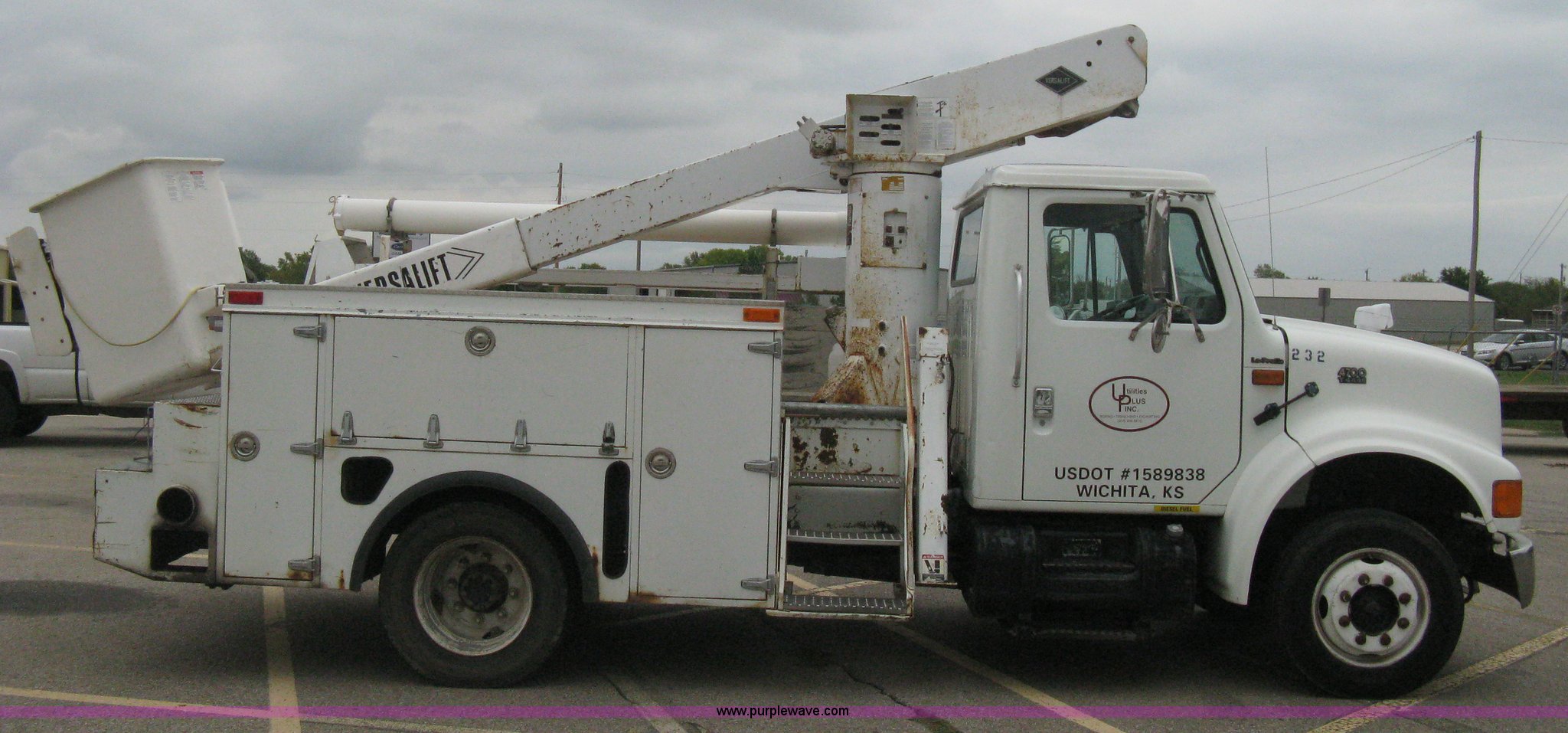 Purple Wave is selling a used Service Truck in Kansas. This item is a 1996 International 4700 Lo-Profile bucket truck with the following: 135,646 miles on odometer, 1,405 PTO hours on meter, International Navistar B190 V8 diesel engine, Recently rebuilt, less than 100 miles, Engine power issues when towing, Automatic transmission, AC and heat, AM/FM/cassette, Manual windows and locks, Vinyl interior, Electric trailer brake booster, PTO, Work lights, Spotlight, Beacon, 12'L x 8'W utility bed, (7) compartments, Step up rear bumper, Top mounted supply tray and tubes, (2) hydraulic outriggers, 1995 Versalift telescopic man lift, Model VSG3300I, Serial W9533, 350 lb platform capacity, 33' platform height, Fiberglass basket, Auxiliary hydraulic remotes on bed,, Pintle hitch, Trailer wiring, 245/70R19.5 tires, Cracked windshield, EIN 232