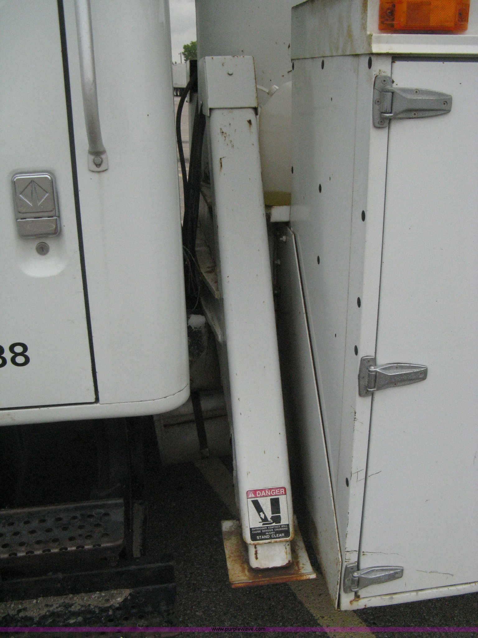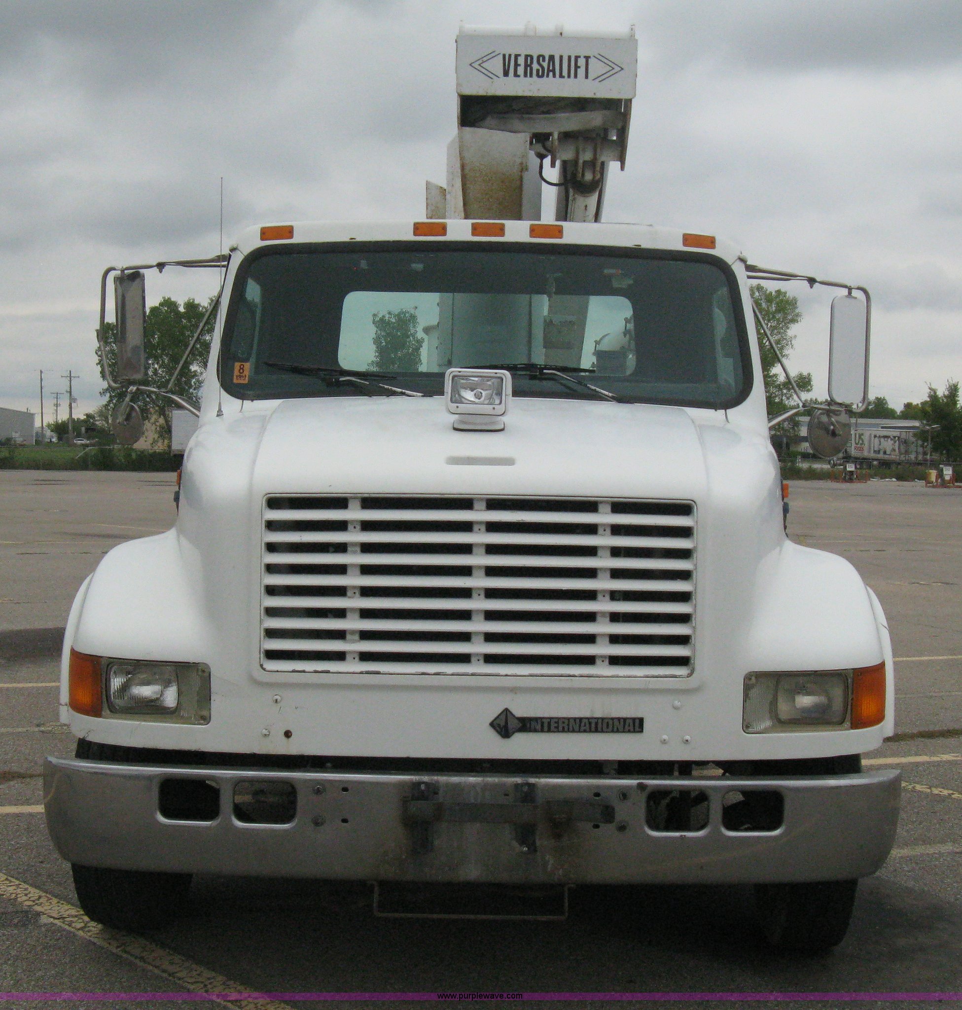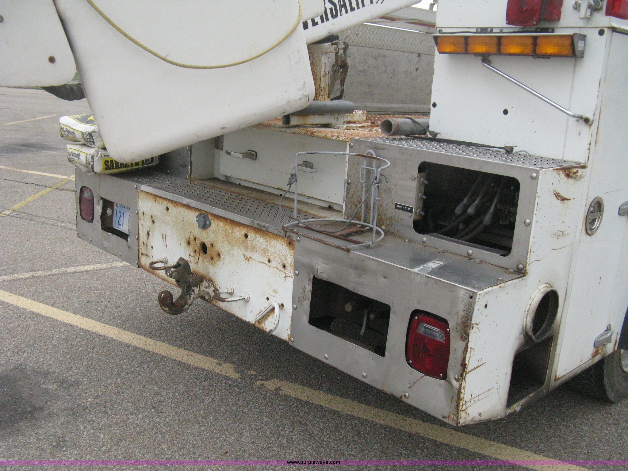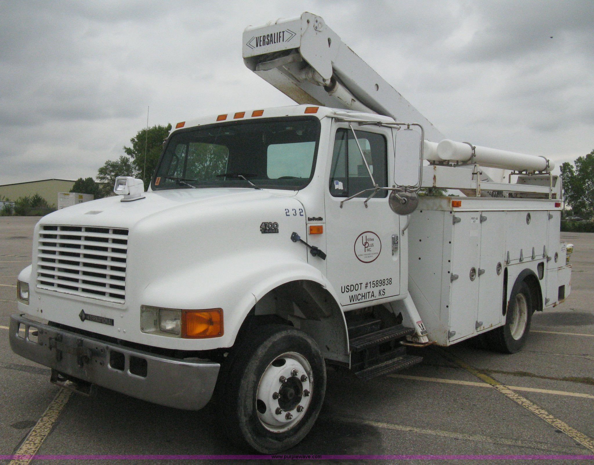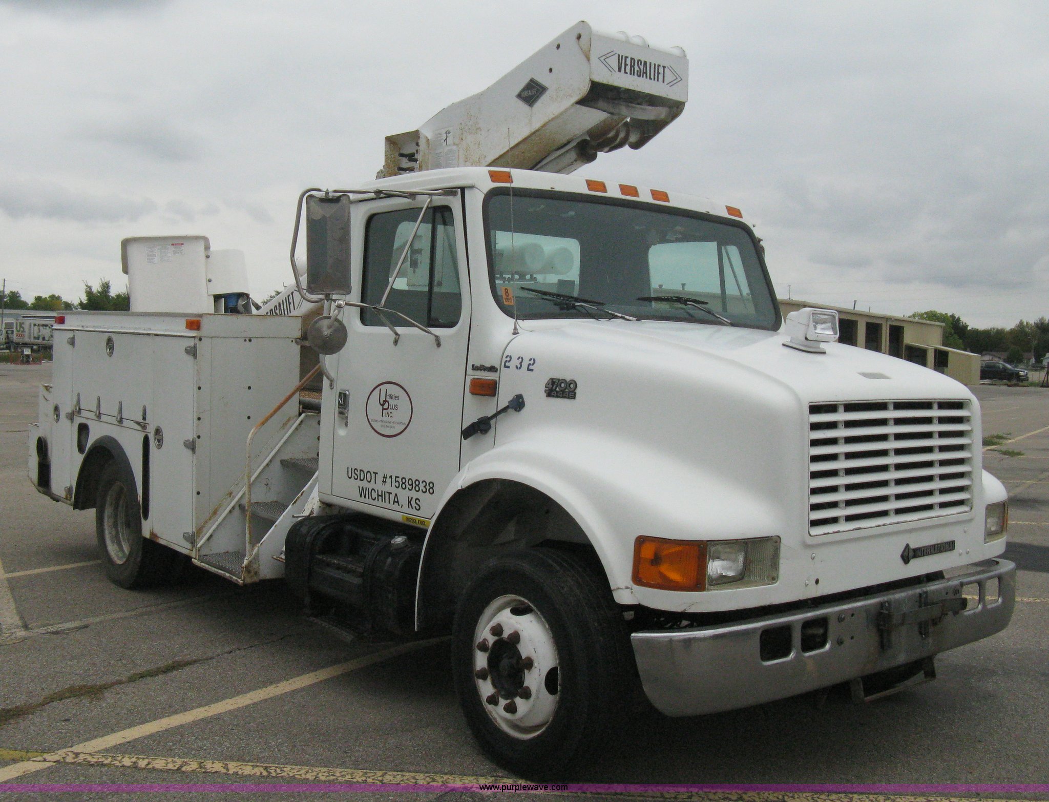 Purple Wave is selling a used Service Truck in Kansas. This item is a 1996 International 4700 Lo-Profile bucket truck with the following: 135,646 miles on odometer, 1,405 PTO hours on meter, International Navistar B190 V8 diesel engine, Recently rebuilt, less than 100 miles, Engine power issues when towing, Automatic transmission, AC and heat, AM/FM/cassette, Manual windows and locks, Vinyl interior, Electric trailer brake booster, PTO, Work lights, Spotlight, Beacon, 12'L x 8'W utility bed, (7) compartments, Step up rear bumper, Top mounted supply tray and tubes, (2) hydraulic outriggers, 1995 Versalift telescopic man lift, Model VSG3300I, Serial W9533, 350 lb platform capacity, 33' platform height, Fiberglass basket, Auxiliary hydraulic remotes on bed,, Pintle hitch, Trailer wiring, 245/70R19.5 tires, Cracked windshield, EIN 232