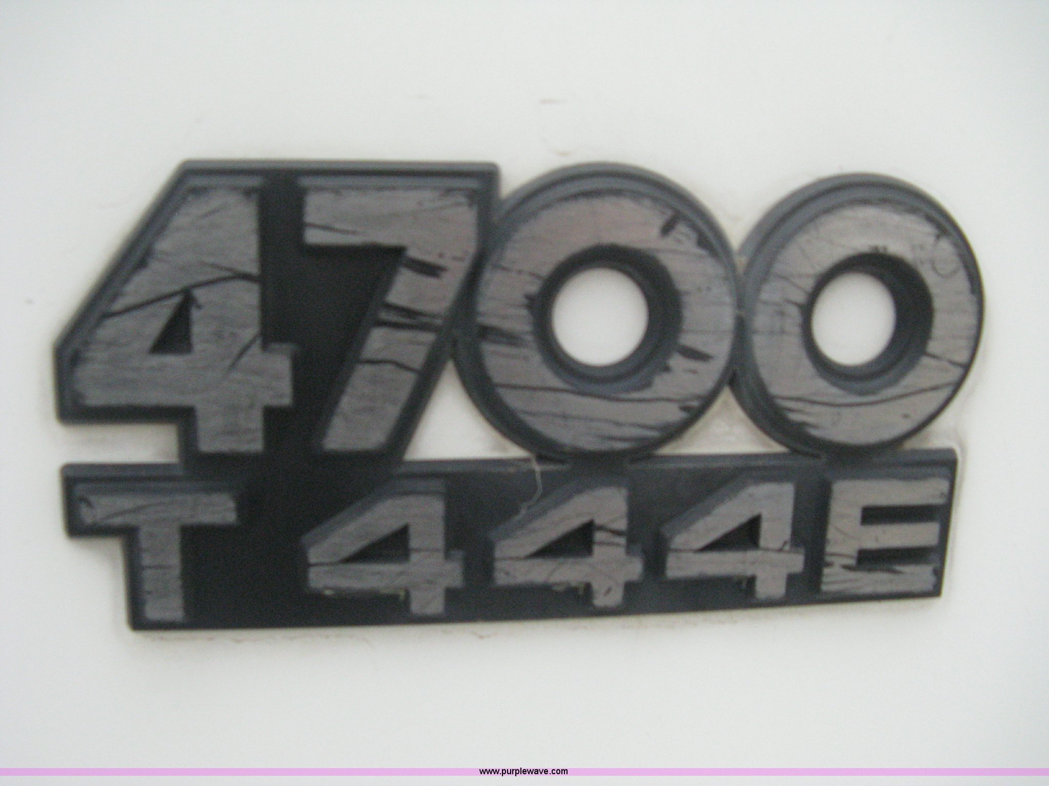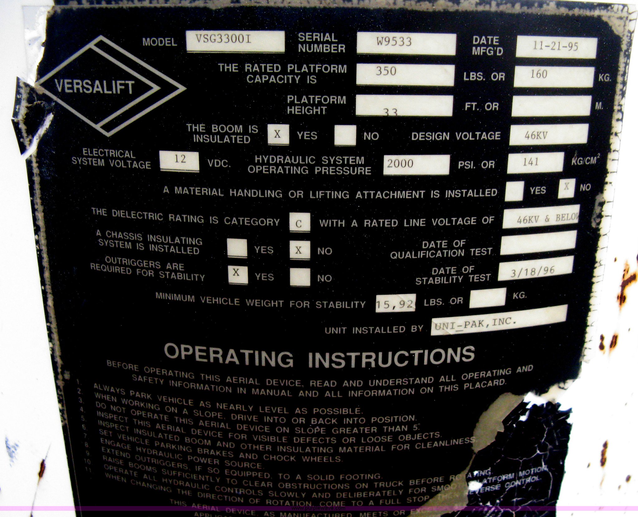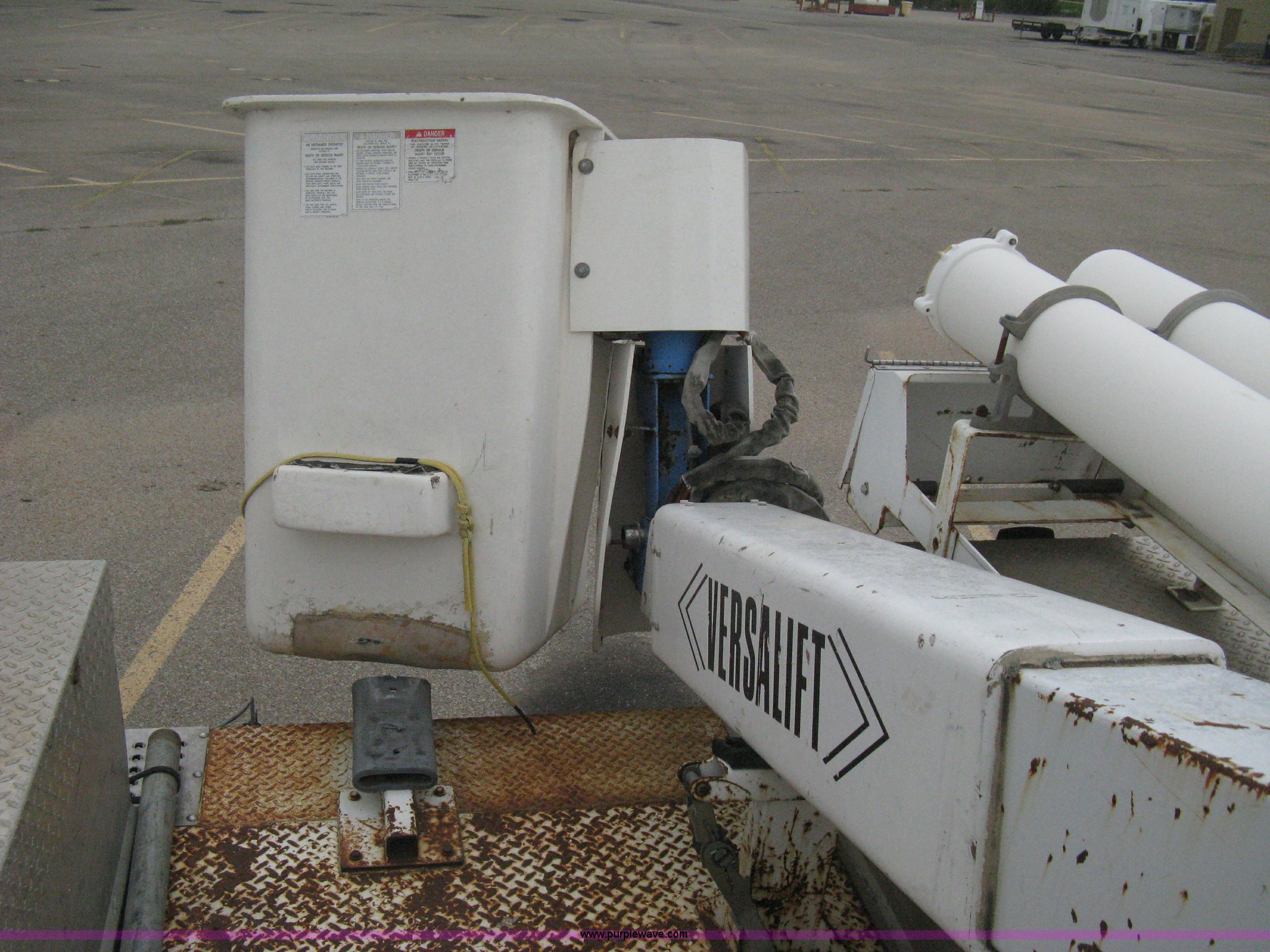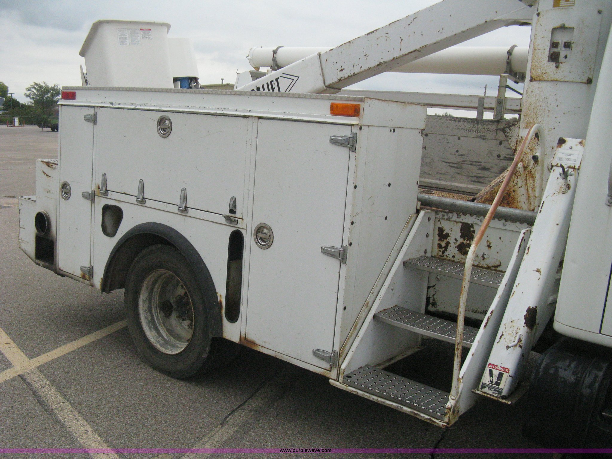 Purple Wave is selling a used Service Truck in Kansas. This item is a 1996 International 4700 Lo-Profile bucket truck with the following: 135,646 miles on odometer, 1,405 PTO hours on meter, International Navistar B190 V8 diesel engine, Recently rebuilt, less than 100 miles, Engine power issues when towing, Automatic transmission, AC and heat, AM/FM/cassette, Manual windows and locks, Vinyl interior, Electric trailer brake booster, PTO, Work lights, Spotlight, Beacon, 12'L x 8'W utility bed, (7) compartments, Step up rear bumper, Top mounted supply tray and tubes, (2) hydraulic outriggers, 1995 Versalift telescopic man lift, Model VSG3300I, Serial W9533, 350 lb platform capacity, 33' platform height, Fiberglass basket, Auxiliary hydraulic remotes on bed,, Pintle hitch, Trailer wiring, 245/70R19.5 tires, Cracked windshield, EIN 232