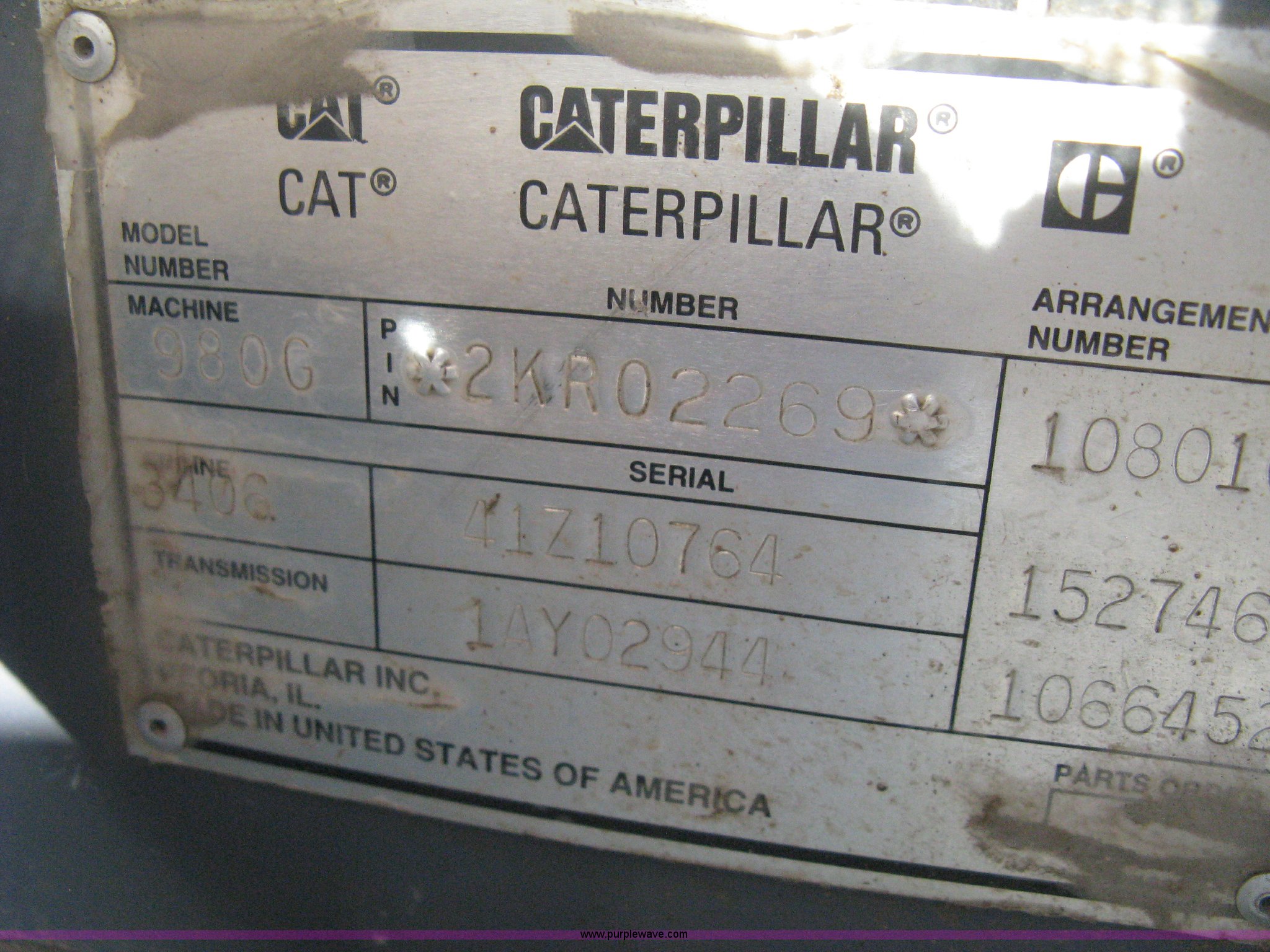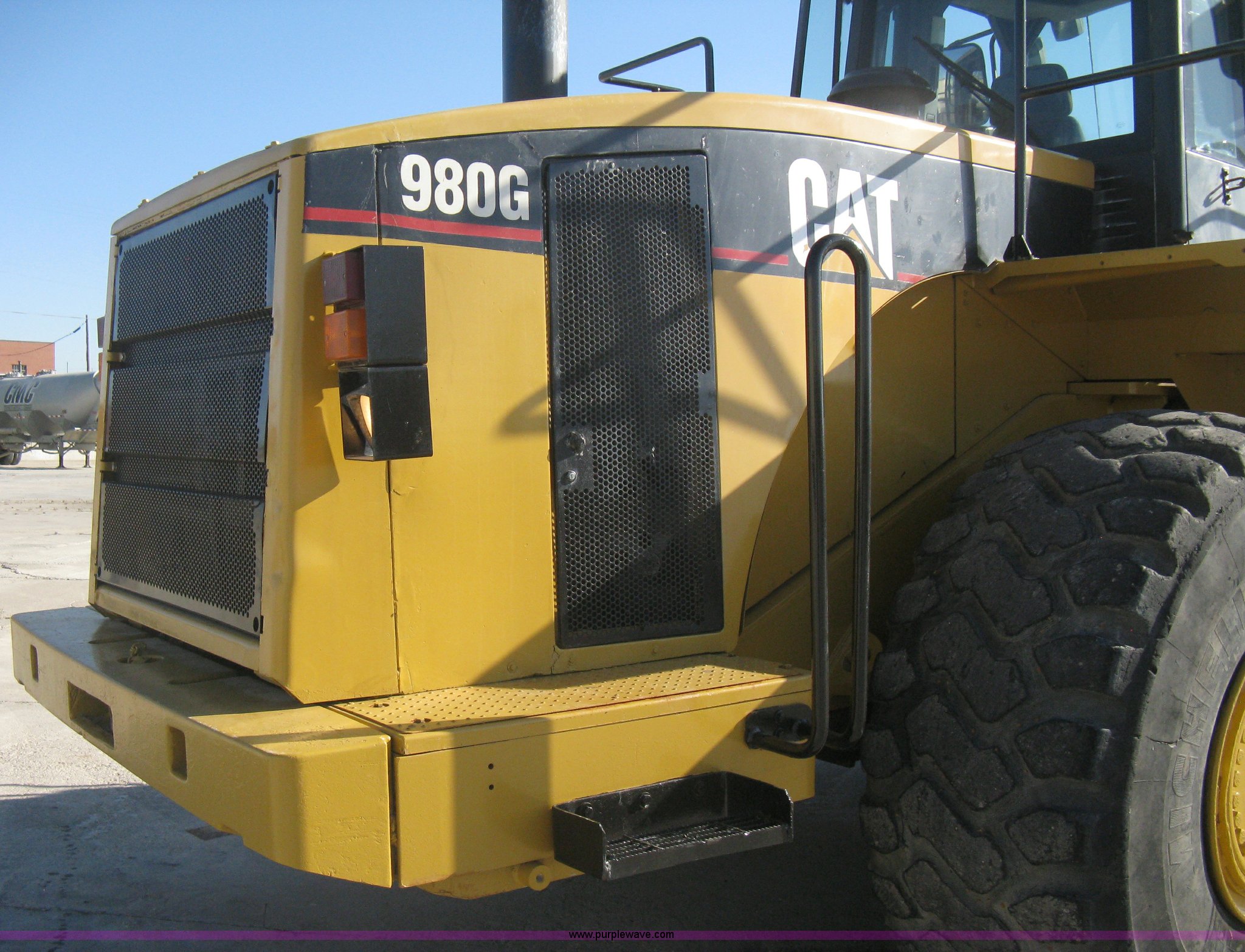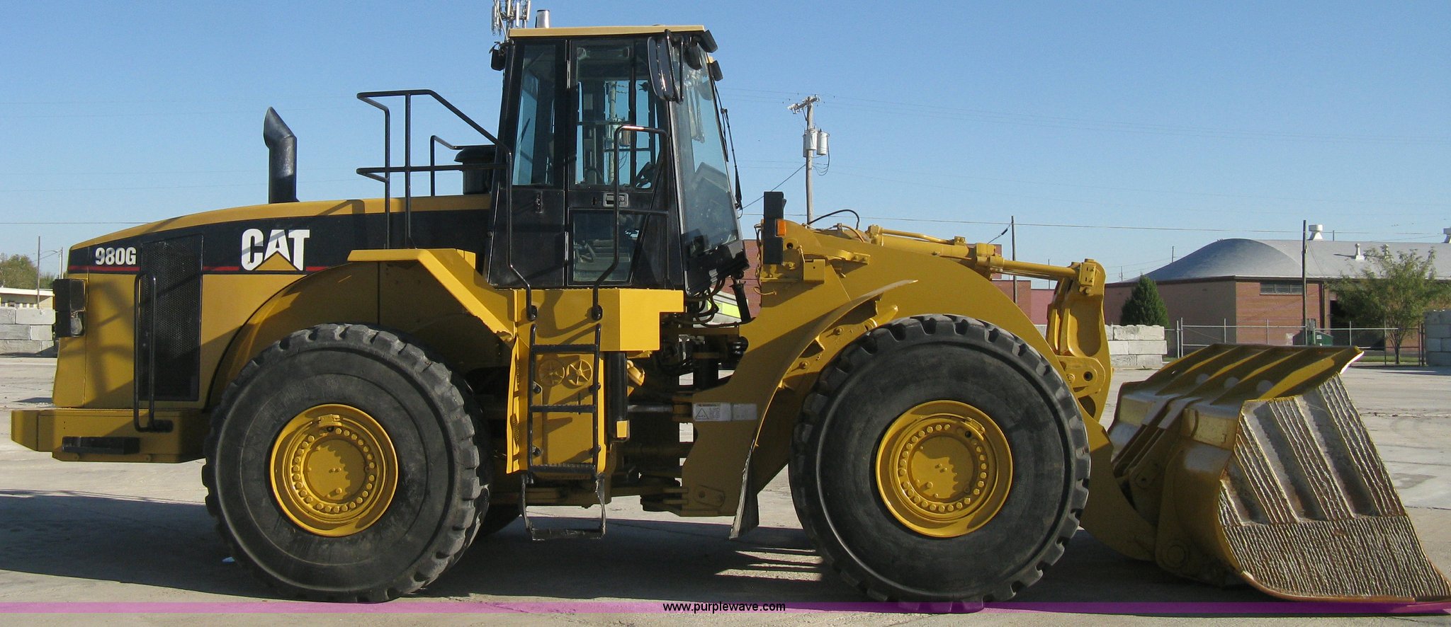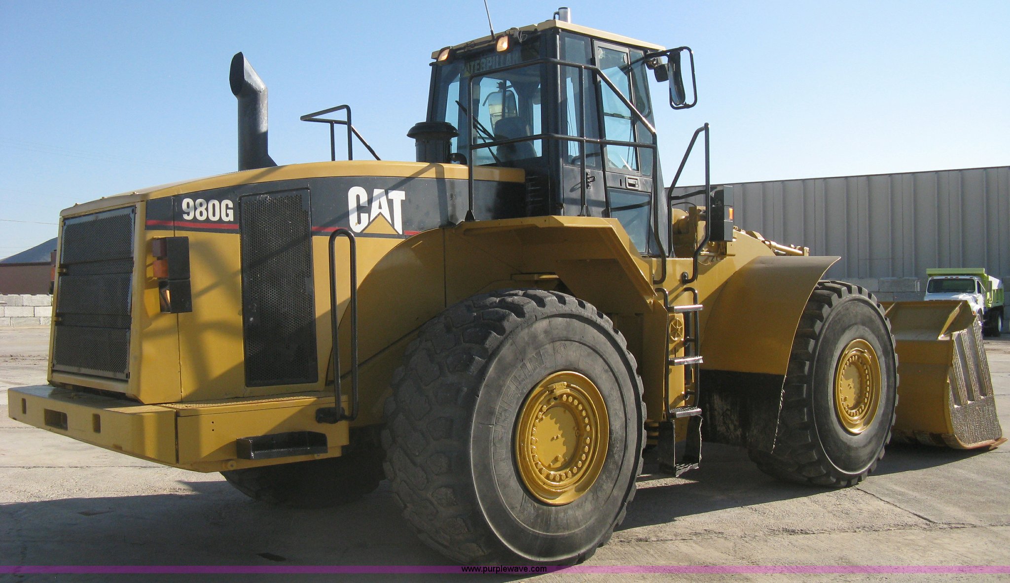 Purple Wave is selling a used Wheel Loader in Kansas. This item is a 1998 Caterpillar 980G wheel loader with the following: 28,716 hours on meter, Caterpillar 3406 diesel engine, 300 HP, Serial 41Z10764, Powershift transmission, Forward/reverse kick down button, Serial 1AY02944, Enclosed cab, AC and heat, Tilt steering, Suspension seat, Cassette radio, Sliding windows, Work lights, 11'W bucket, Bolt-on edge, Weighted rear bumper, Pin hitch, 29.5R25 CL-3 tires, 65,638 lbs. base operating weight, Left side windshield glass cracked, Serial 2KR02269