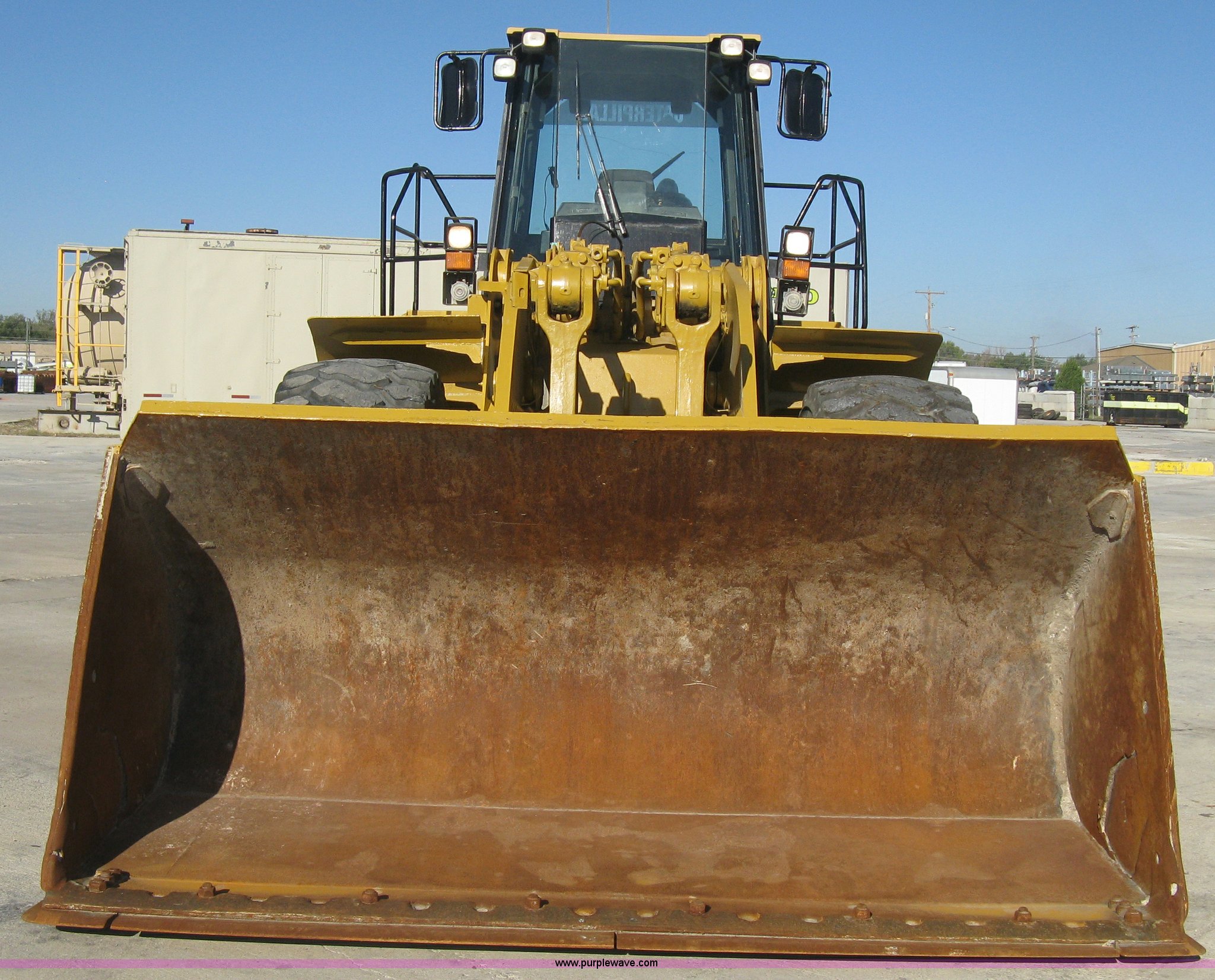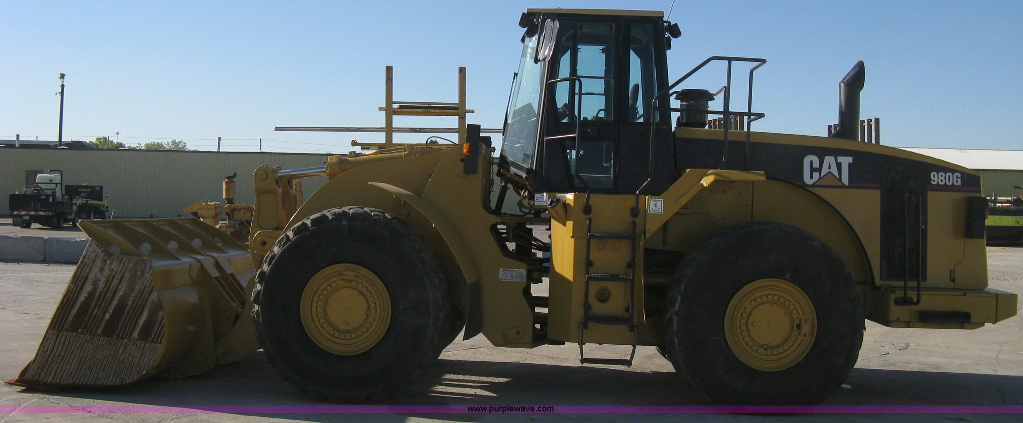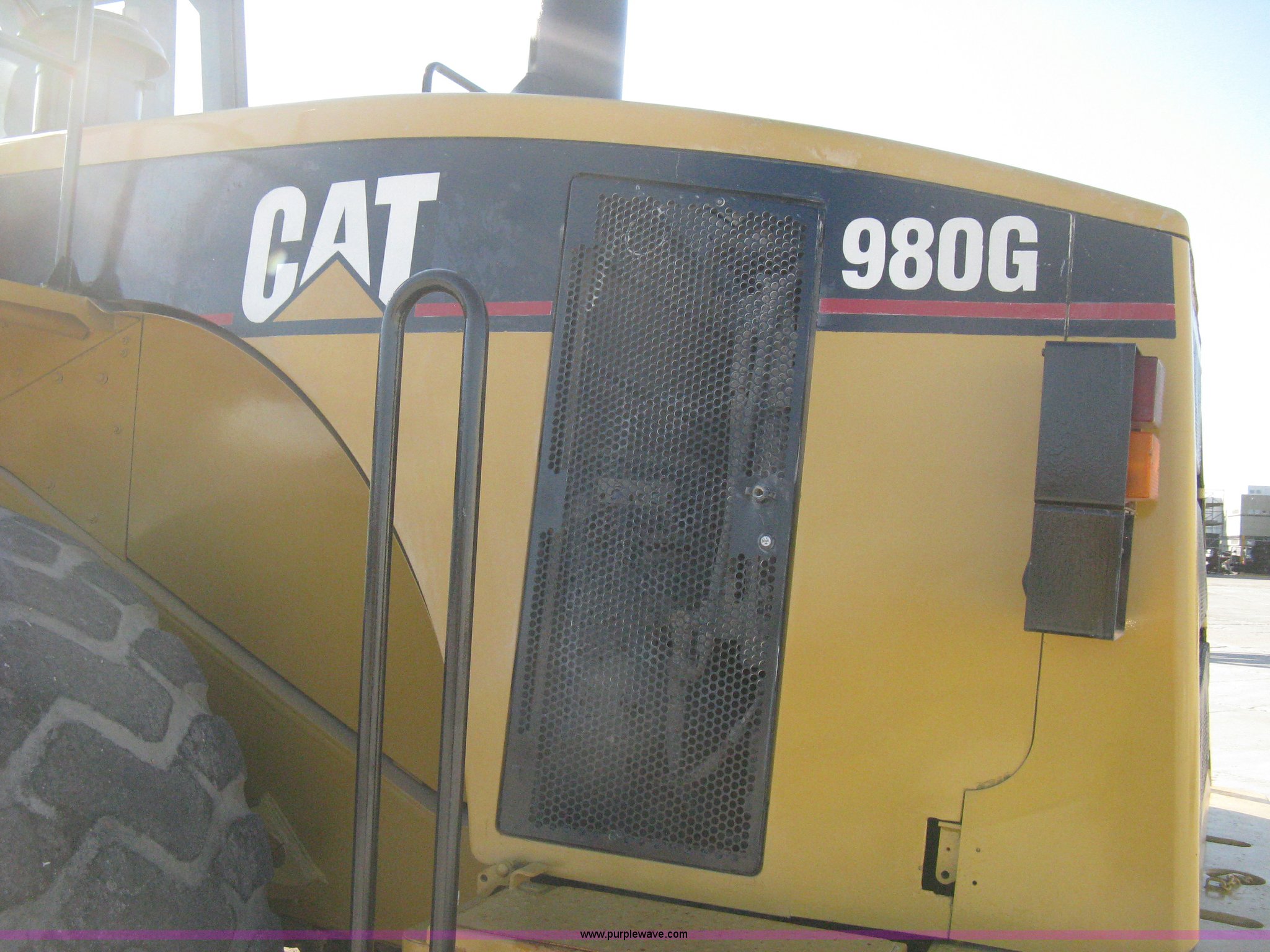 Purple Wave is selling a used Wheel Loader in Kansas. This item is a 1998 Caterpillar 980G wheel loader with the following: 28,716 hours on meter, Caterpillar 3406 diesel engine, 300 HP, Serial 41Z10764, Powershift transmission, Forward/reverse kick down button, Serial 1AY02944, Enclosed cab, AC and heat, Tilt steering, Suspension seat, Cassette radio, Sliding windows, Work lights, 11'W bucket, Bolt-on edge, Weighted rear bumper, Pin hitch, 29.5R25 CL-3 tires, 65,638 lbs. base operating weight, Left side windshield glass cracked, Serial 2KR02269