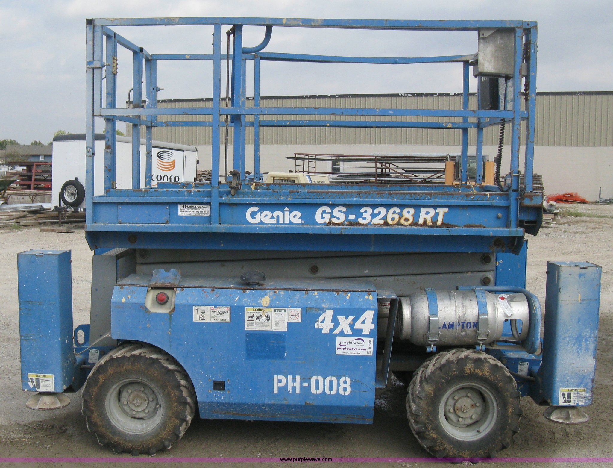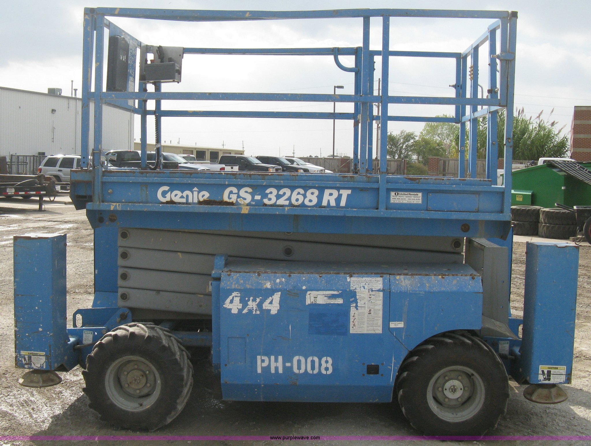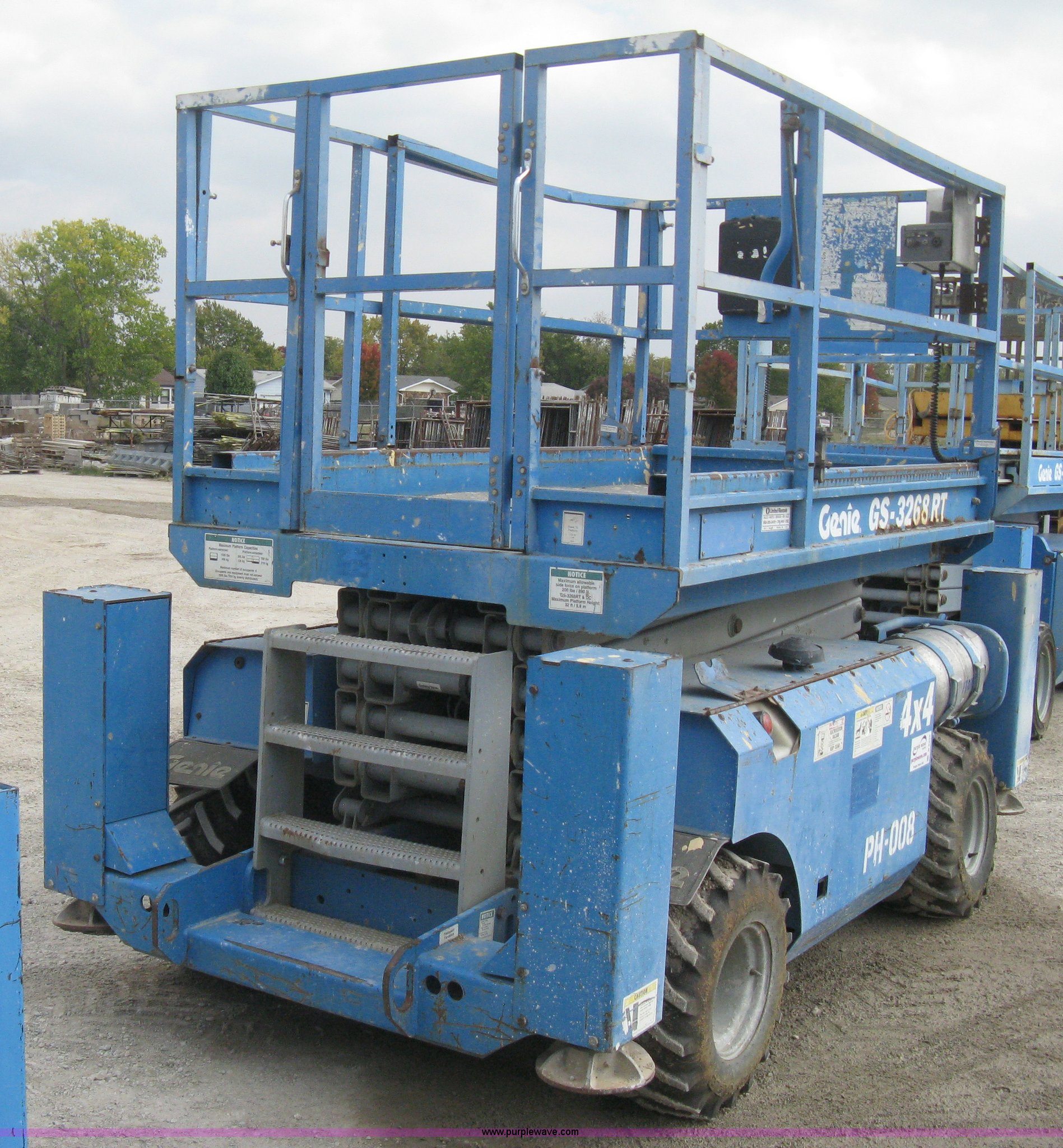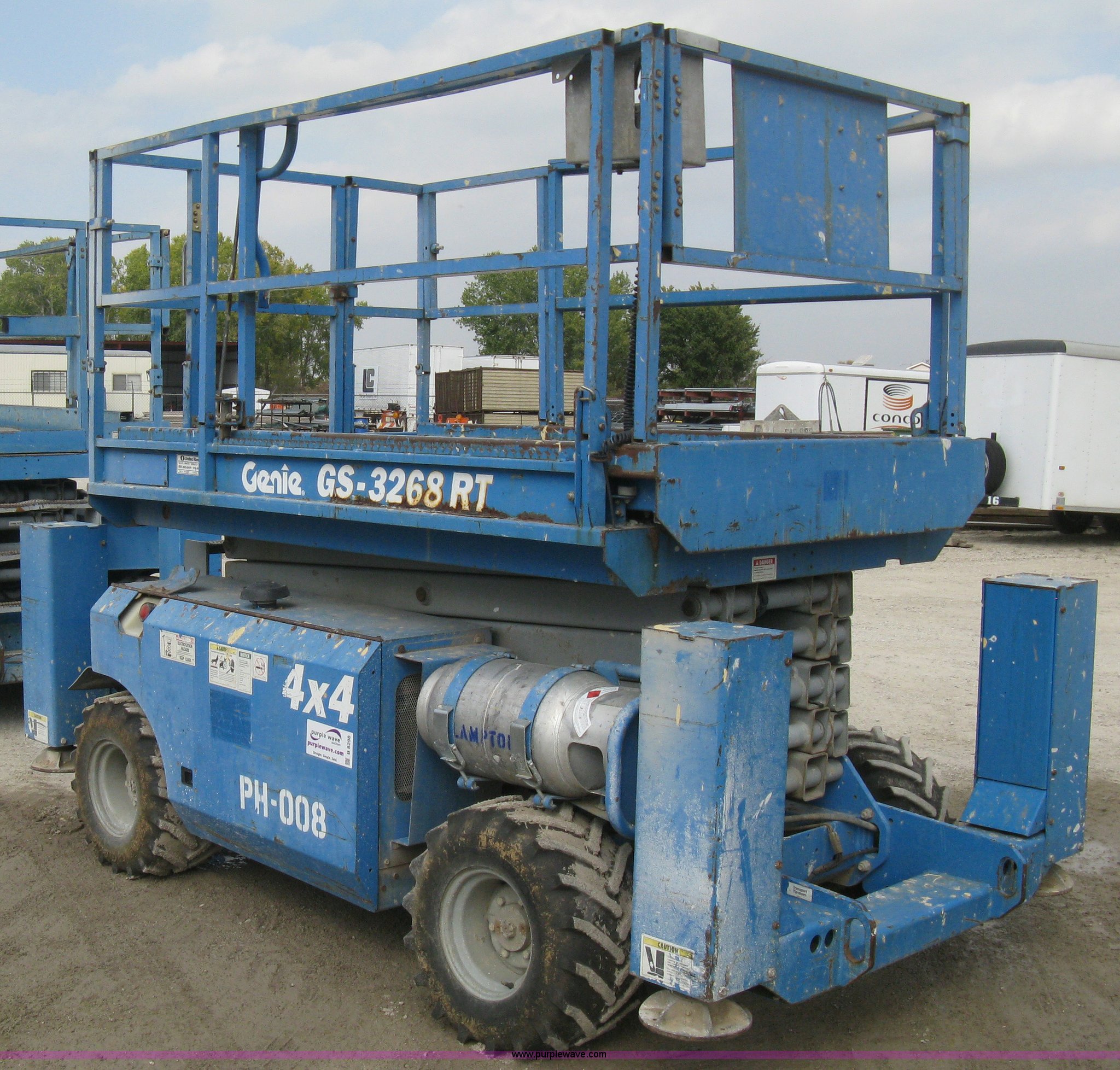 2001 Genie GS-3268RT rough terrain scissor lift has sold in Wichita, Kansas for $7590. Item B8298 sold on October 25th, 2012.