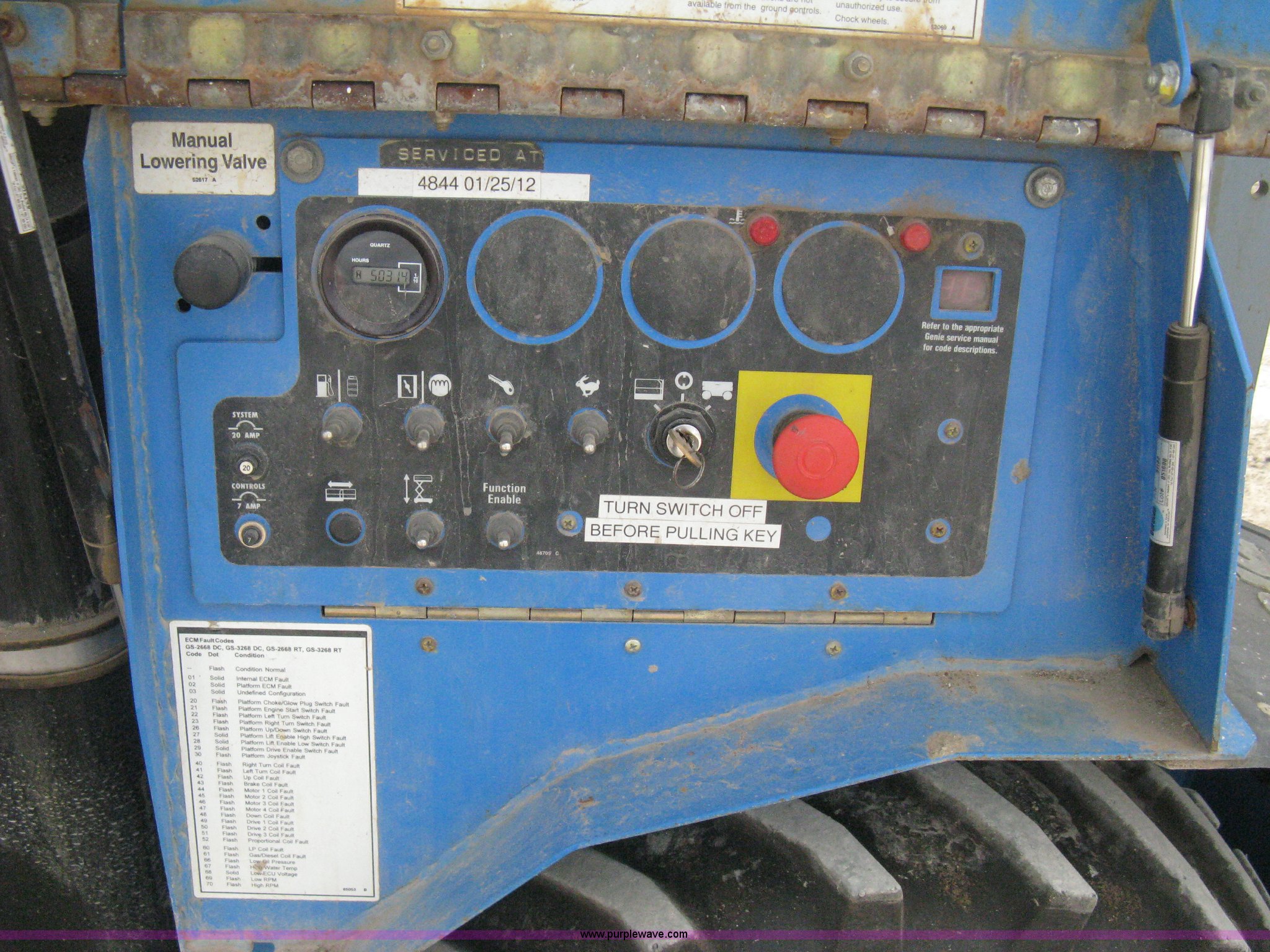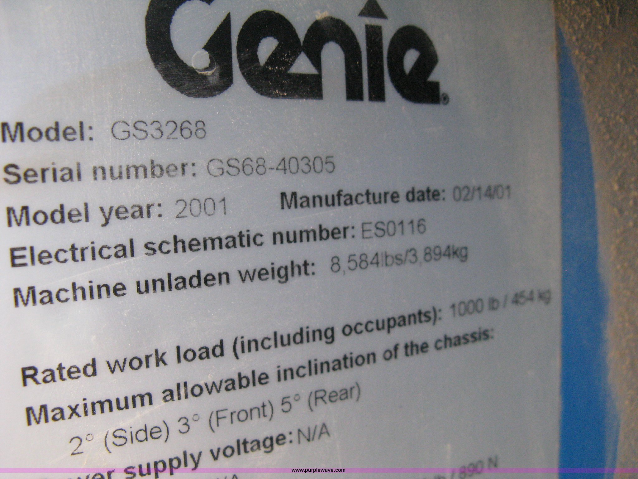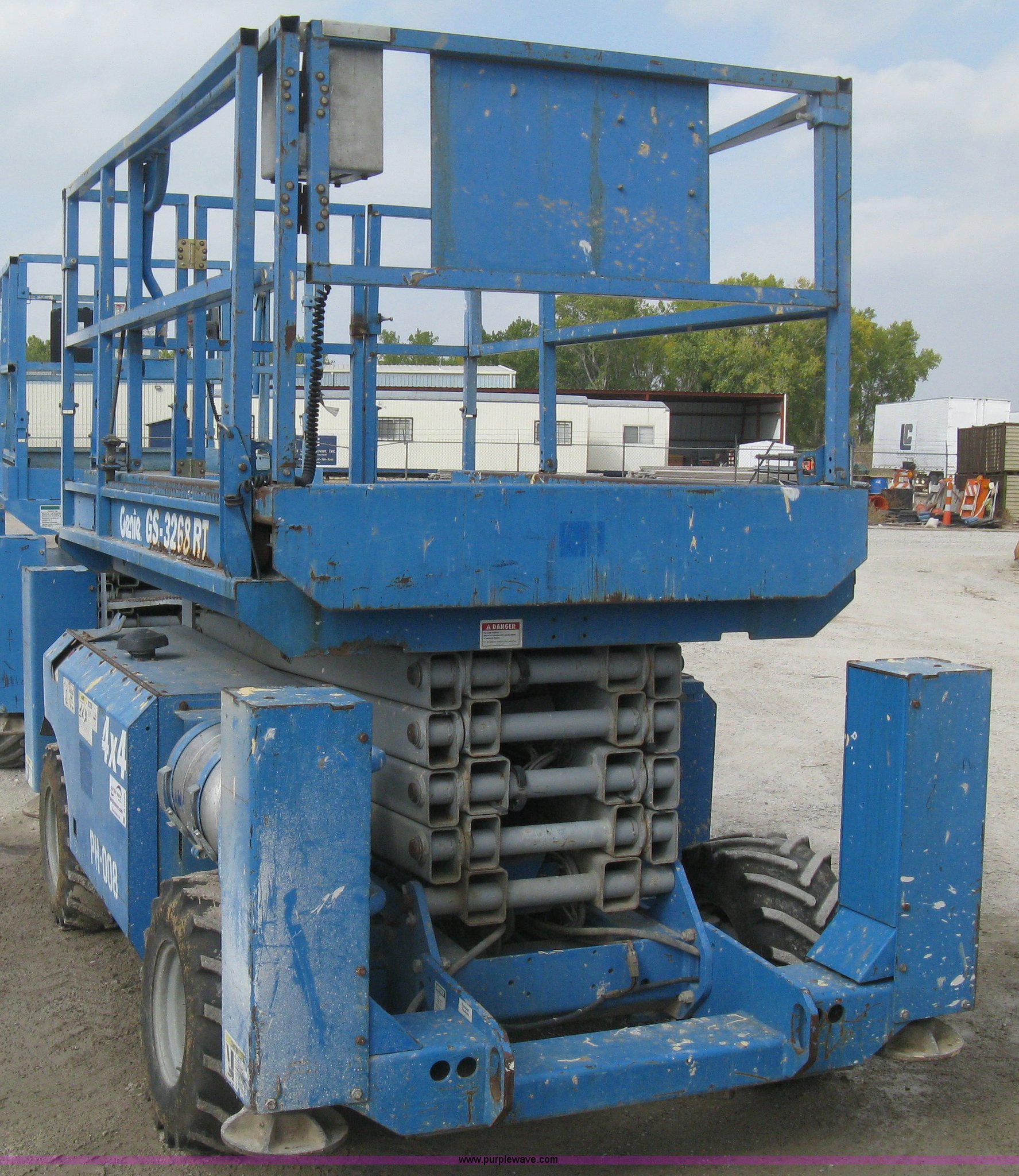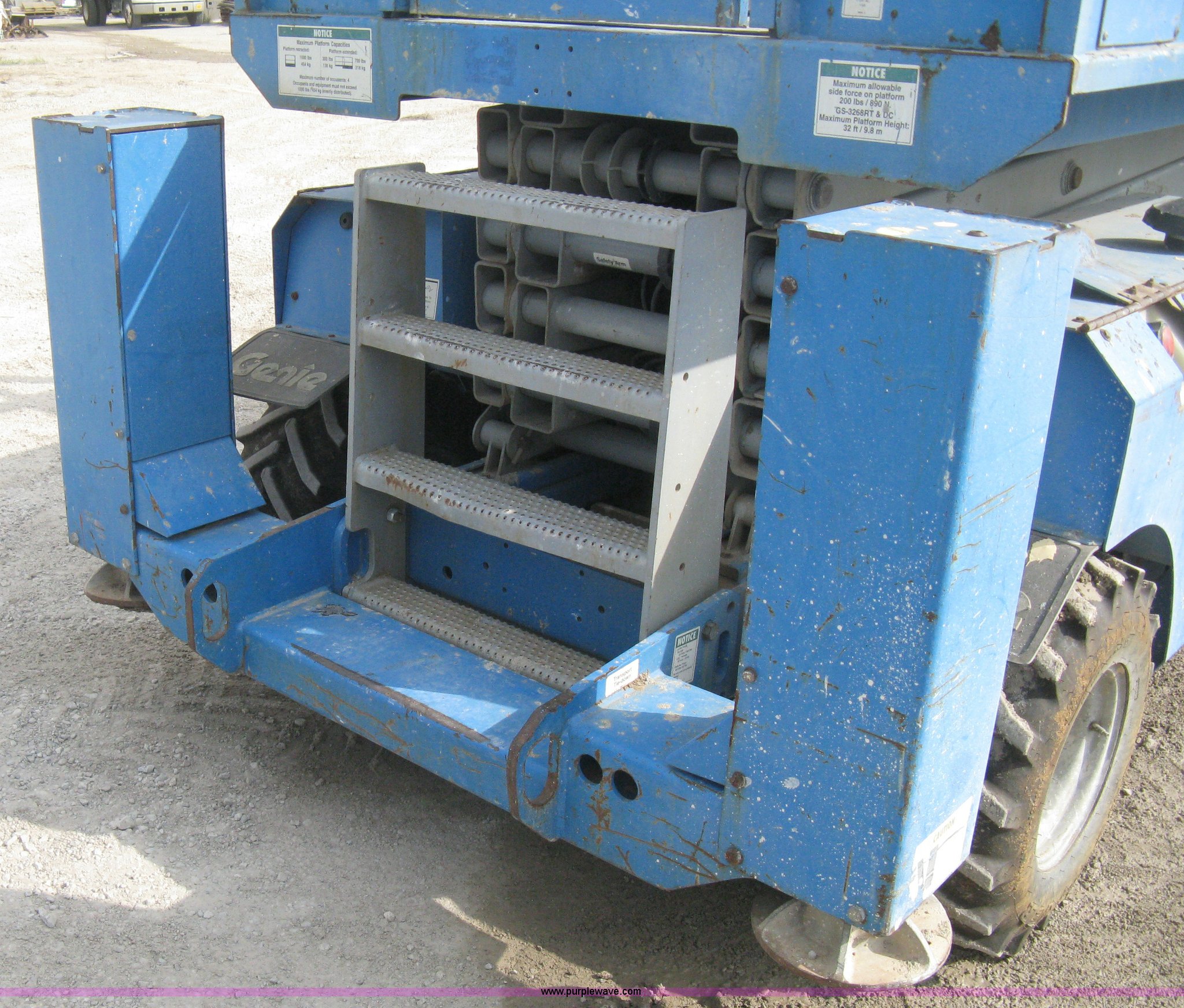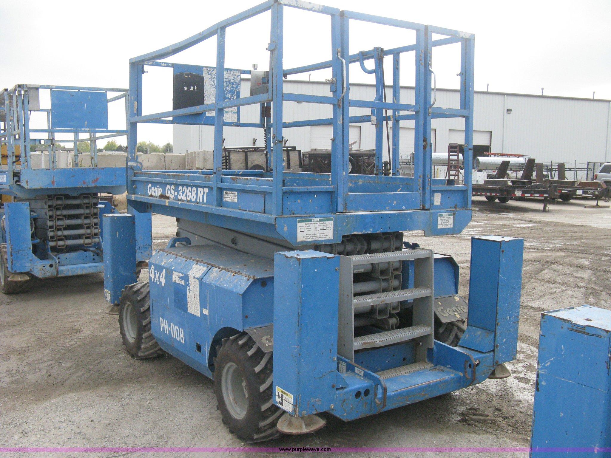 2001 Genie GS-3268RT rough terrain scissor lift has sold in Wichita, Kansas for $7590. Item B8298 sold on October 25th, 2012.