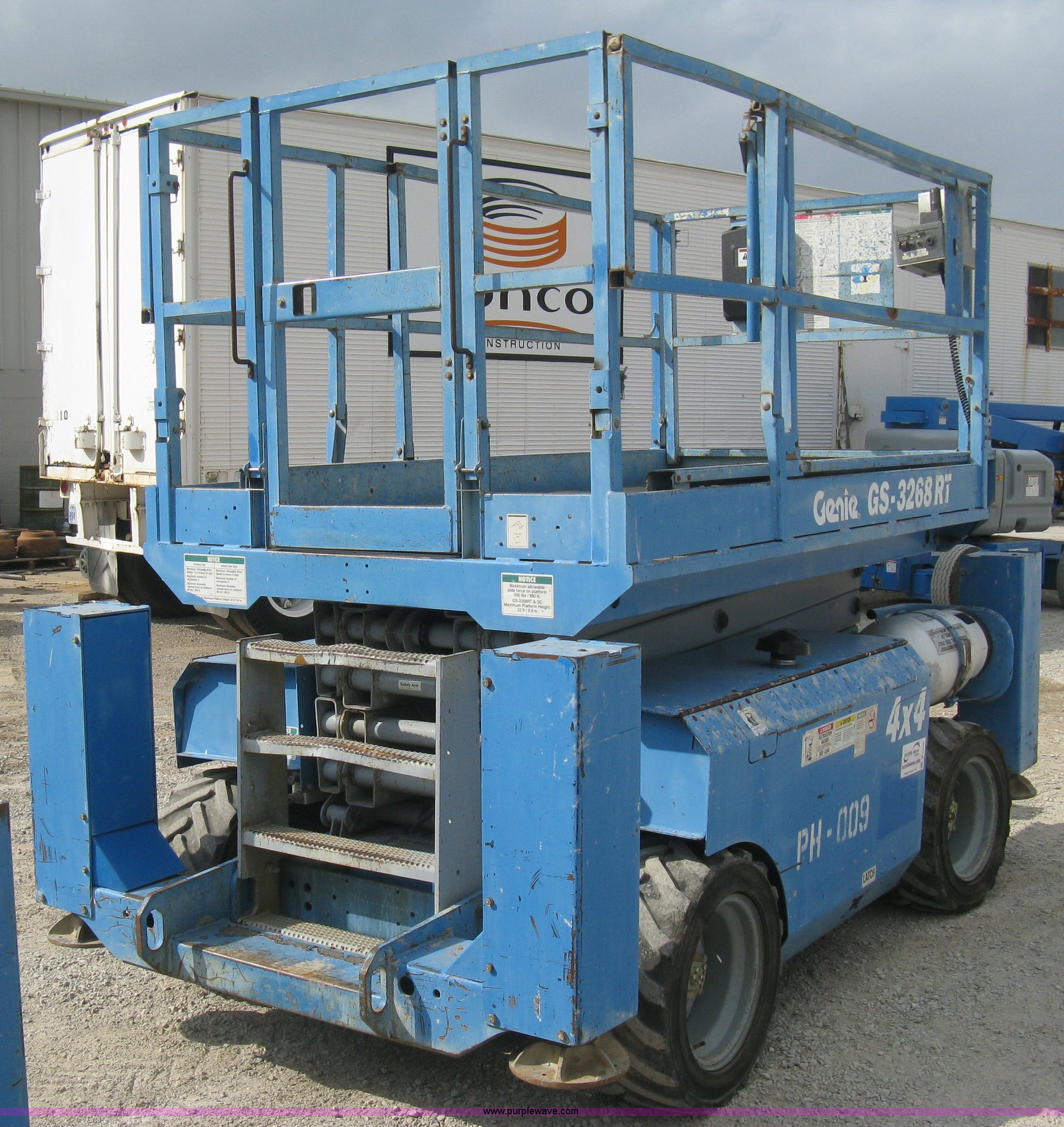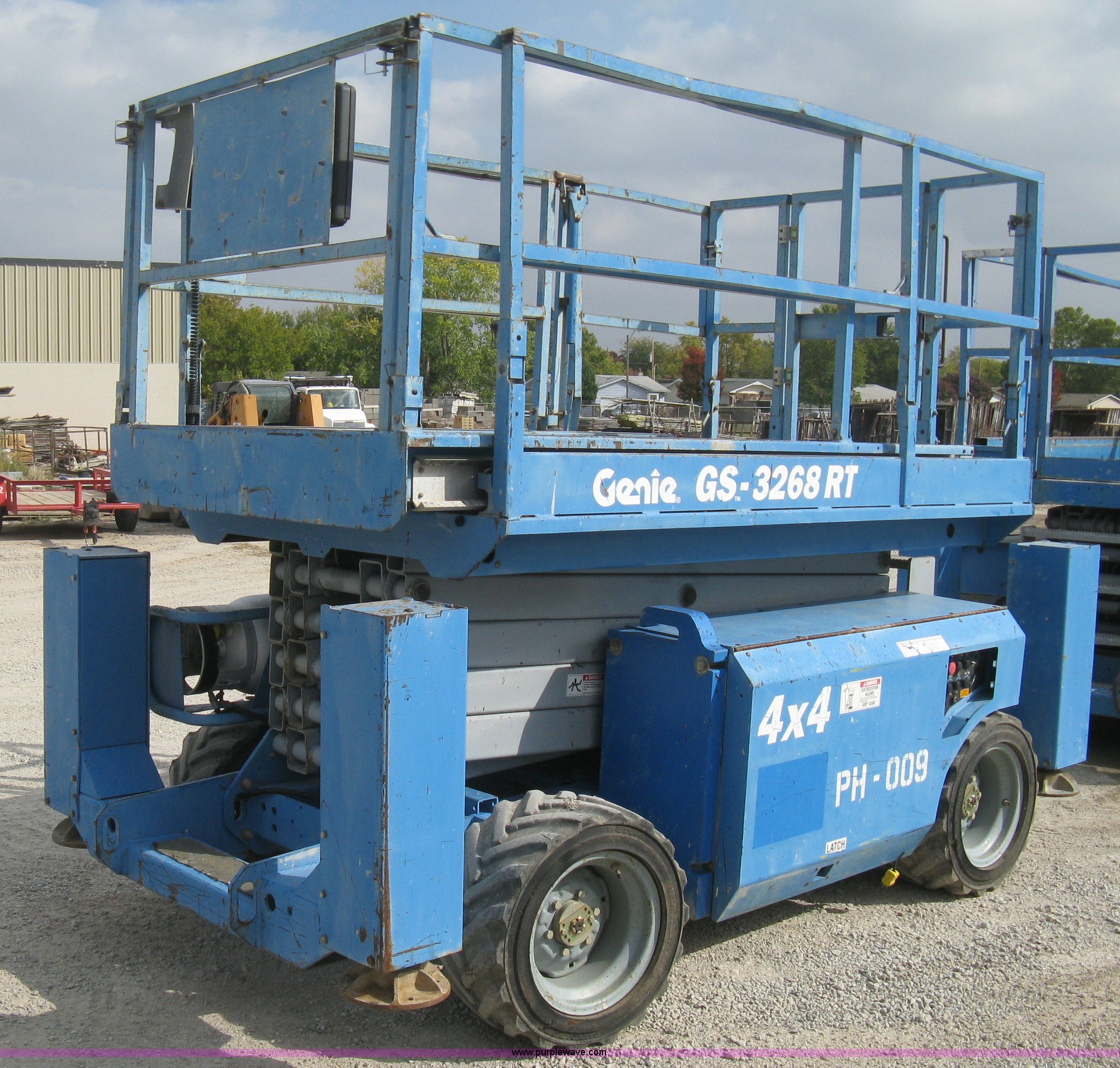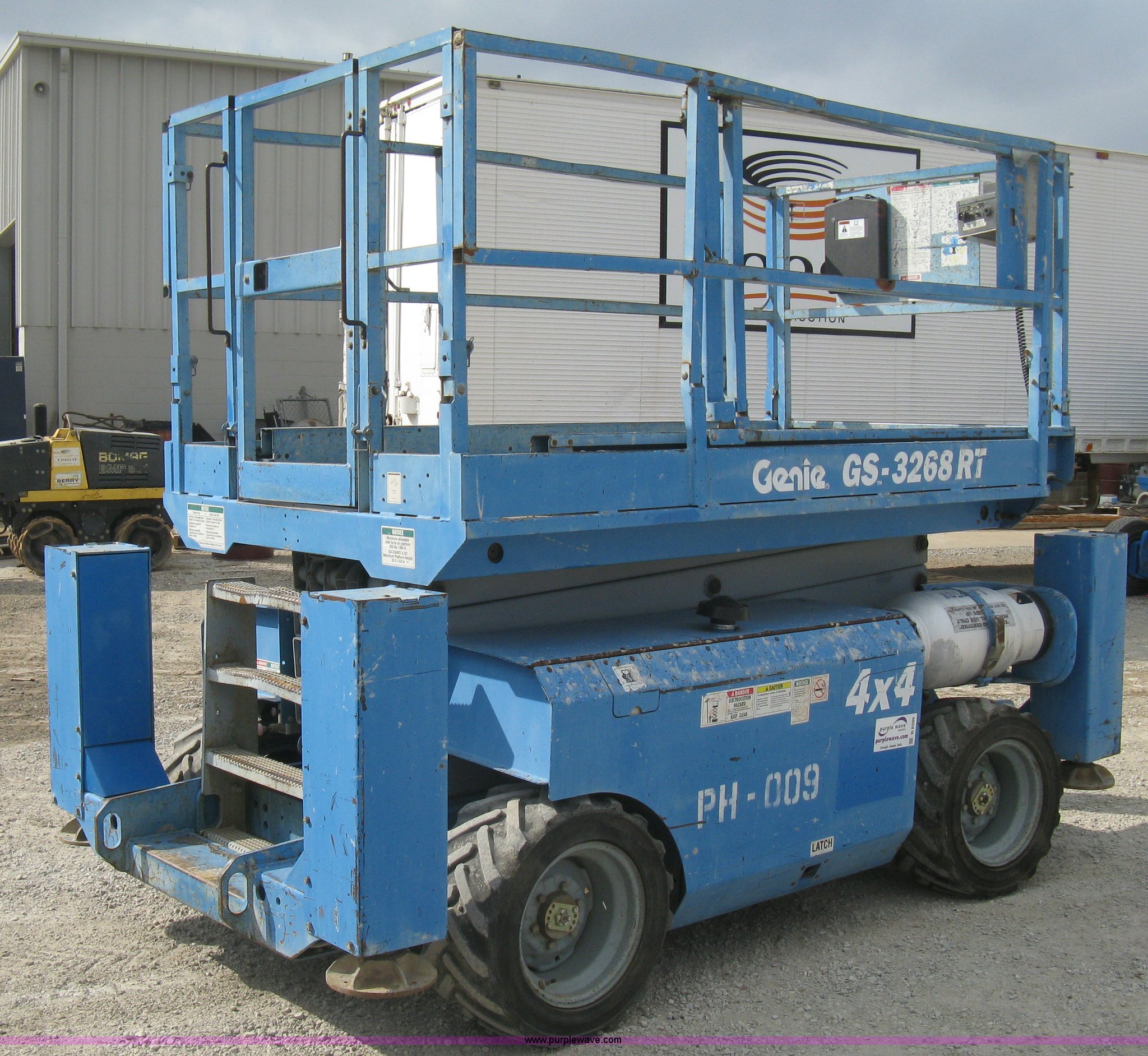 2003 Genie GS-3268RT rough terrain scissor lift has sold in Wichita, Kansas for $9130. Item B8299 sold on October 25th, 2012.