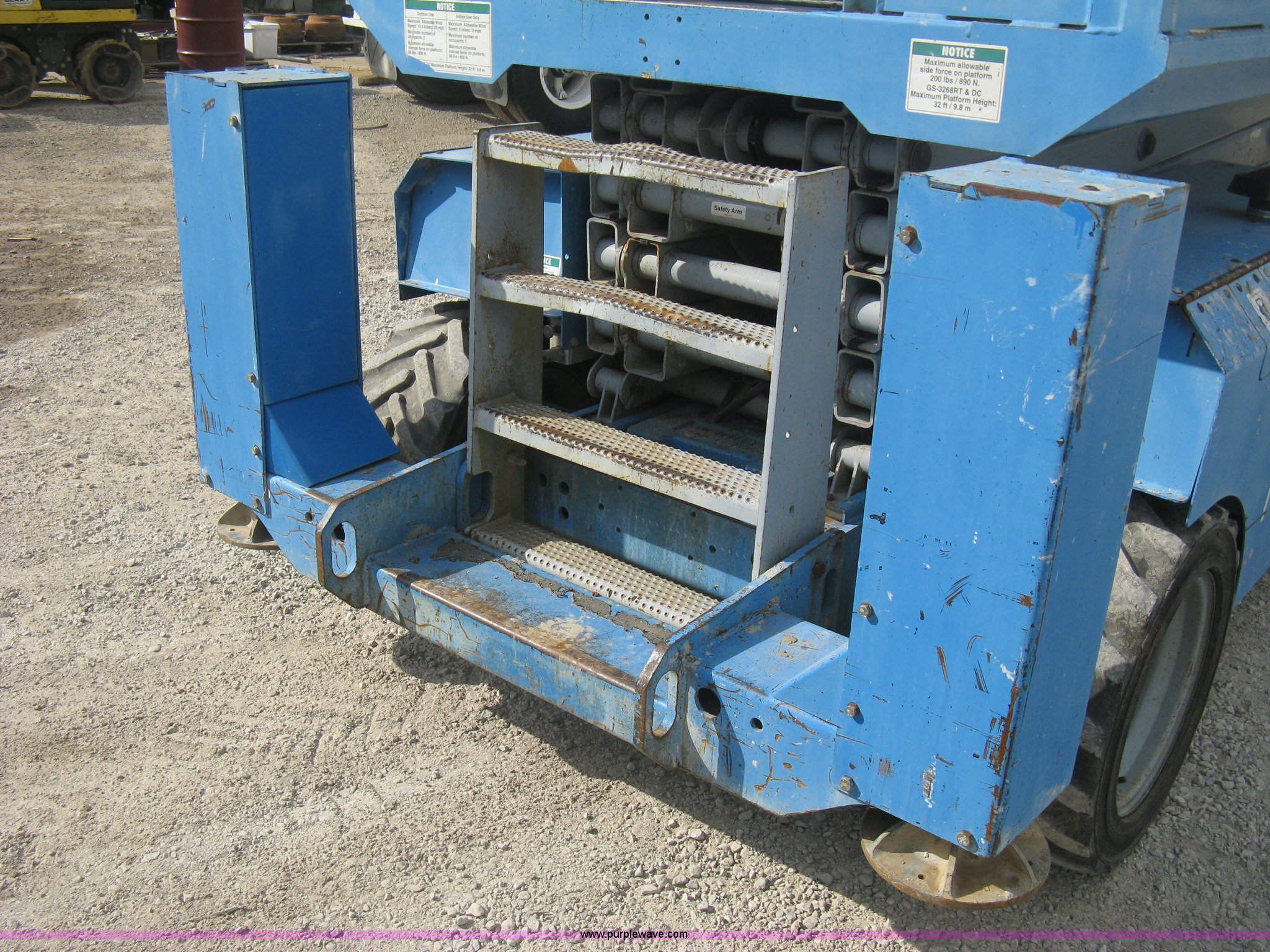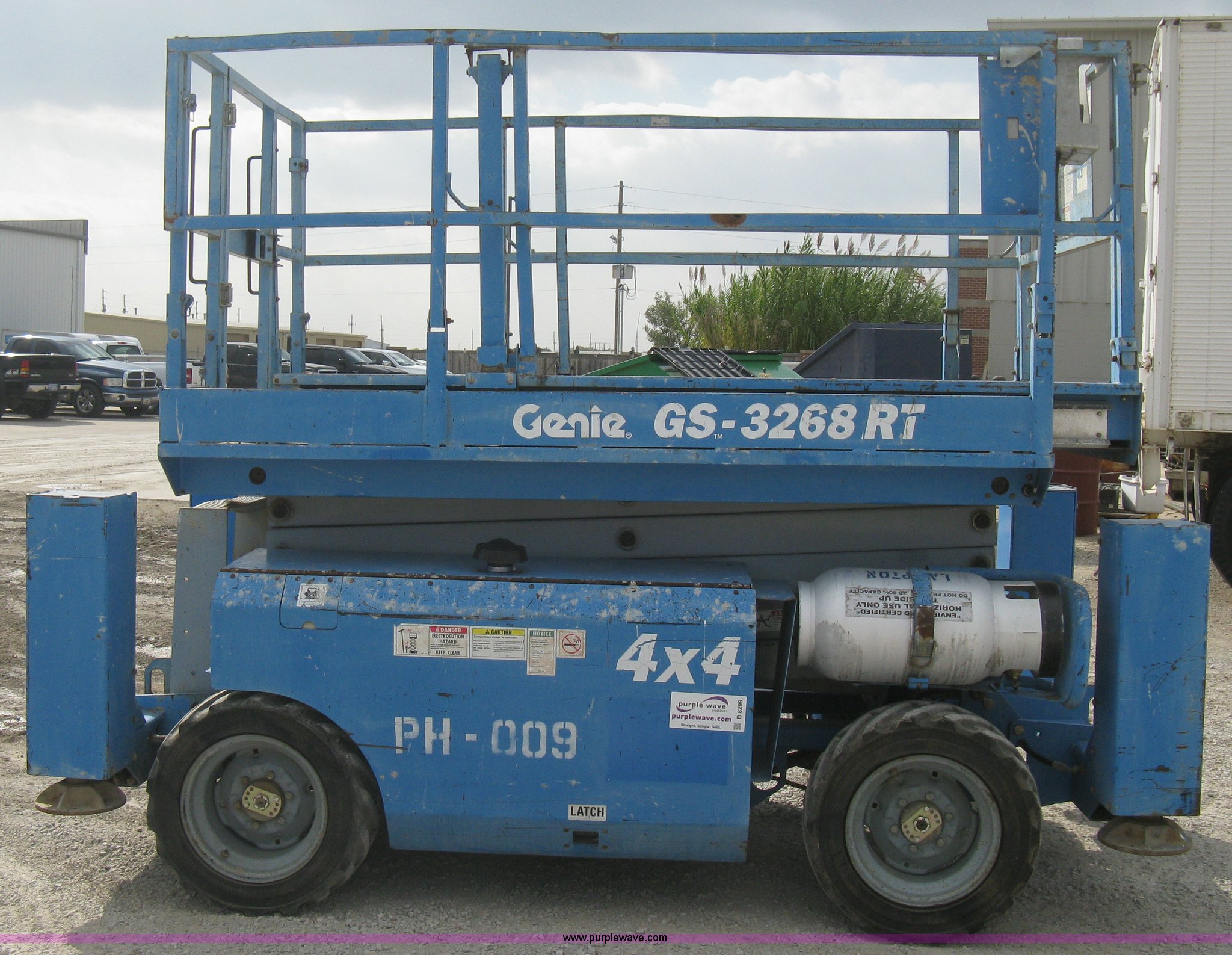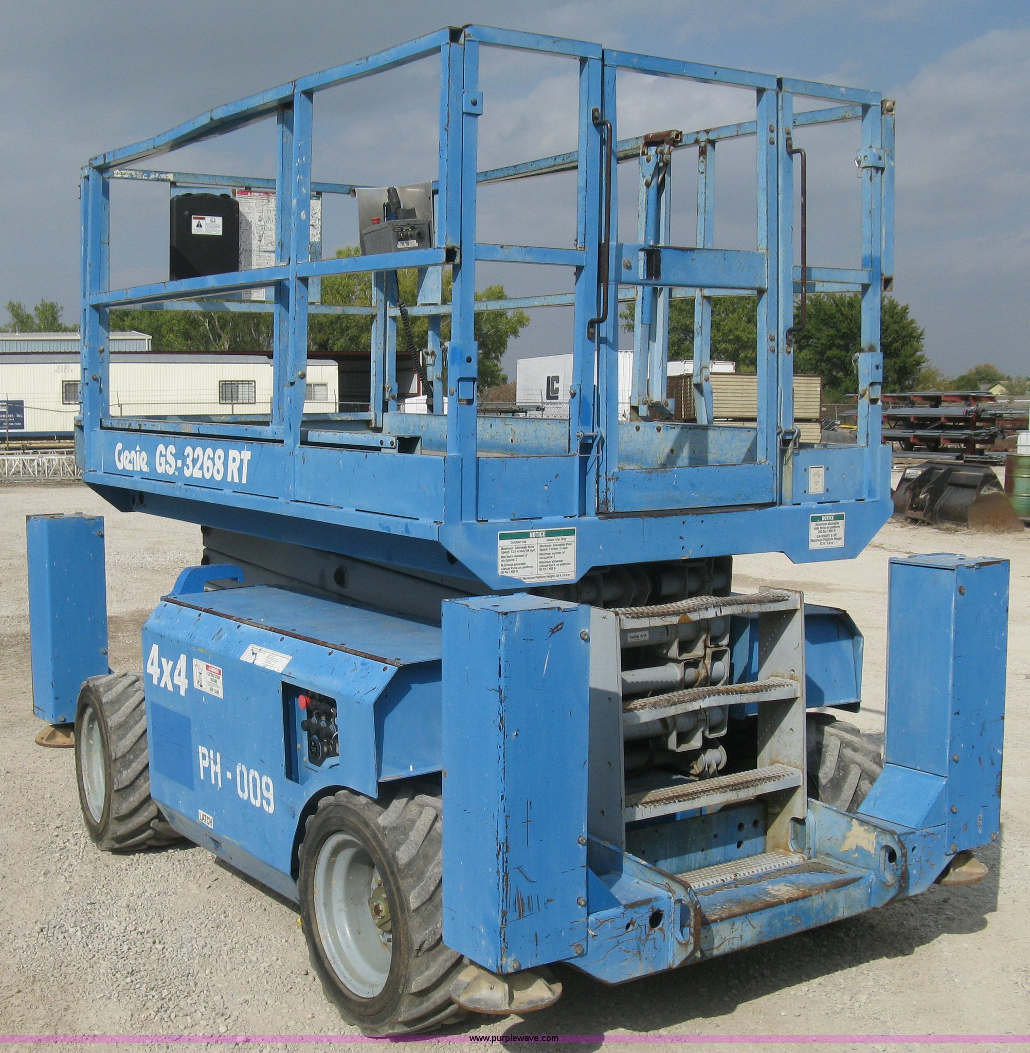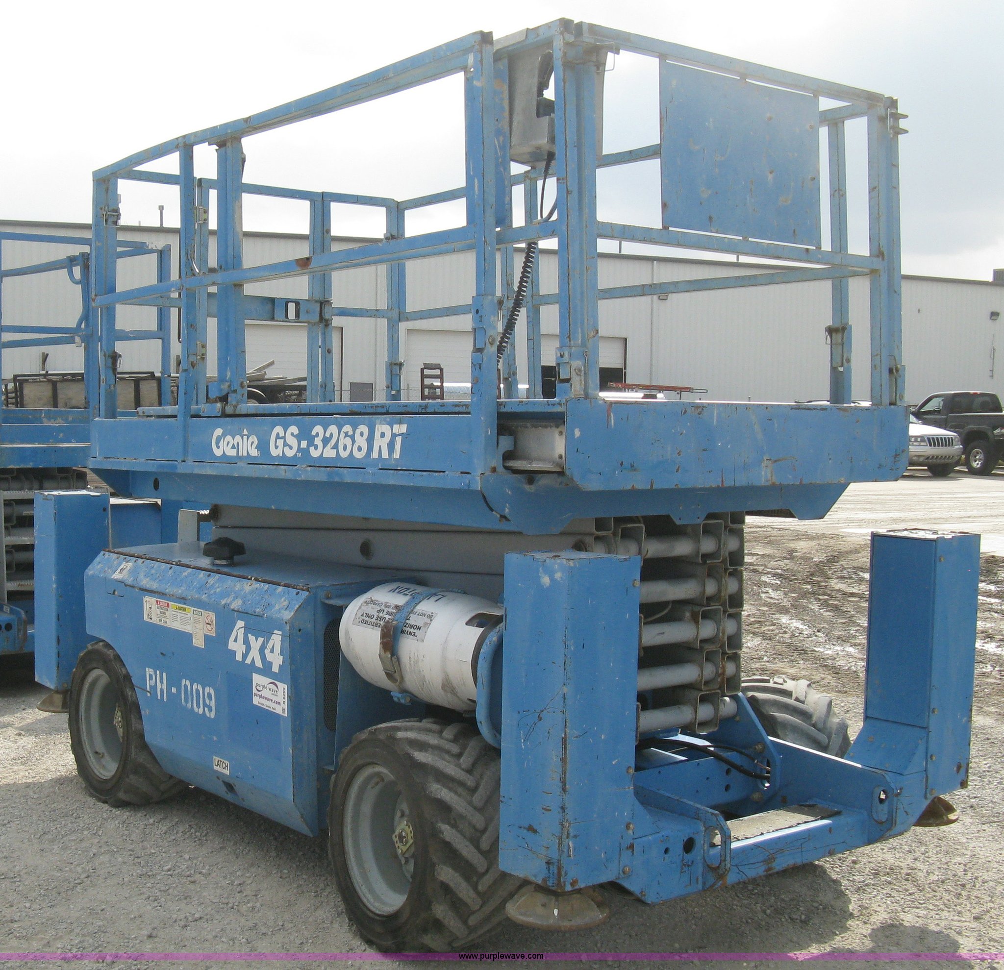2003 Genie GS-3268RT rough terrain scissor lift has sold in Wichita, Kansas for $9130. Item B8299 sold on October 25th, 2012.