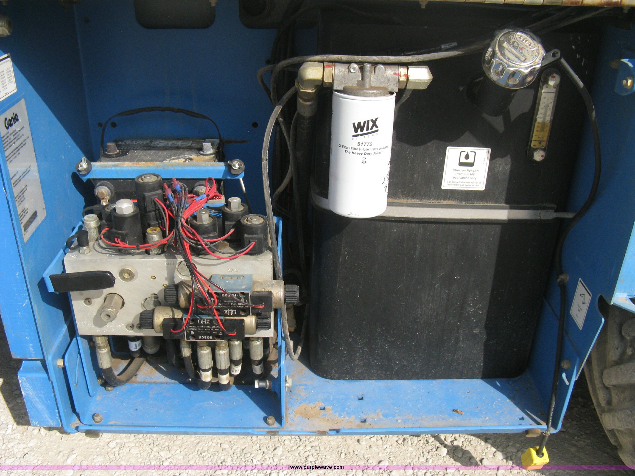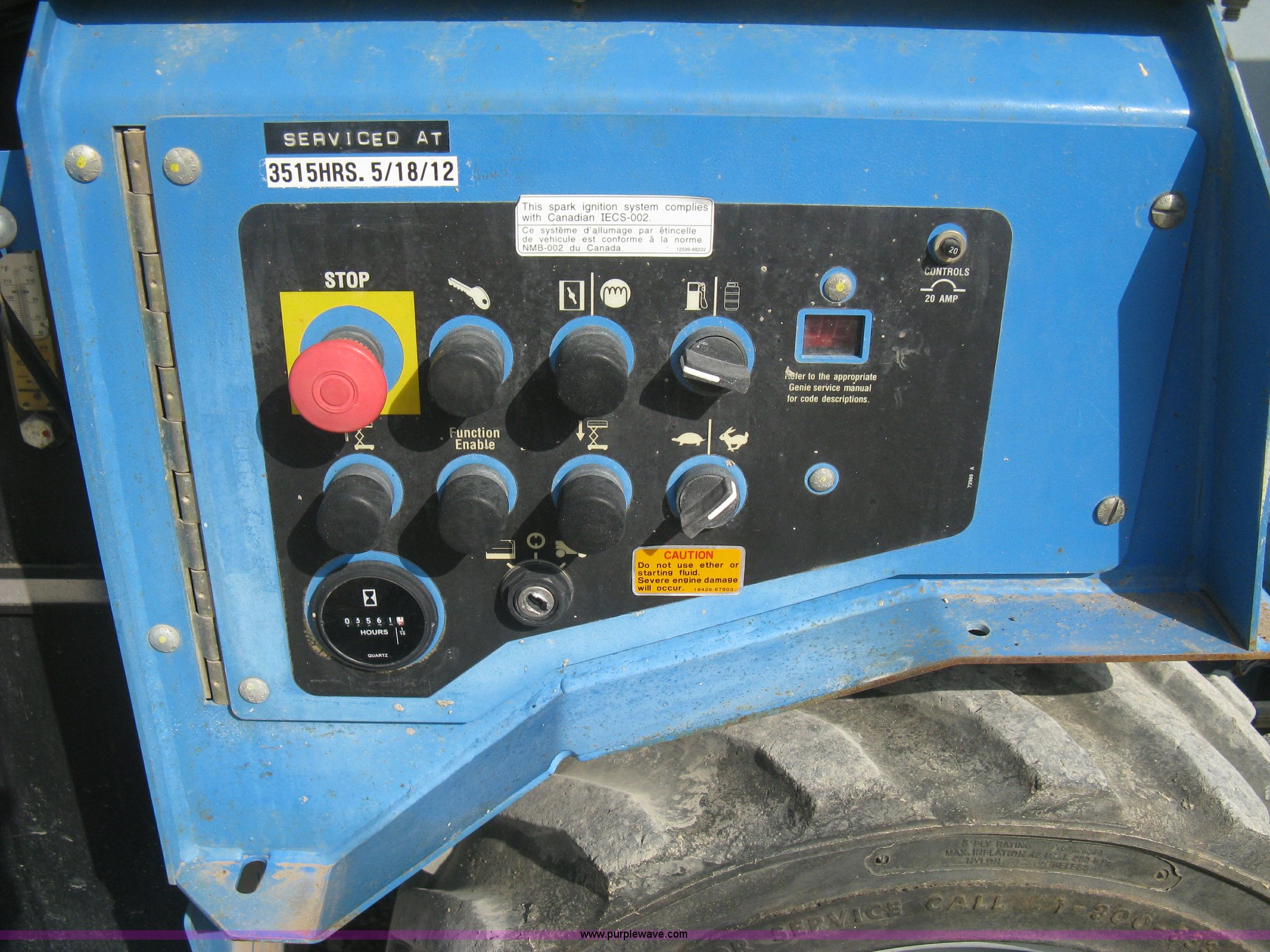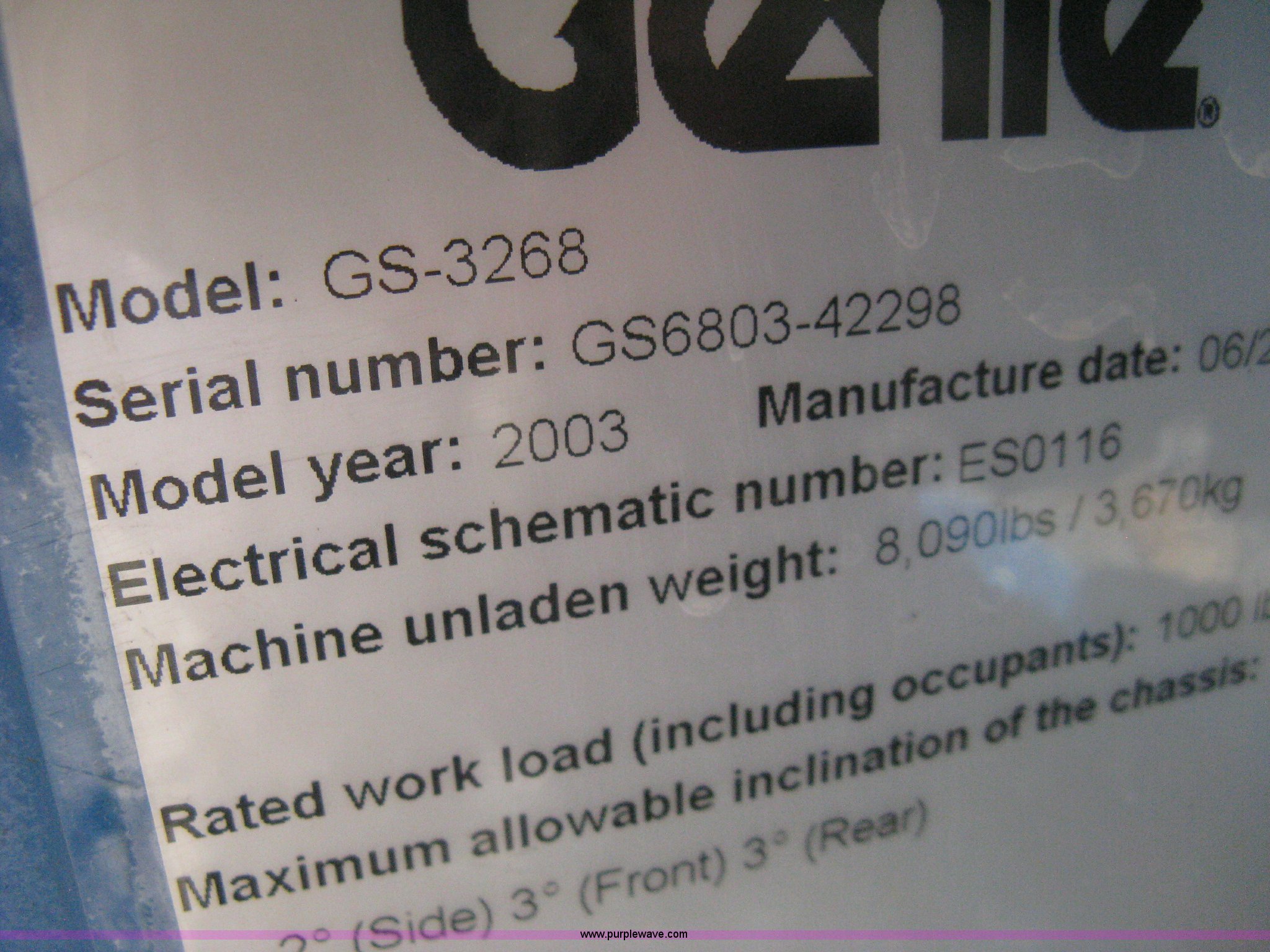 Purple Wave is selling a used Scissor or Vertical Lift in Kansas. This item is a 2003 Genie GS-3268RT rough terrain scissor lift with the following: 3,560 hours on meter, Three cylinder dual fuel engine, Gas or propane, Four wheel drive, 32' max platform height, 1,000 lb load rating, Four person platform, GVW 8,090 lbs, (4) hydraulic outriggers, Slide-out extension platform, 26x12D380NHS tires, Foam filled, All hubs replaced per manufacturer recall, Propane bottle not included, Serial GS6803-42298, ID# PH-009