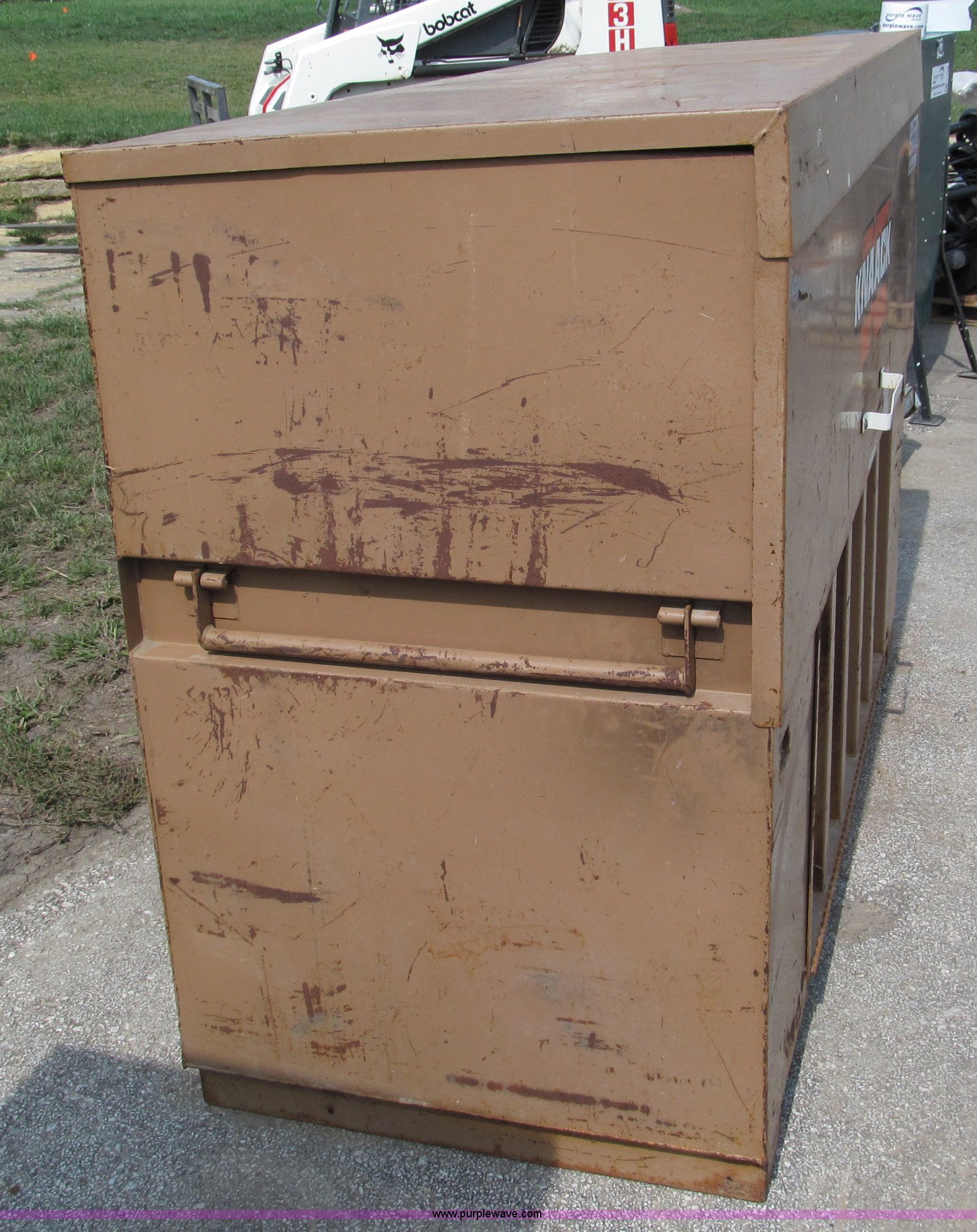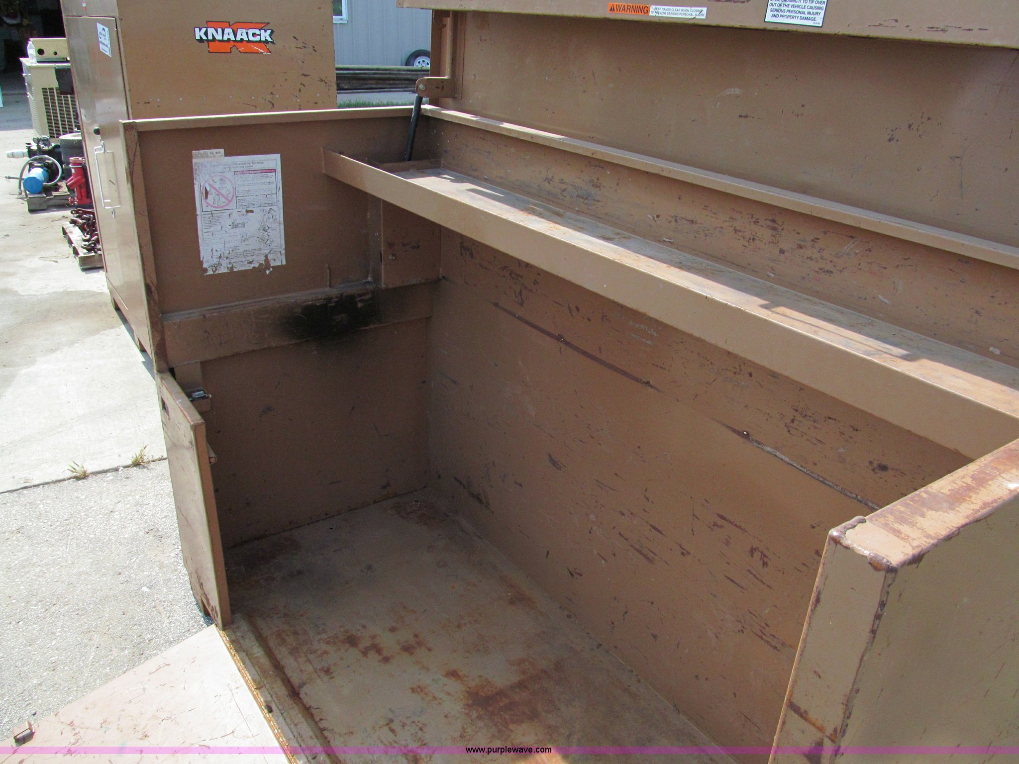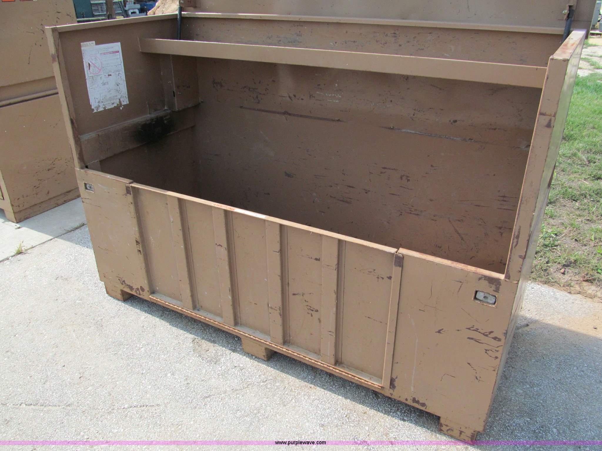 Purple Wave is selling a used Tools in Missouri. This item is a Knaack Storage Master 91 commercial job site box with the following: 72"W x 30"D x 48"H, Interior shelf, Lockable, Forklift base, Carrying handles