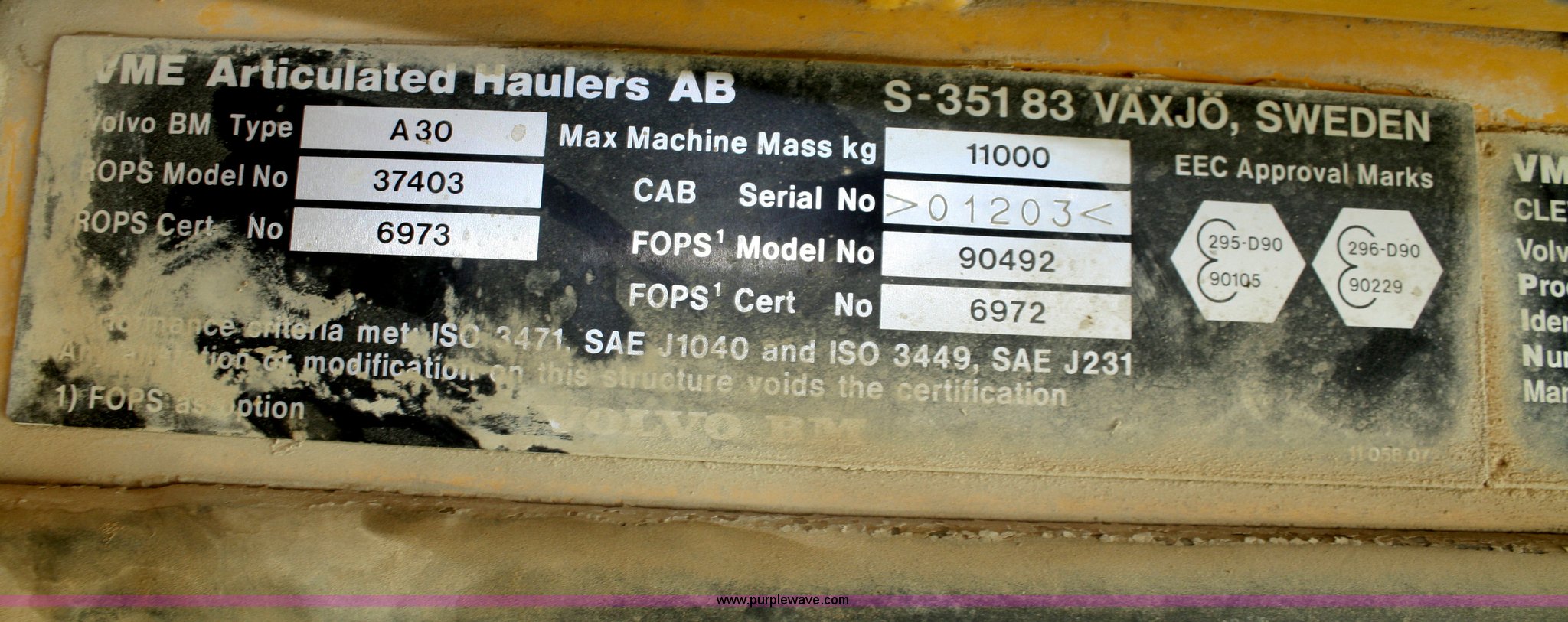 Purple Wave is selling a used Articulated Haul Truck in Kansas. This item is a 1992 Volvo Bm A30 haul truck with the following: 78,452 miles on odometer, 22,561 hours on meter, Volvo six cylinder diesel engine, 285 HP, Automatic transmission, 6F-2R gears, Six wheel drive, AC and heat, AC inoperable, 21.6 cu. yd. capacity, 23.5R25 tires, 46,076 lbs. base operating weight, Frame is broken, Serial A30V1203