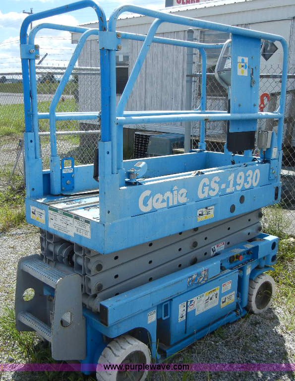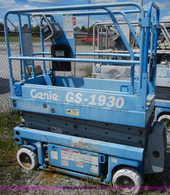 Purple Wave is selling a used Scissor or Vertical Lift in Tennessee. This item is a Genie GS1930 scissor lift with the following: 19' max lift height, 500 lb max lift, 48v, 12x4.5-8 tires, Plugin to 110v charge