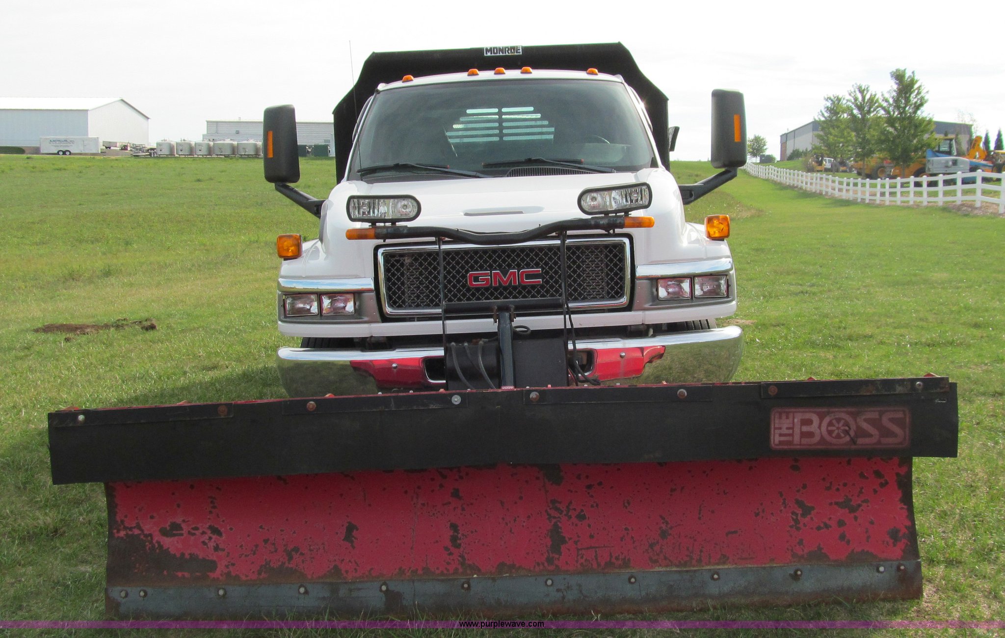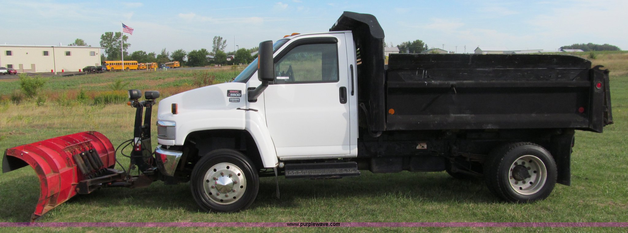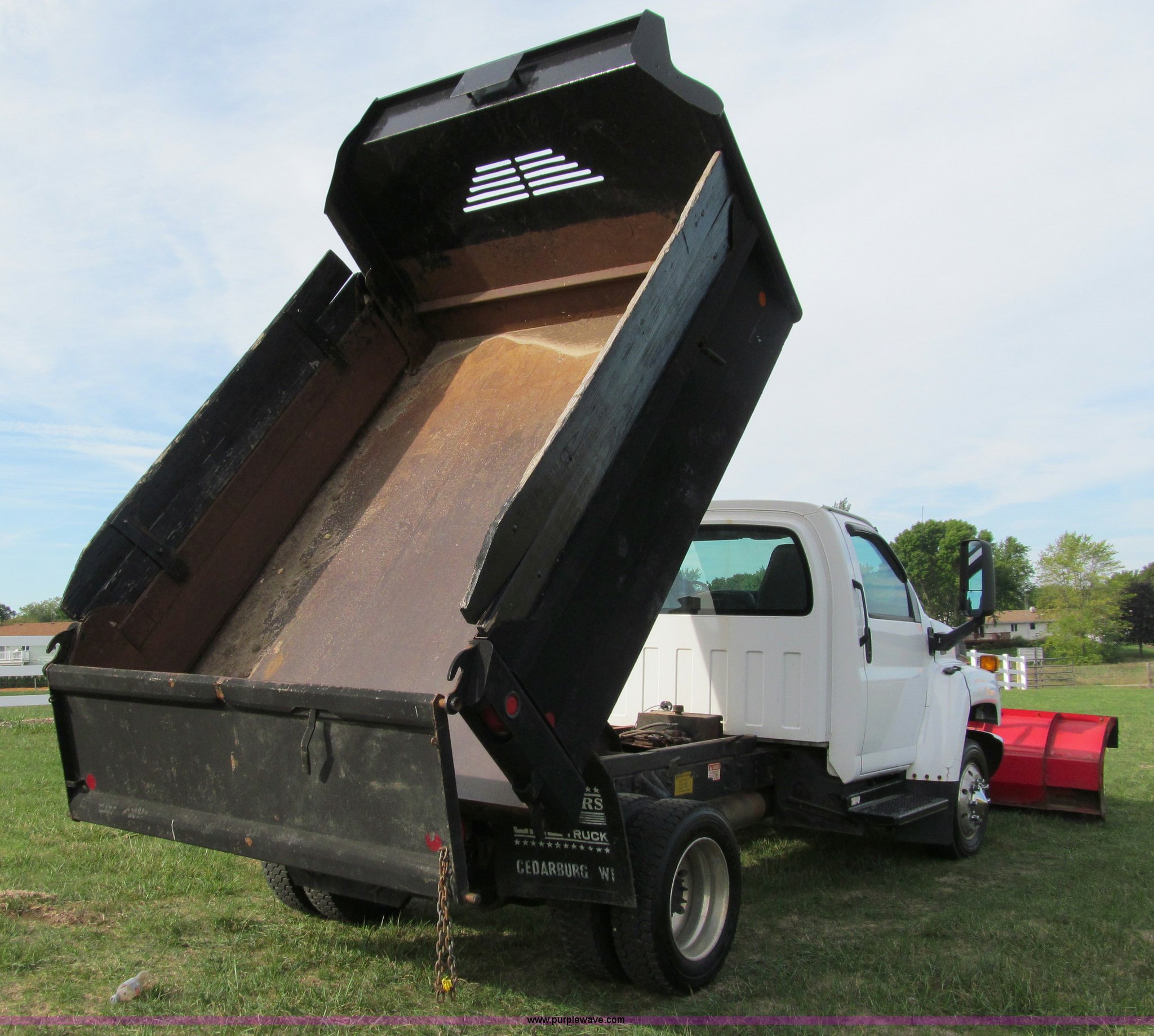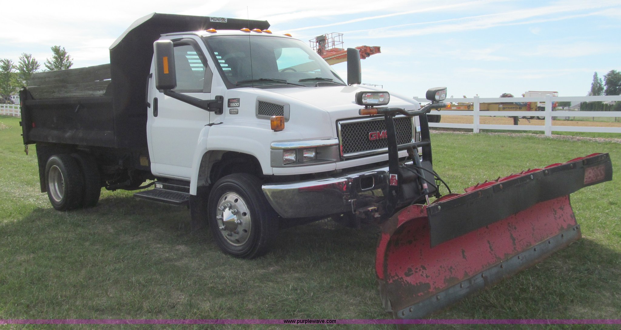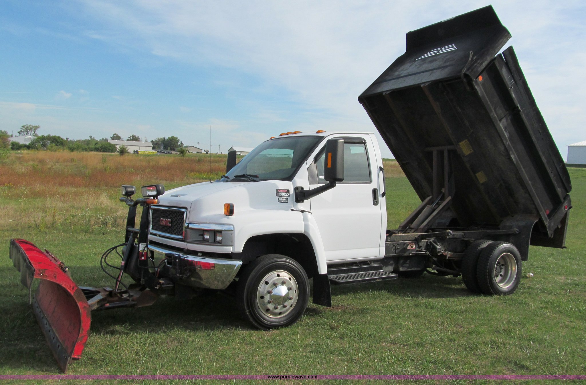 Purple Wave is selling a used Construction Dump Truck in Wisconsin. This item is a 2004 GMC C5500 dump truck with the following: 34,214 miles on odometer, Duramax Isuzu 6.6L V8 diesel engine, Model 8GF1XS, 300 HP, Automatic transmission, AC and heat, AM/FM/CD, Power windows and locks, Air ride seat, Vinyl seats, Folding mirrors, Electric PTO, Hydraulic hoist, Boss 10' snow plow with light package, Boss quick coupler, Boss handheld operator joystick, Monroe 10' dump box, Fold down sides and tailgate, Monroe dump controls, Dual fuel tanks, Spring suspension, Aluminum wheels, 225/70R19.5 tires, GVWR 19,500 lbs, FAWR 7,000 lbs, RAWR 13,500 lbs, Right front fender cracking, Cosmetic damage