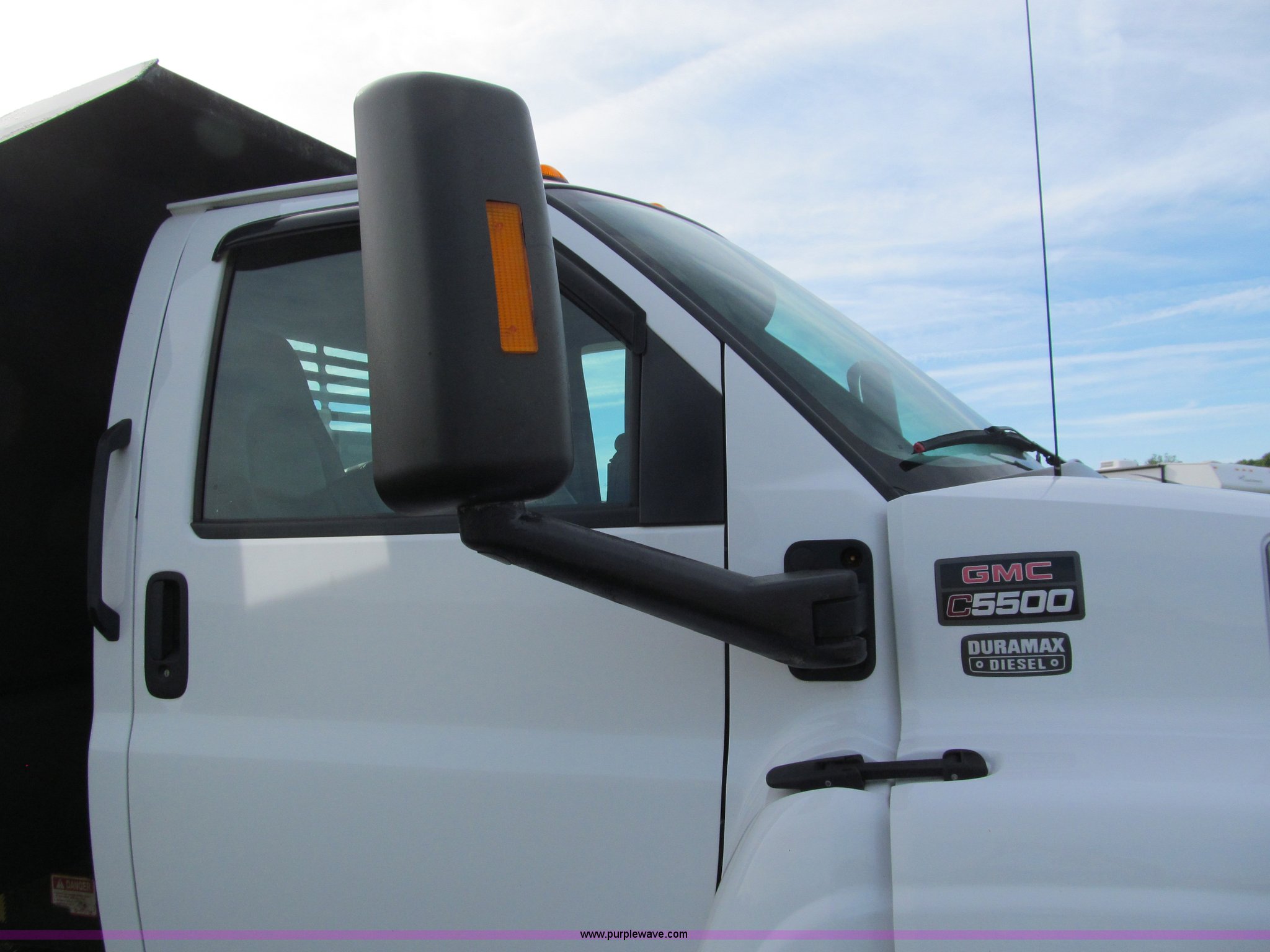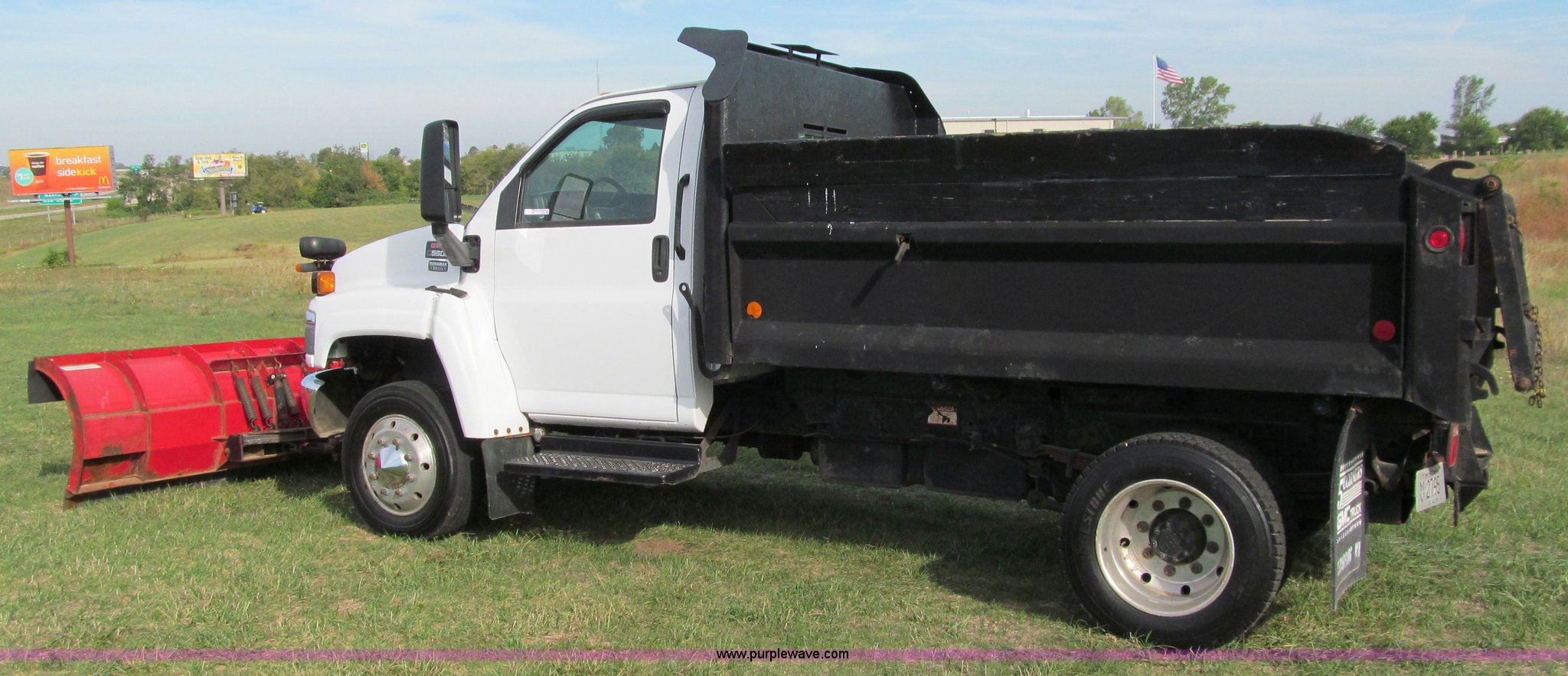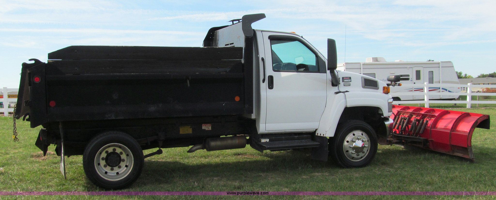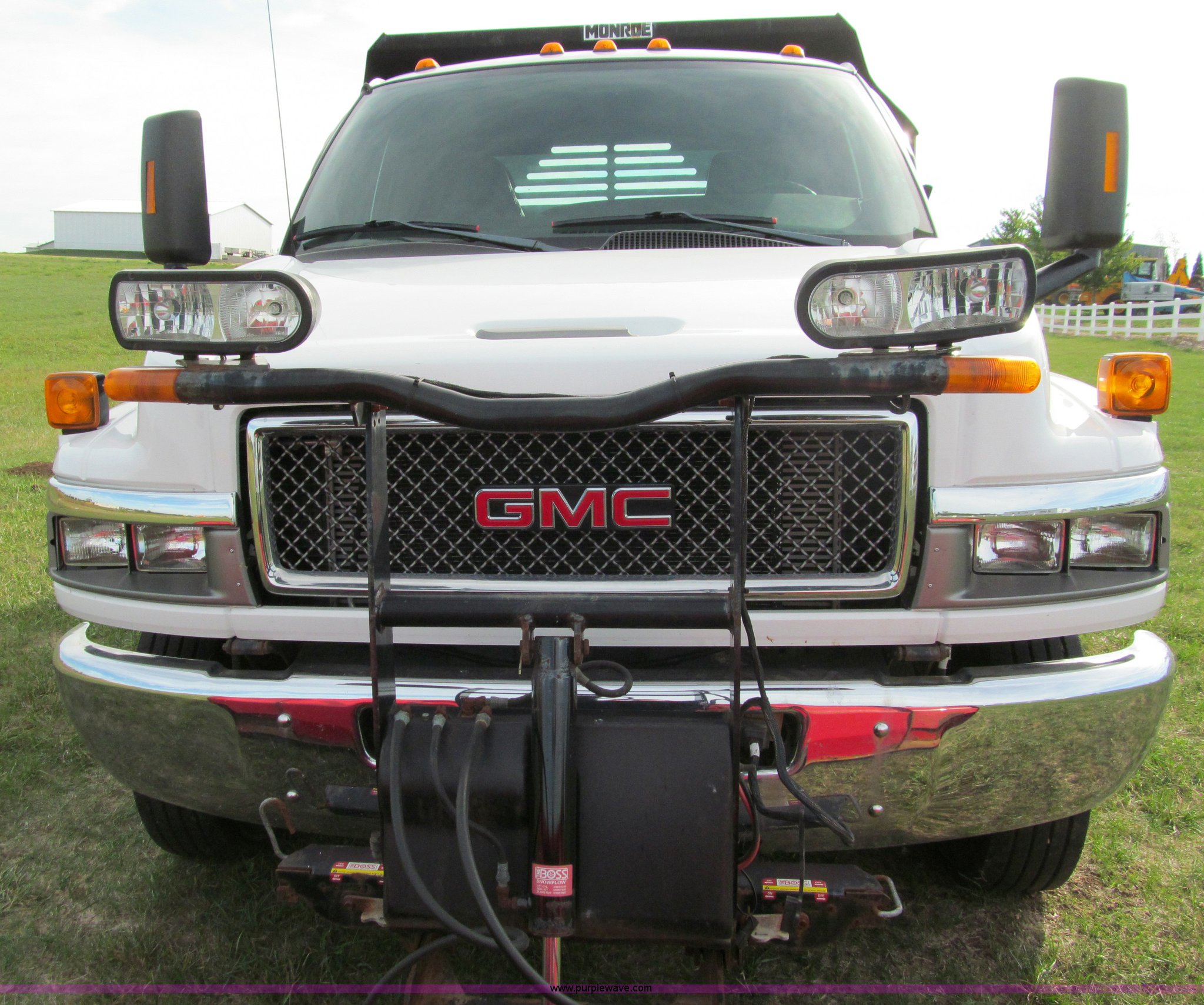 Purple Wave is selling a used Construction Dump Truck in Wisconsin. This item is a 2004 GMC C5500 dump truck with the following: 34,214 miles on odometer, Duramax Isuzu 6.6L V8 diesel engine, Model 8GF1XS, 300 HP, Automatic transmission, AC and heat, AM/FM/CD, Power windows and locks, Air ride seat, Vinyl seats, Folding mirrors, Electric PTO, Hydraulic hoist, Boss 10' snow plow with light package, Boss quick coupler, Boss handheld operator joystick, Monroe 10' dump box, Fold down sides and tailgate, Monroe dump controls, Dual fuel tanks, Spring suspension, Aluminum wheels, 225/70R19.5 tires, GVWR 19,500 lbs, FAWR 7,000 lbs, RAWR 13,500 lbs, Right front fender cracking, Cosmetic damage