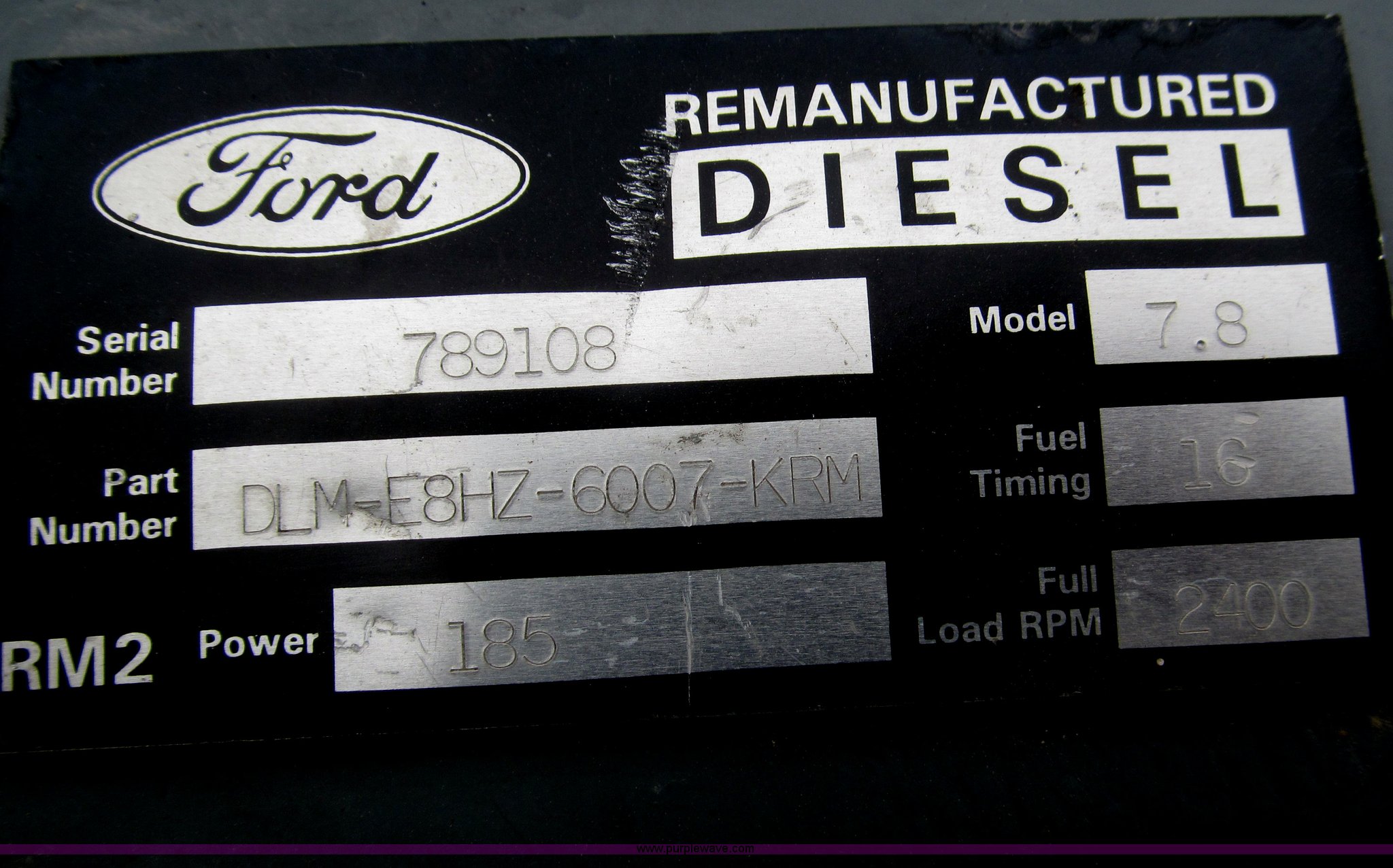 Purple Wave is selling a used Tools in Nebraska. This item is a Ford 7.8L six cylinder re-manufactured diesel engine with the following: Part DLM-F8HZ-6007-KRM, 185 HP, Turbo, 2,400 RPM full load, Eaton manual transmission, Reman# 286485X, Serial 20401, Operational when removed, Removed from two ton Ford flatbed, Fan blade bent, Serial 789108
