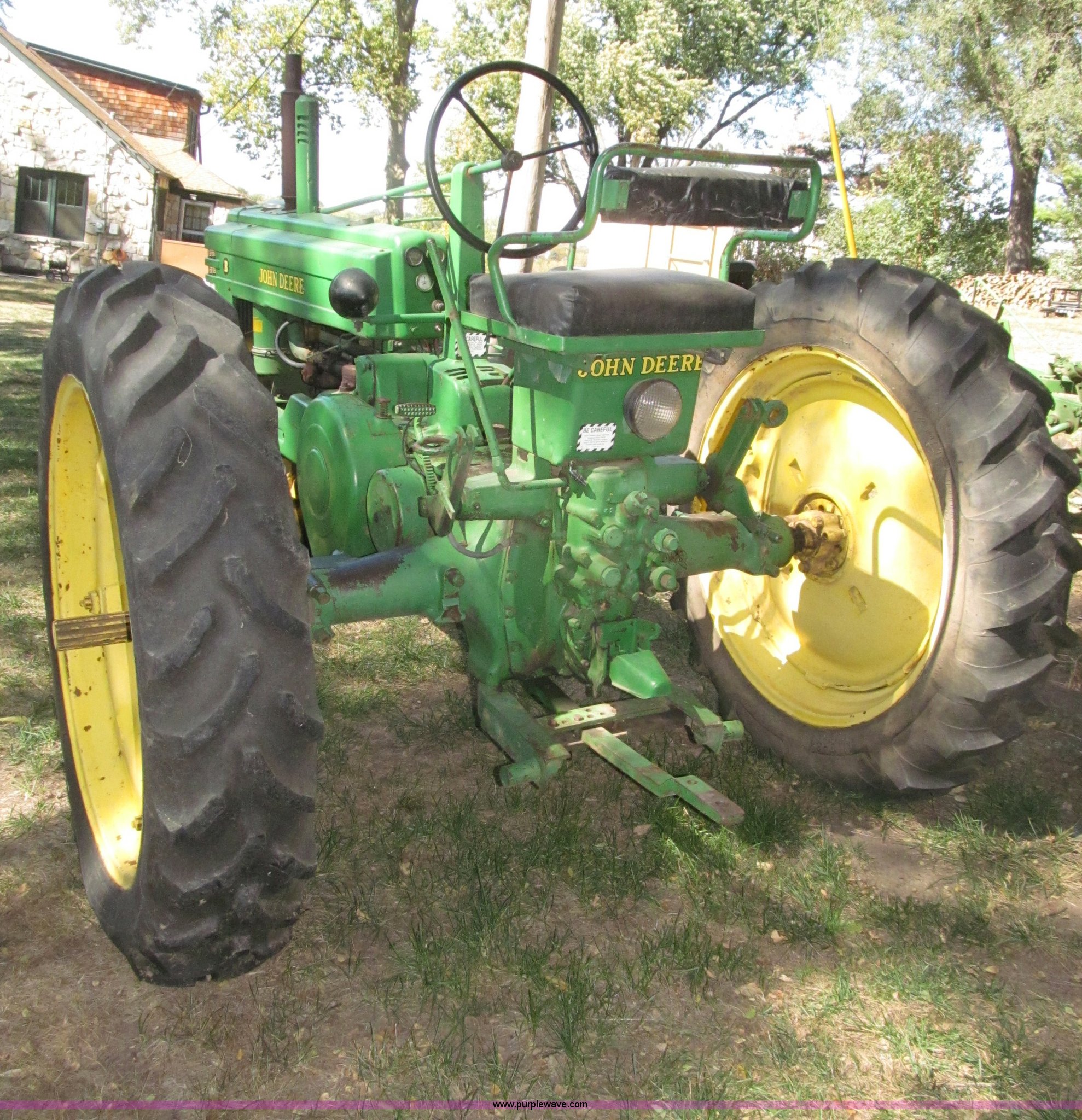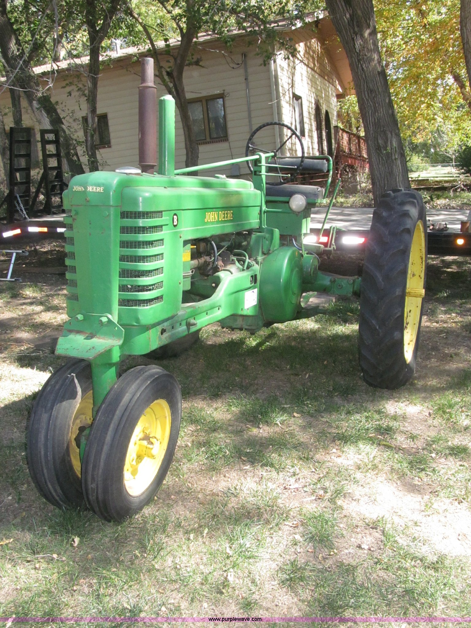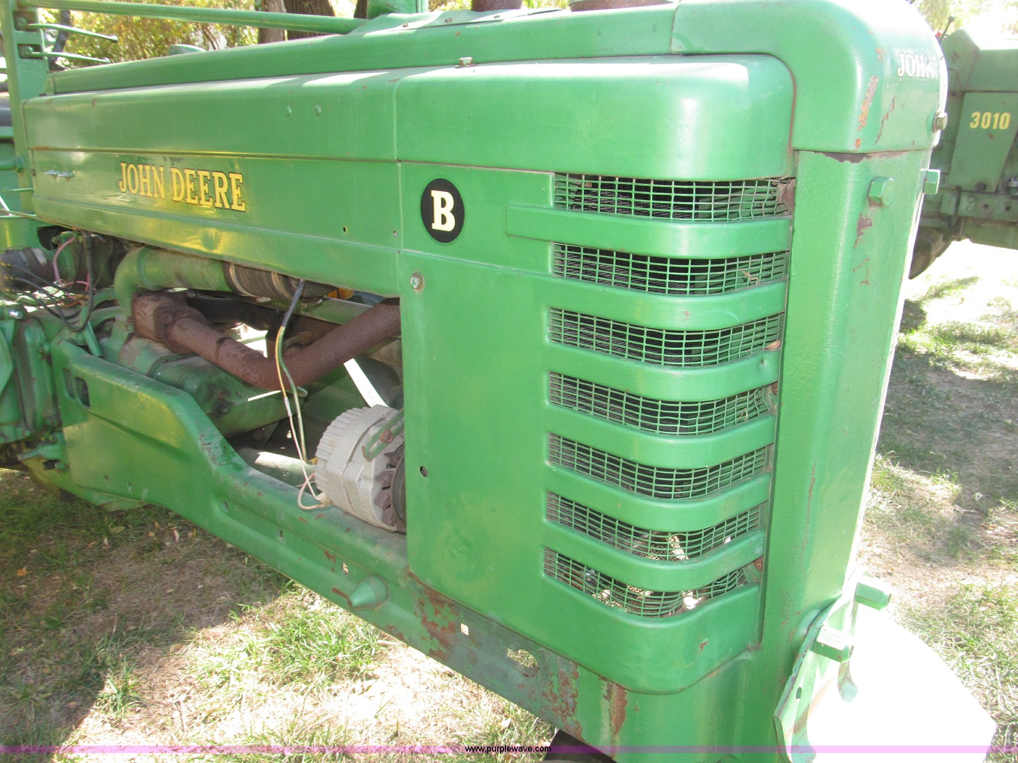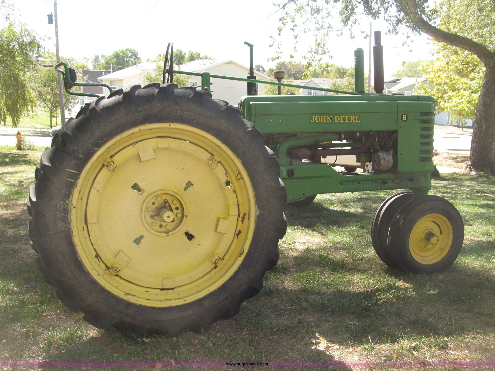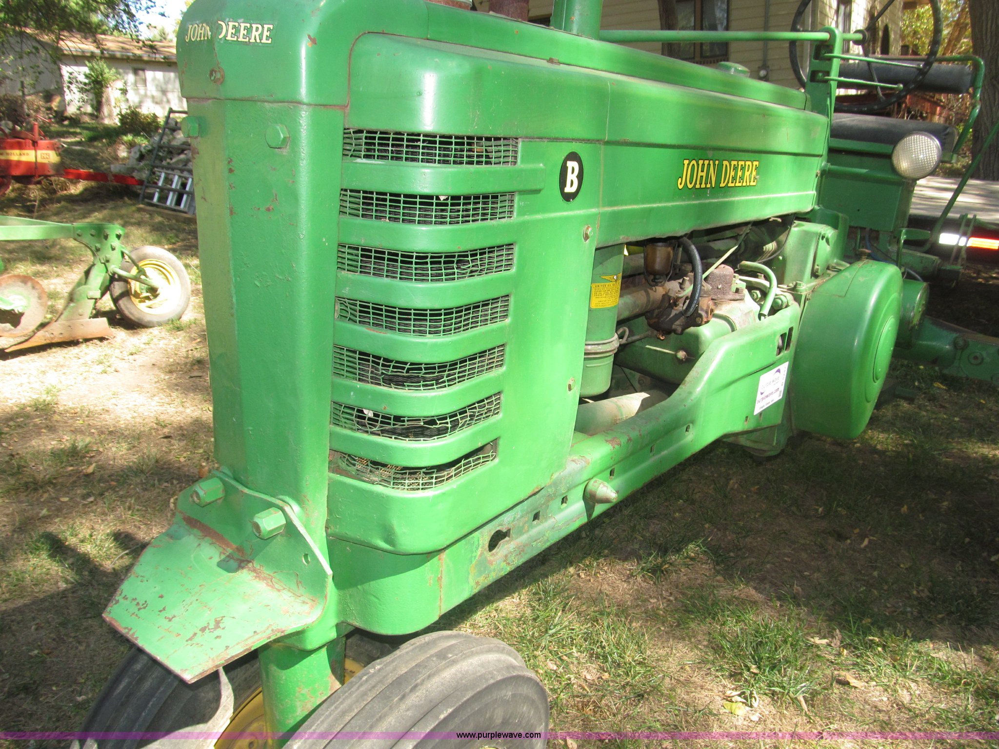 Purple Wave is selling a used Tractor in Nebraska. This item is a 1947 John Deere B tractor with the following: John Deere 2.4L two cylinder gas engine, 12 HP, Manual transmission, 6F-1R gears, Spring seat, Draw bar, 540 PTO, Powertrol, Front and rear lights, Toolbox, Foot operated starter, Rollamatic front end, Hand clutch, Recently rebuilt carburetor and radiator, Recently replaced lugs, point, and battery, 12V system, Manual steering, Front bracket for attachment, 5.50-16SL front tires, 11.2-38 rear tires, 3,275 lbs. base operating weight, Service manual included