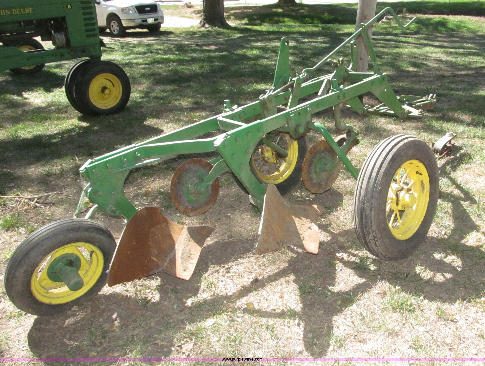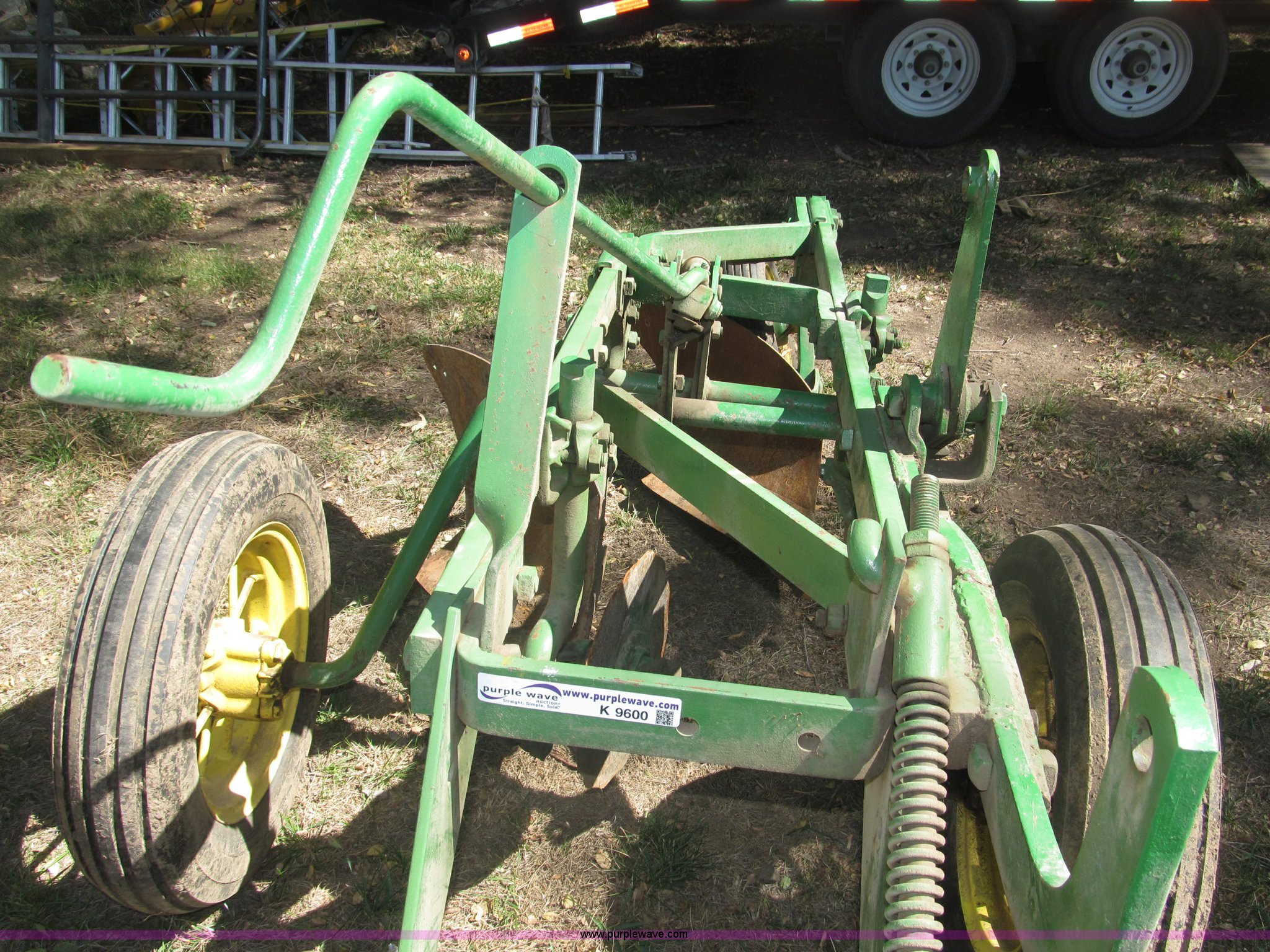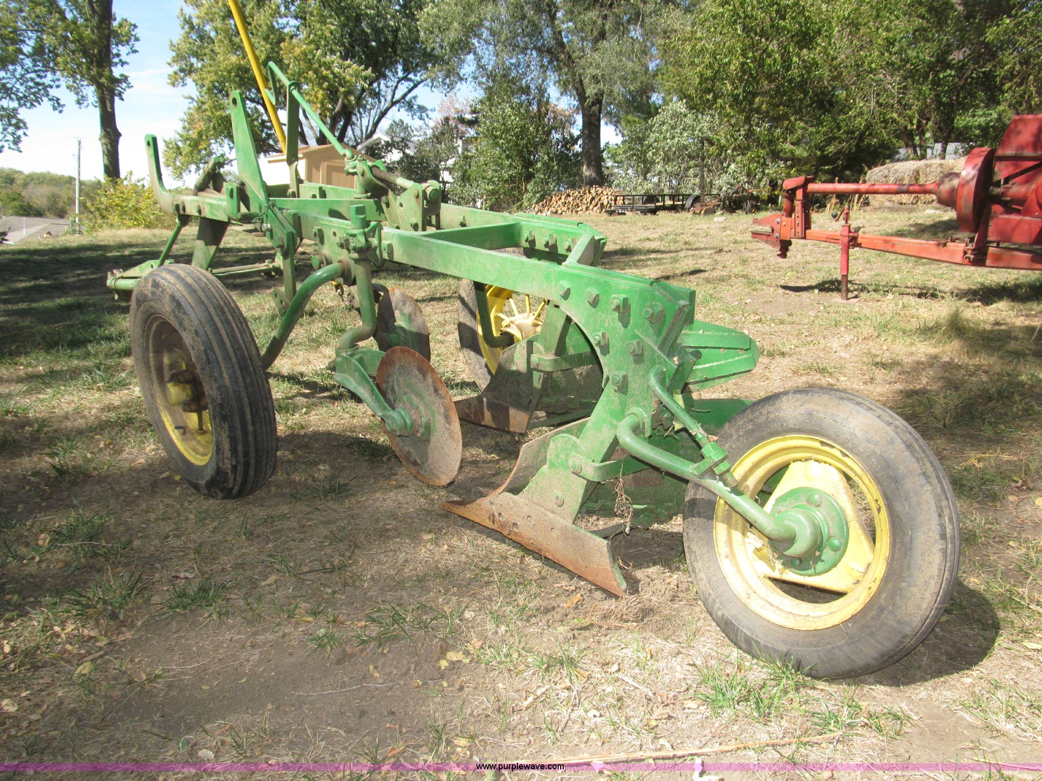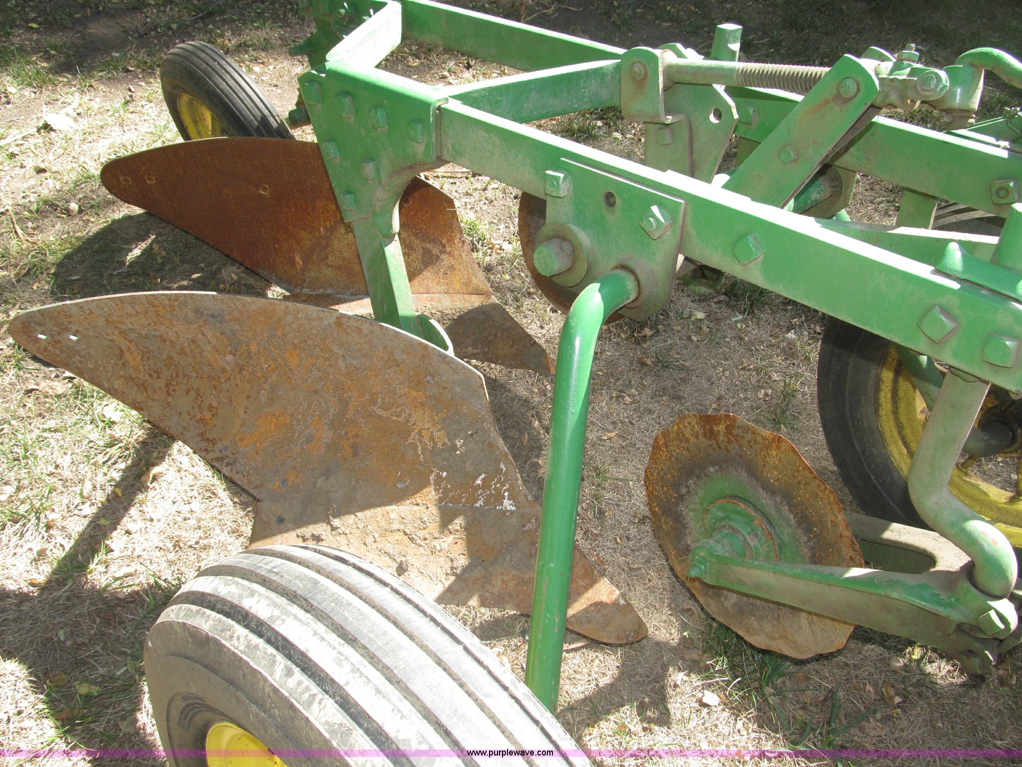 Purple Wave is selling a used Plow in Nebraska. This item is a John Deere 44 two bottom plow with the following: Manual depth adjust, Swivel cutters, Front cutter, Flute design/rear straight, Spring mounted hitch, adjustable, Custom hitch adapter for draw bar style, Approx. 3"W x 14.5" U-shape strap iron, 2.5" I.D. draw bar, 6.00-16SL front tires, 4.00-12SL rear tire