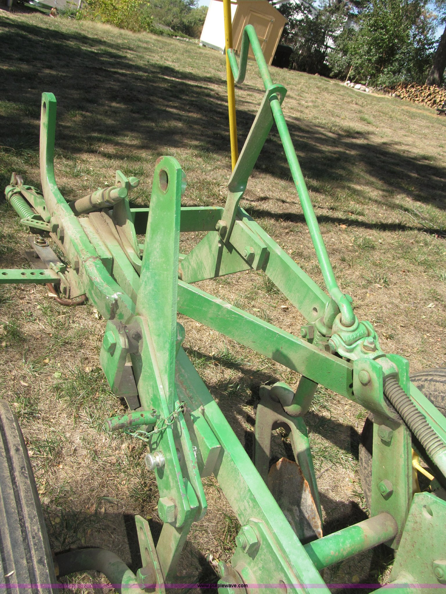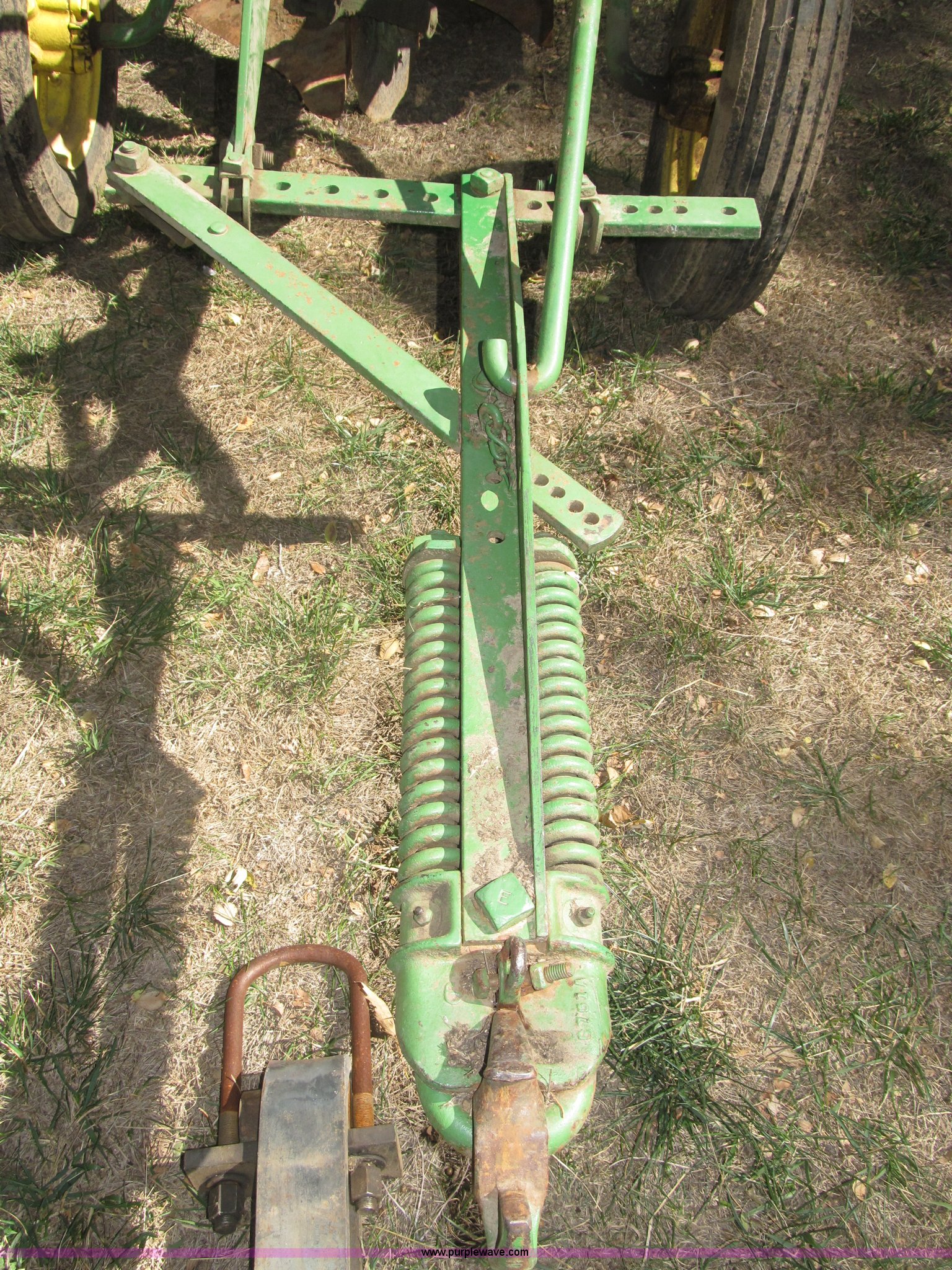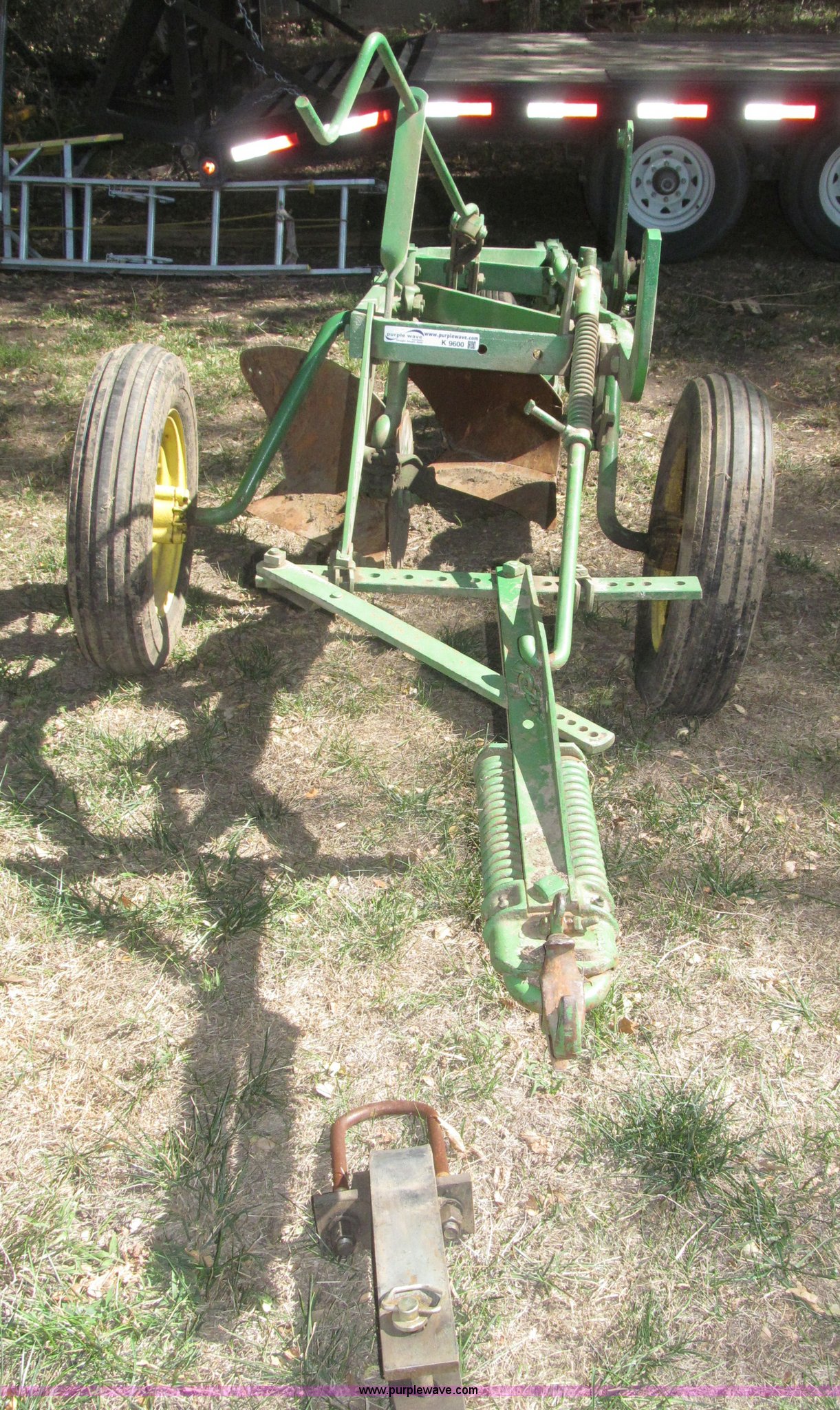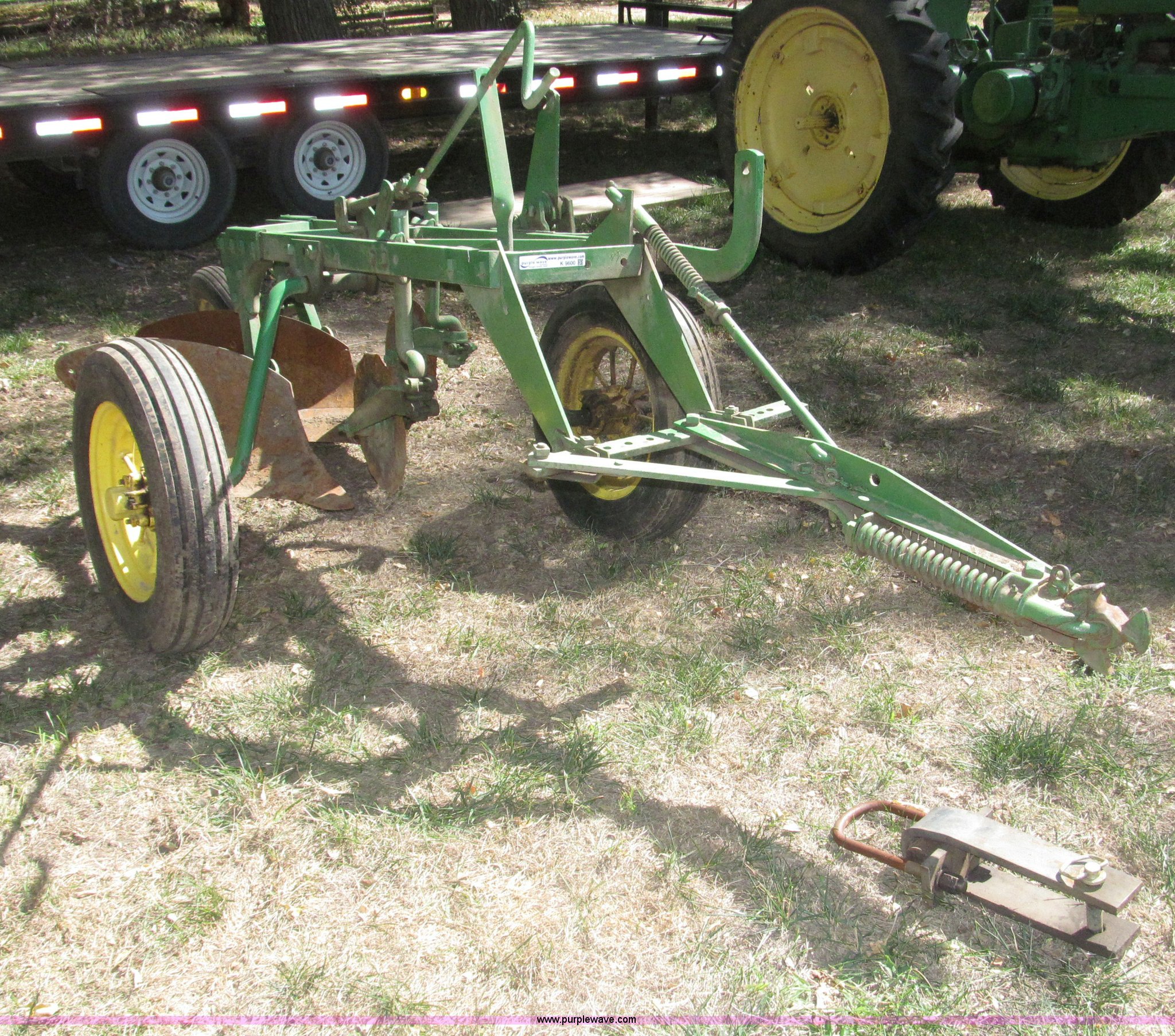 Purple Wave is selling a used Plow in Nebraska. This item is a John Deere 44 two bottom plow with the following: Manual depth adjust, Swivel cutters, Front cutter, Flute design/rear straight, Spring mounted hitch, adjustable, Custom hitch adapter for draw bar style, Approx. 3"W x 14.5" U-shape strap iron, 2.5" I.D. draw bar, 6.00-16SL front tires, 4.00-12SL rear tire