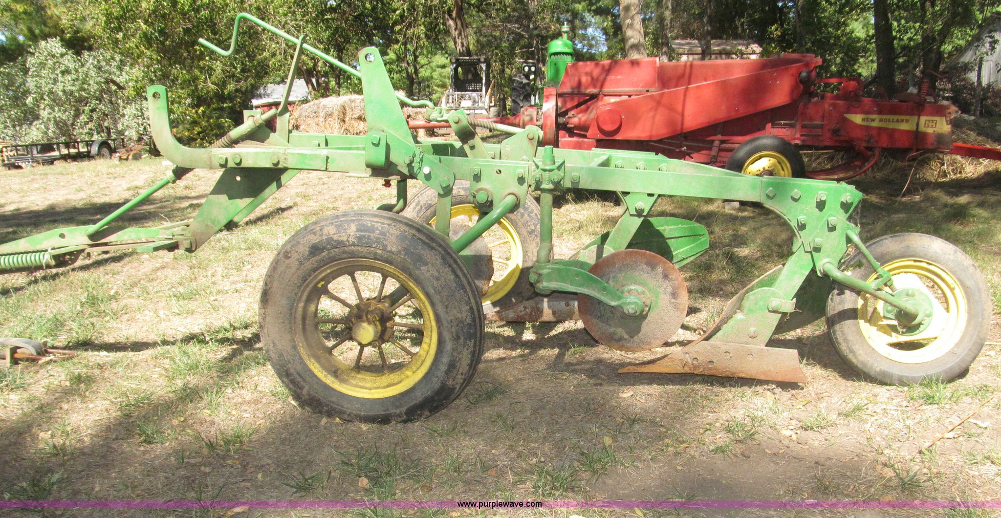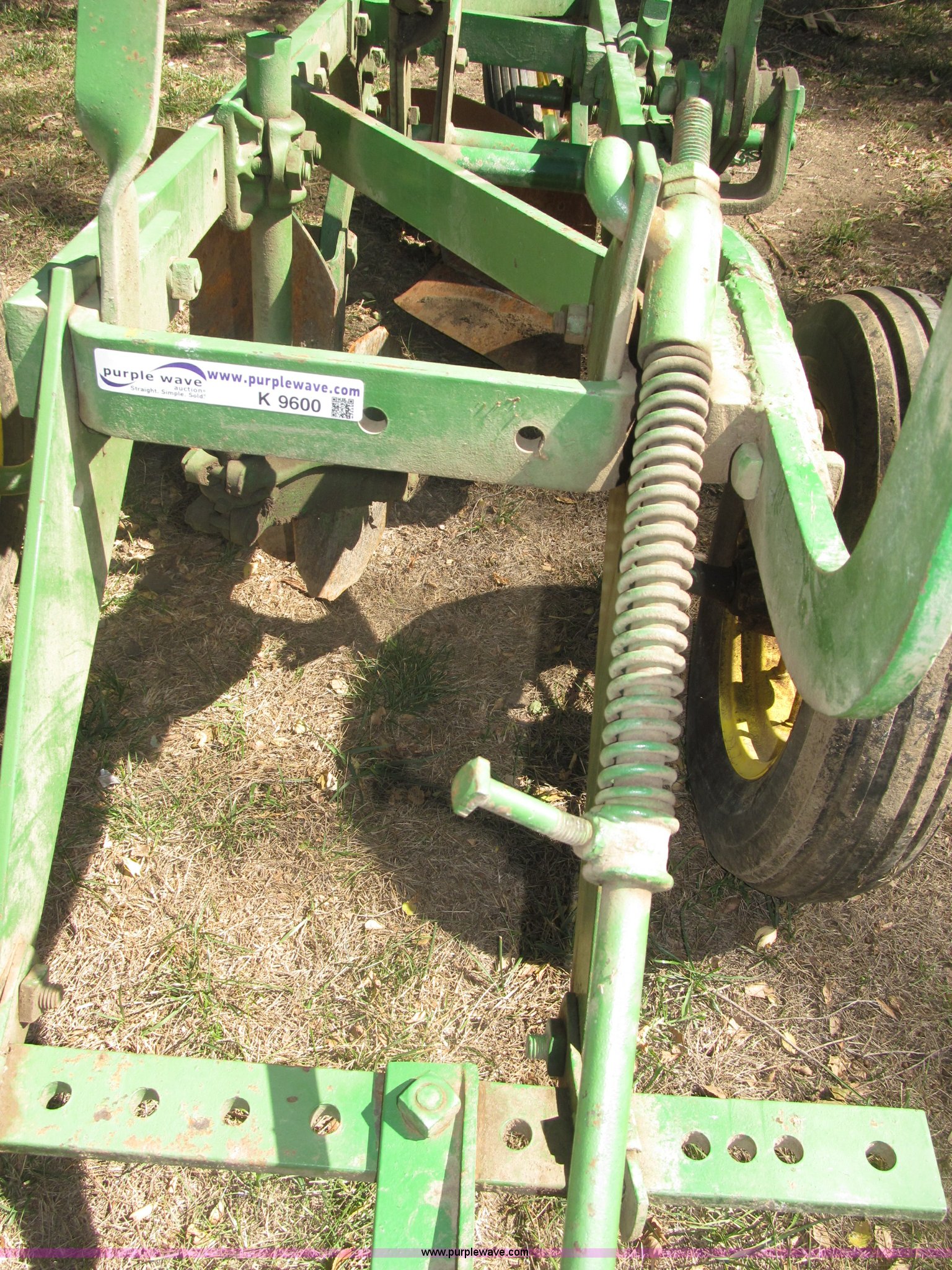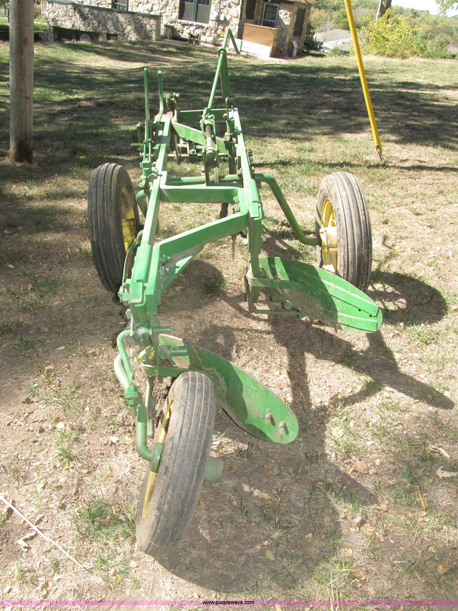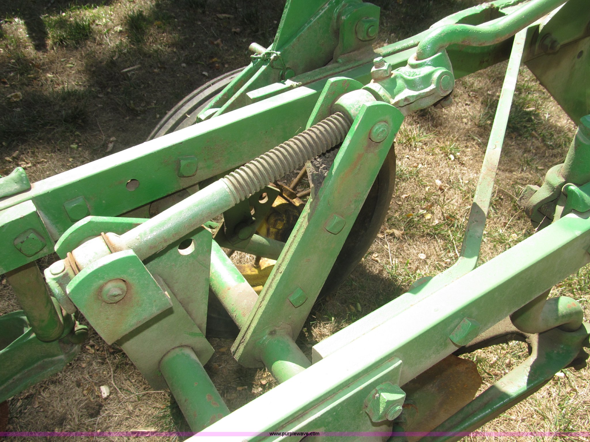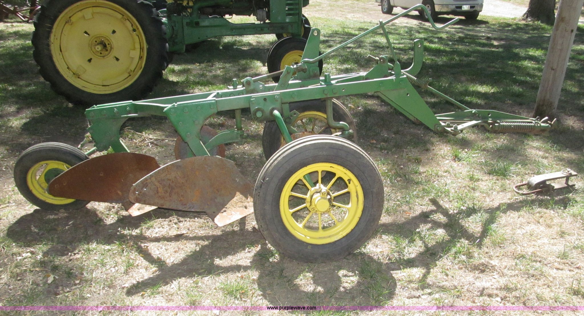 Purple Wave is selling a used Plow in Nebraska. This item is a John Deere 44 two bottom plow with the following: Manual depth adjust, Swivel cutters, Front cutter, Flute design/rear straight, Spring mounted hitch, adjustable, Custom hitch adapter for draw bar style, Approx. 3"W x 14.5" U-shape strap iron, 2.5" I.D. draw bar, 6.00-16SL front tires, 4.00-12SL rear tire