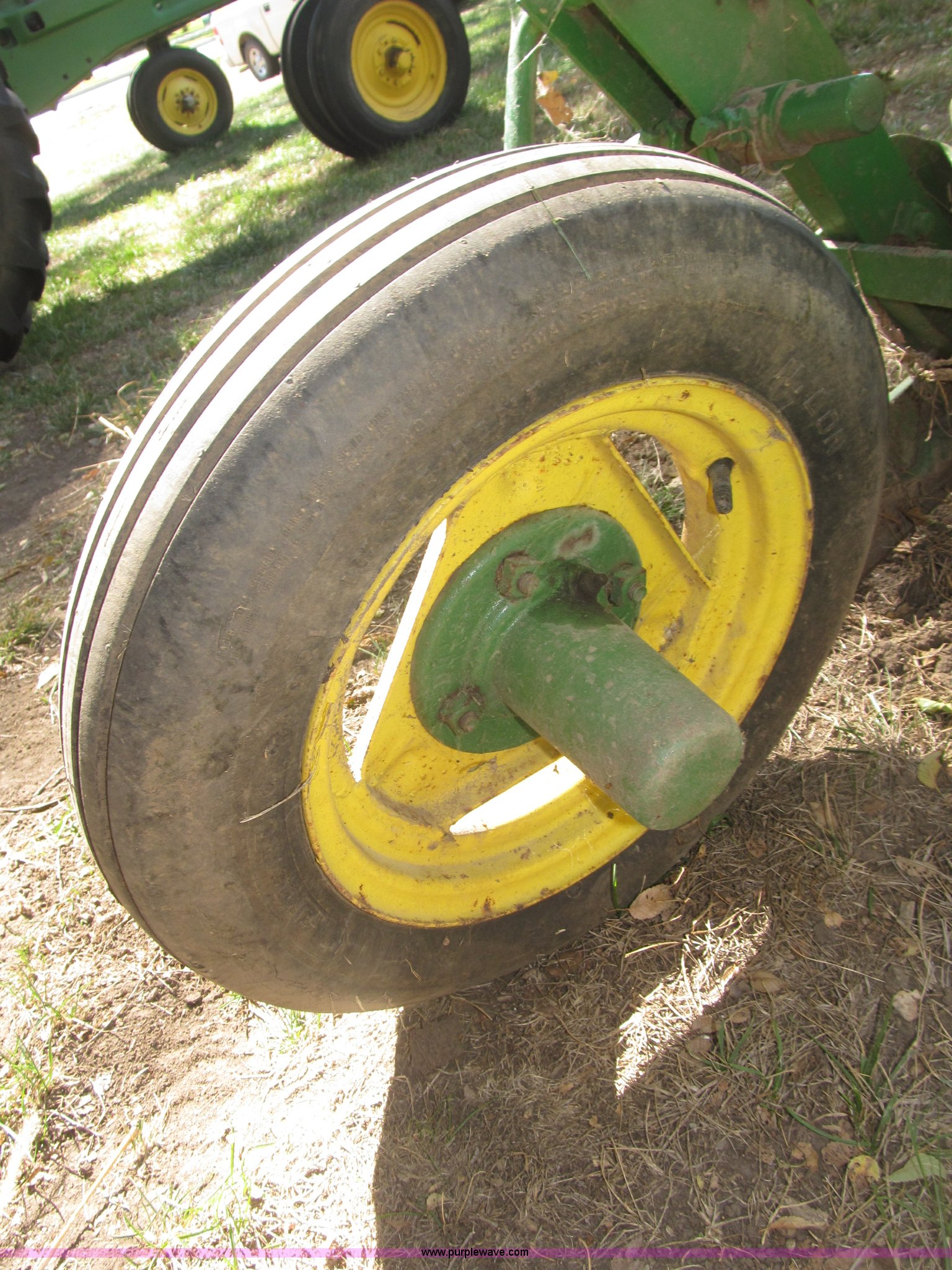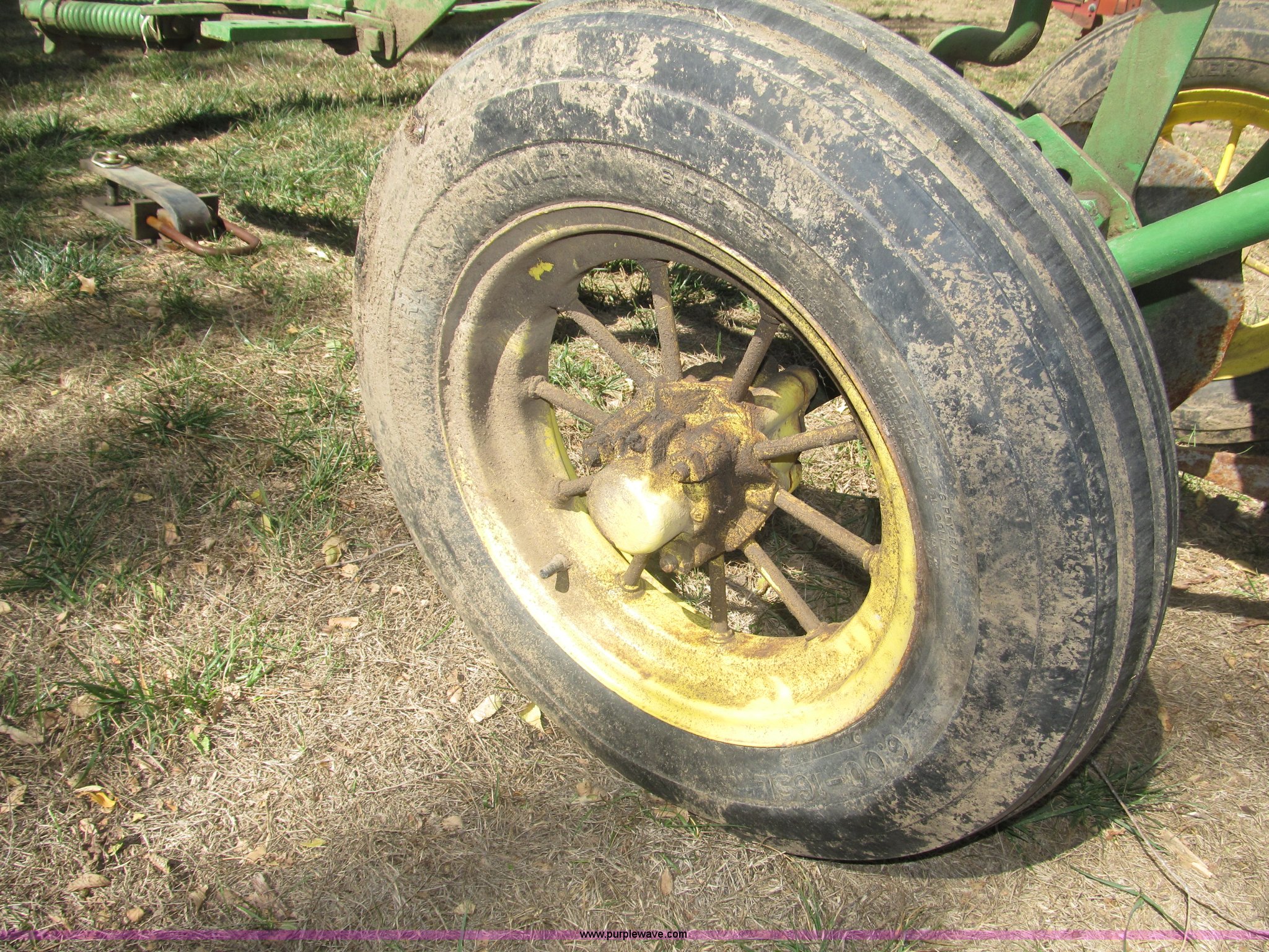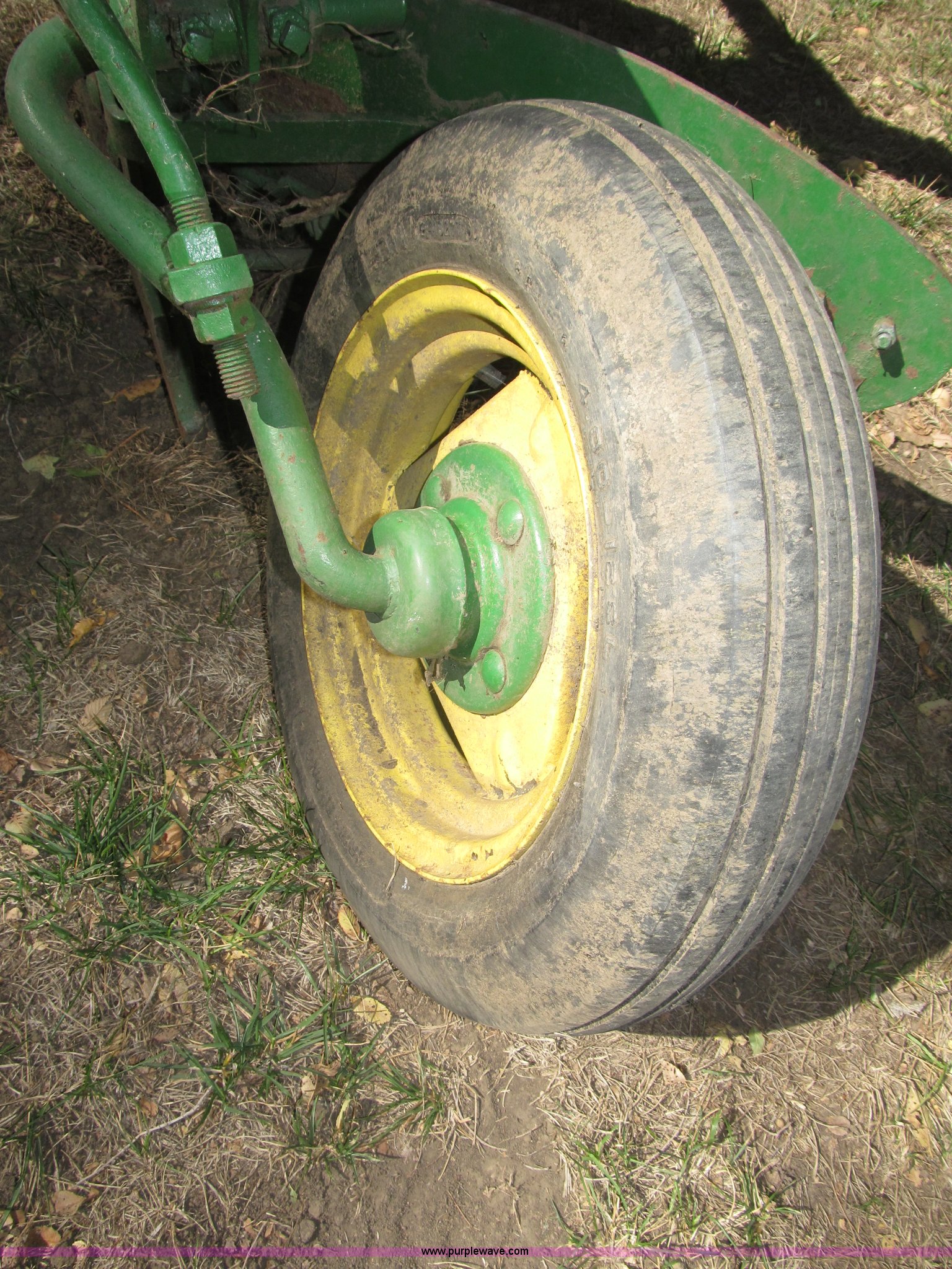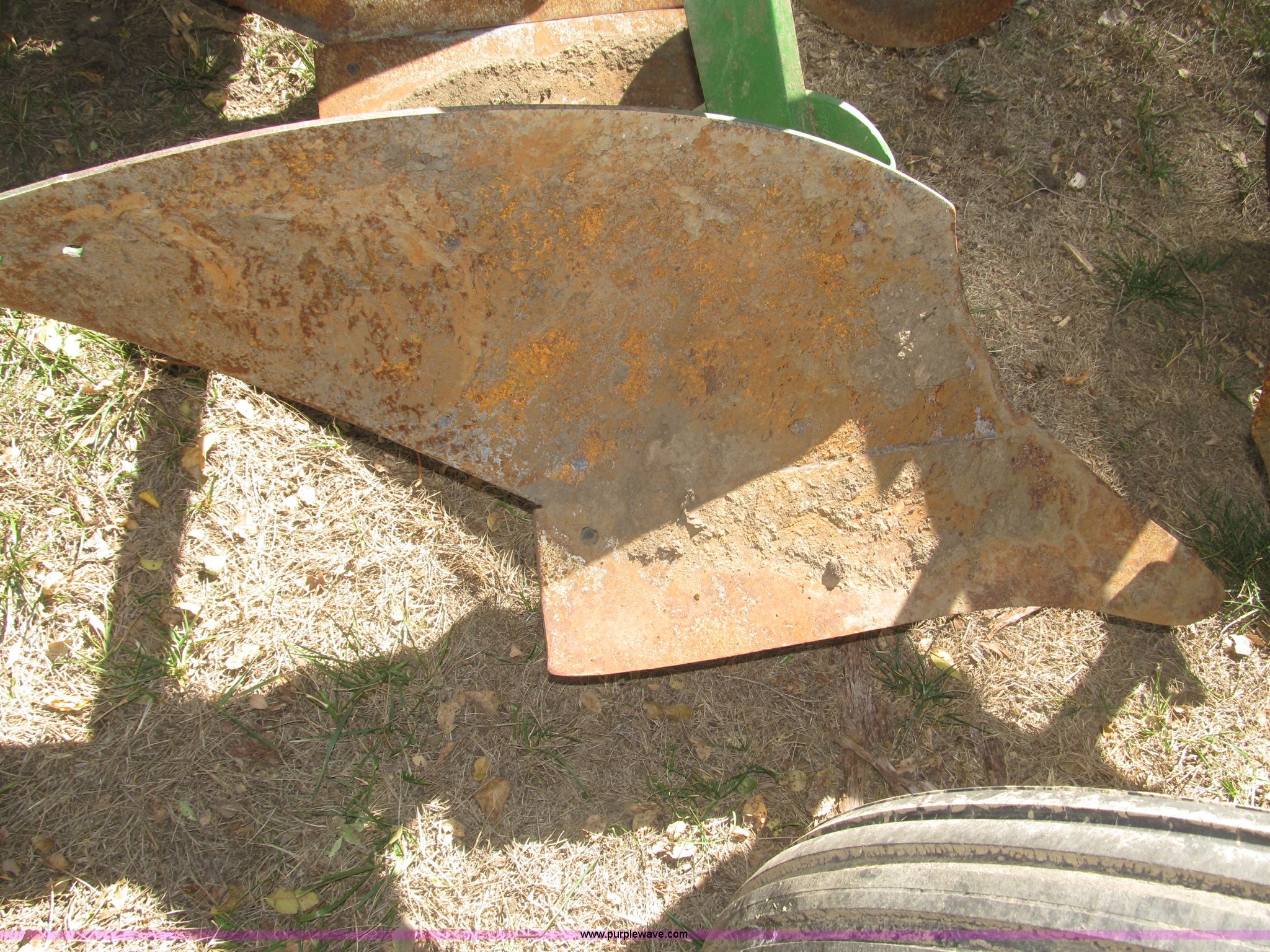 Purple Wave is selling a used Plow in Nebraska. This item is a John Deere 44 two bottom plow with the following: Manual depth adjust, Swivel cutters, Front cutter, Flute design/rear straight, Spring mounted hitch, adjustable, Custom hitch adapter for draw bar style, Approx. 3"W x 14.5" U-shape strap iron, 2.5" I.D. draw bar, 6.00-16SL front tires, 4.00-12SL rear tire