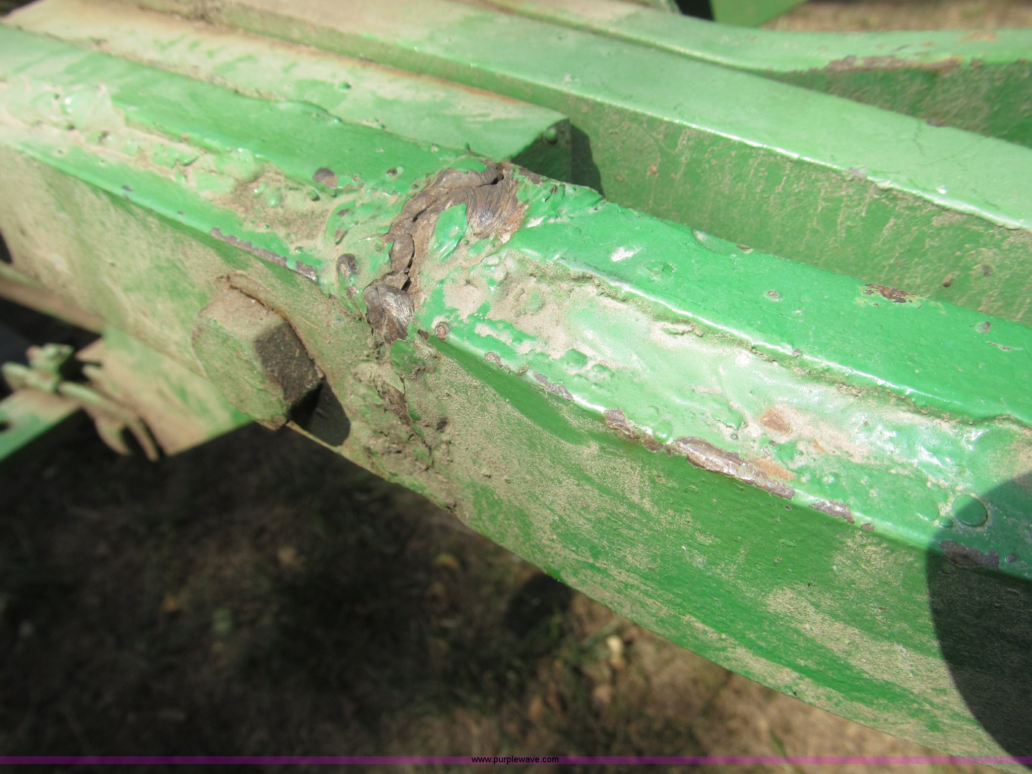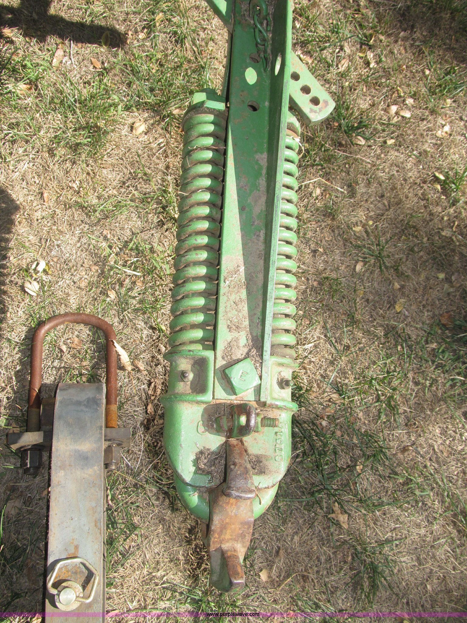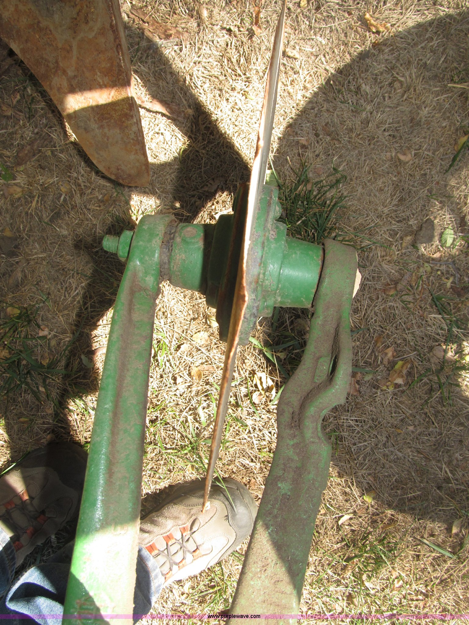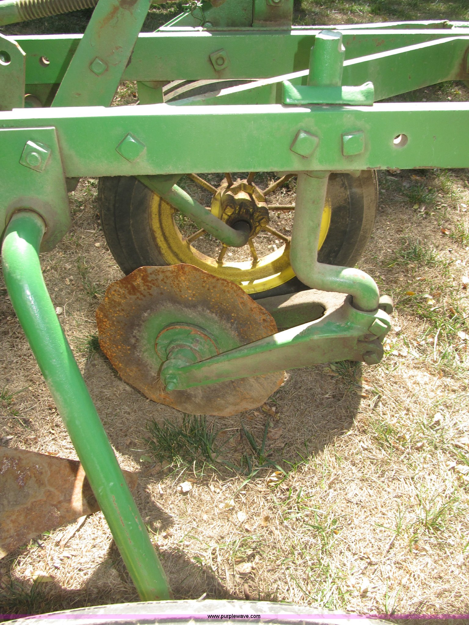 Purple Wave is selling a used Plow in Nebraska. This item is a John Deere 44 two bottom plow with the following: Manual depth adjust, Swivel cutters, Front cutter, Flute design/rear straight, Spring mounted hitch, adjustable, Custom hitch adapter for draw bar style, Approx. 3"W x 14.5" U-shape strap iron, 2.5" I.D. draw bar, 6.00-16SL front tires, 4.00-12SL rear tire
