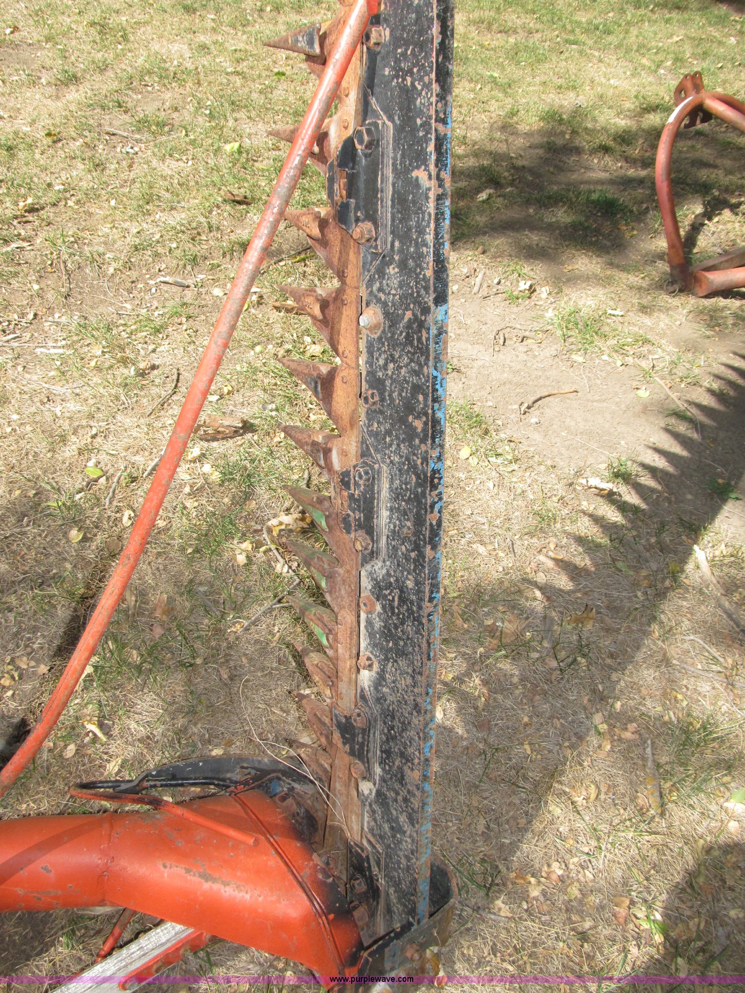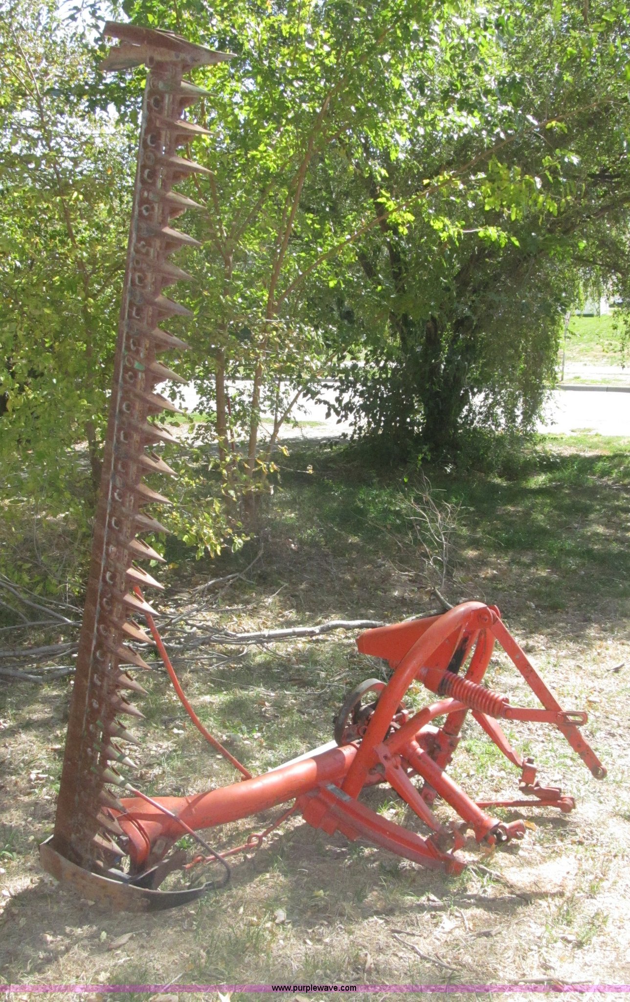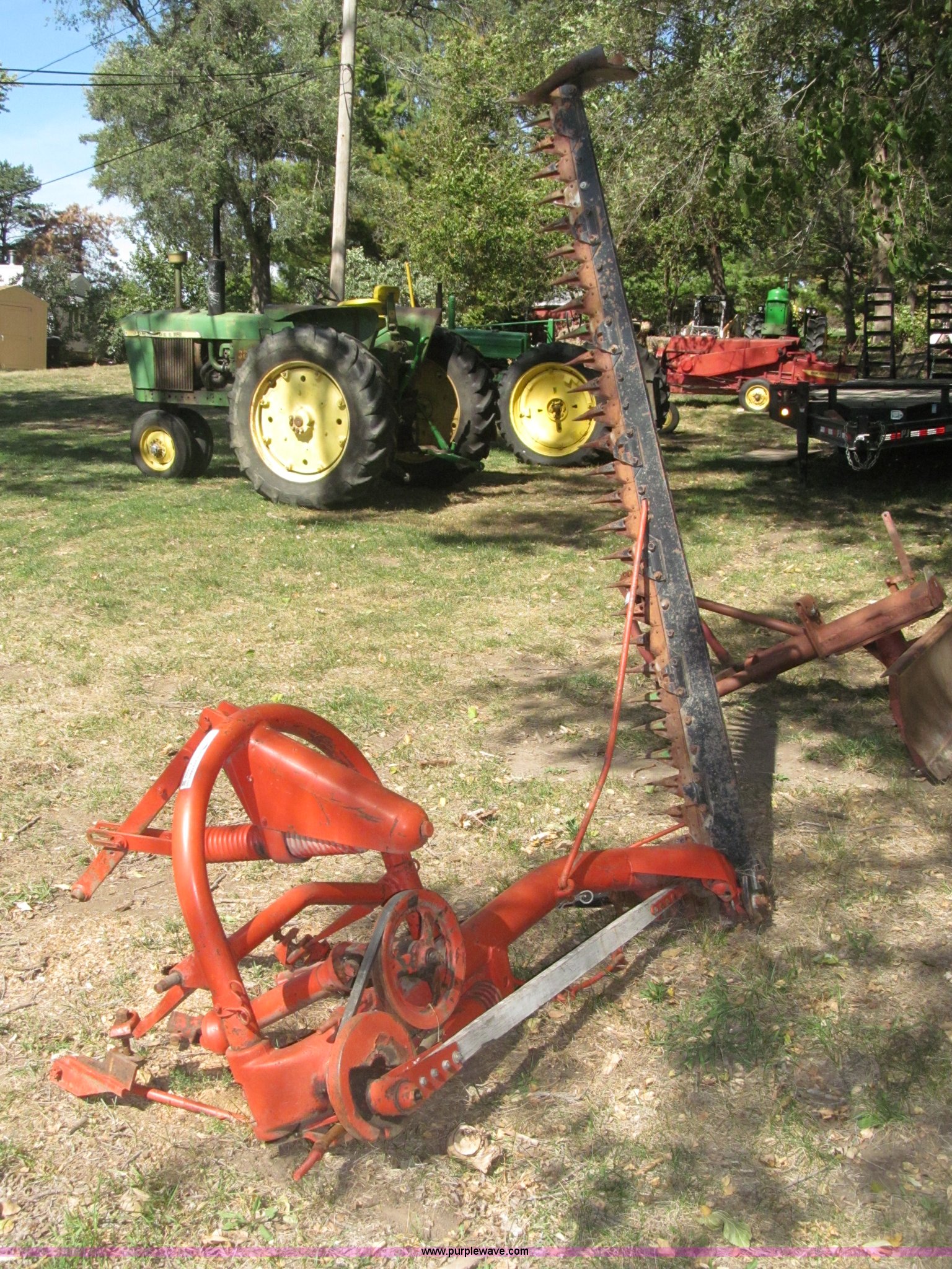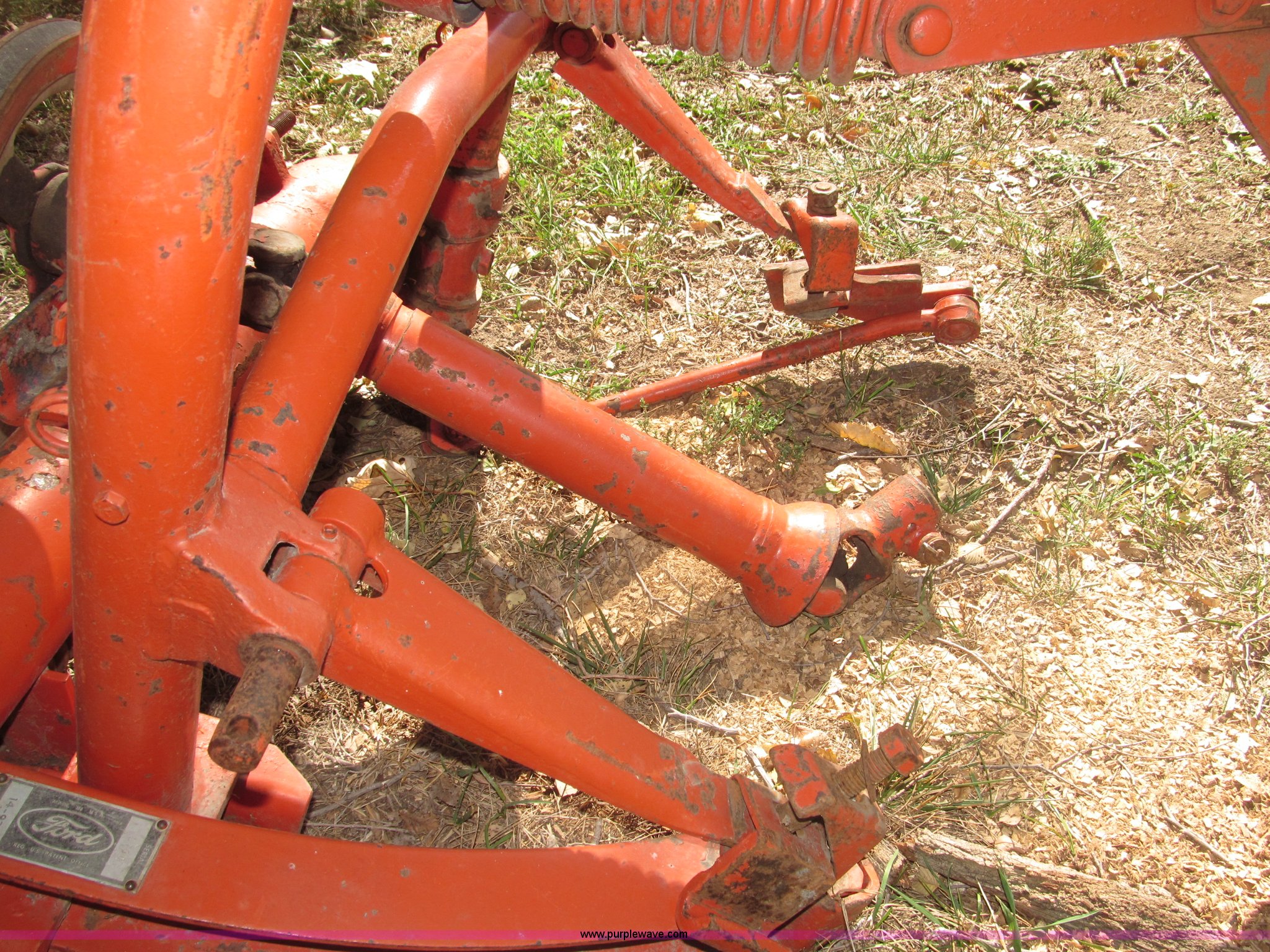 Purple Wave is selling a used Disc or Sickle Mower in Nebraska. This item is a Ford three point sickle bar mower with the following: Model 14-93, 540 RPM belt driven, Fits 2N, 8N, 9N, and Jubilee tractors, (28) sections, Approx. 7' sickle bar, Cracked section/dent guard, Serial 1704
