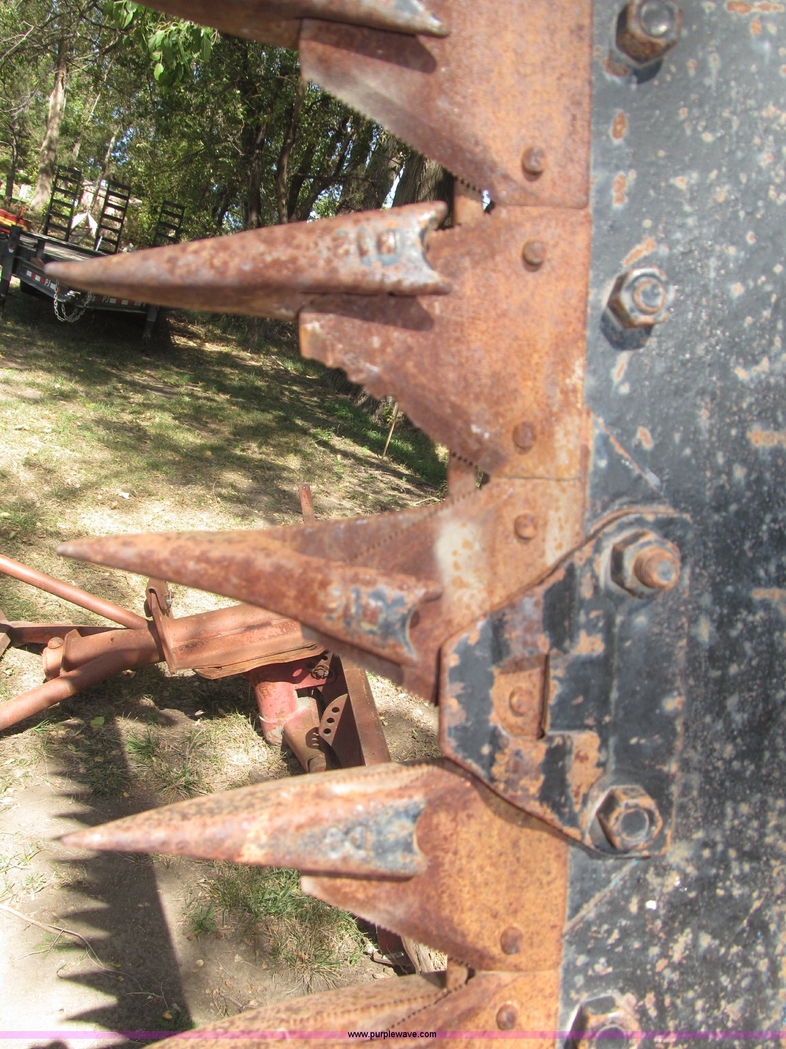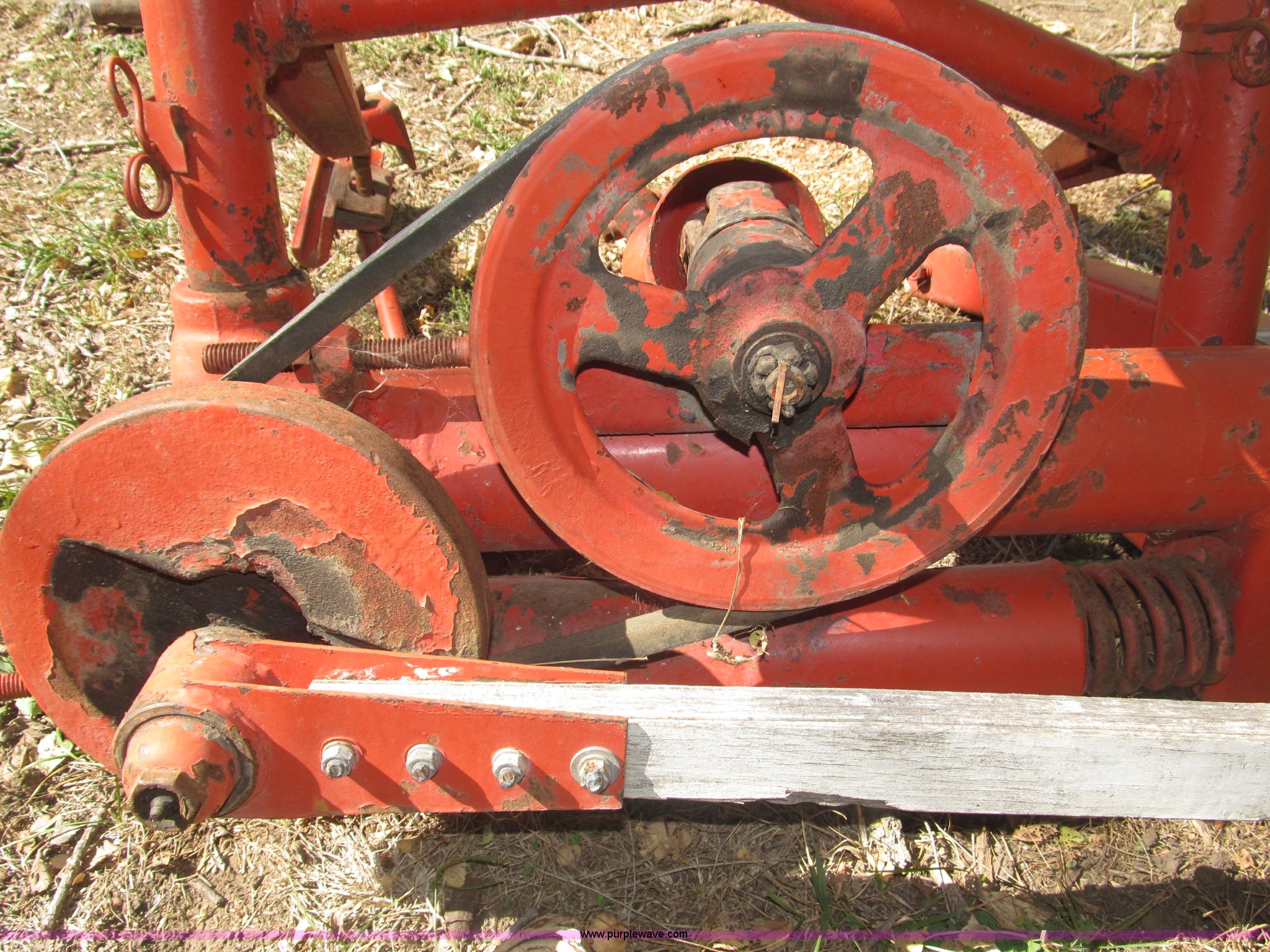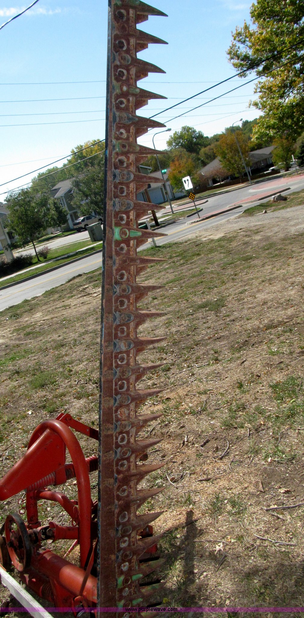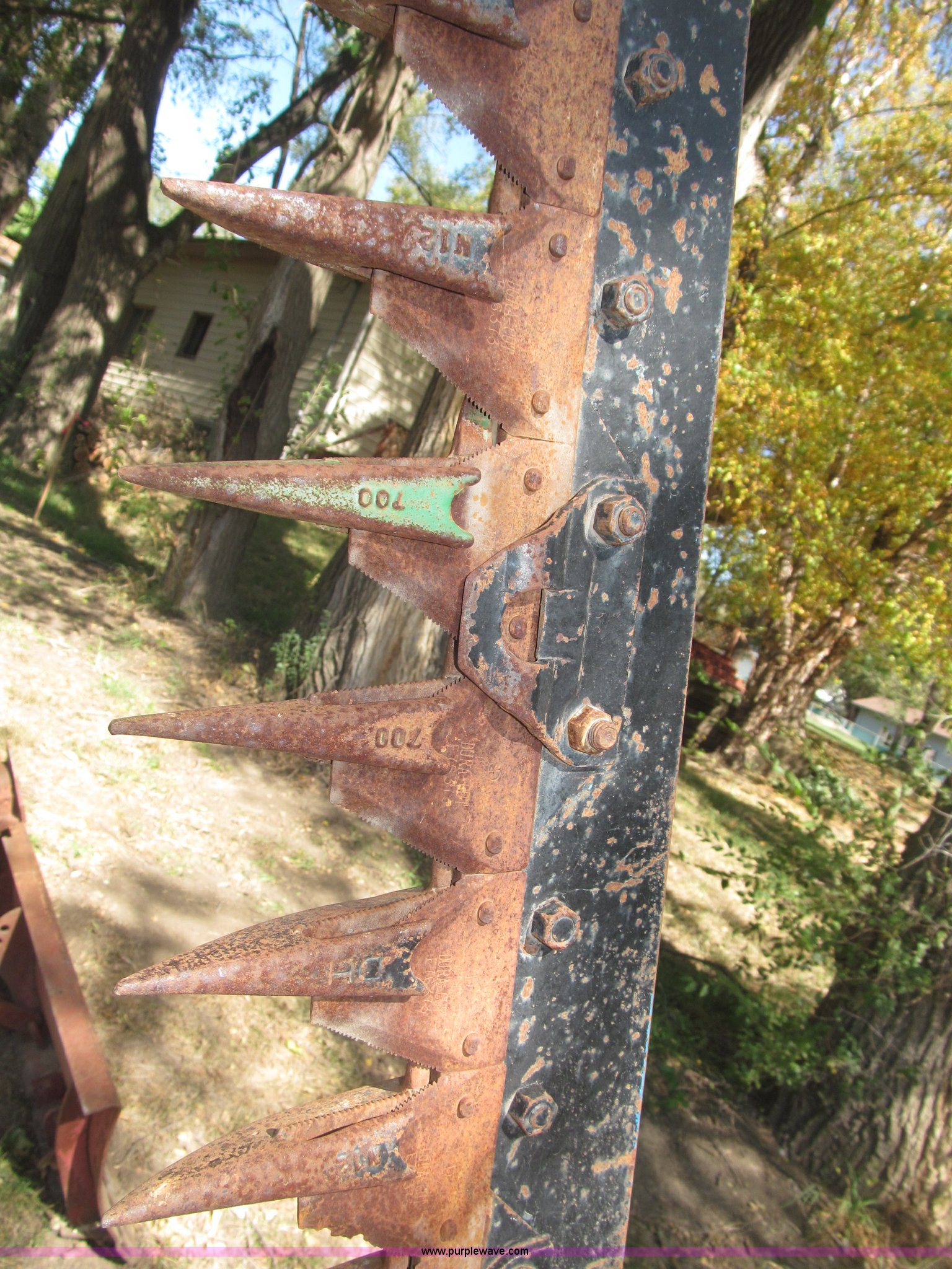Purple Wave is selling a used Disc or Sickle Mower in Nebraska. This item is a Ford three point sickle bar mower with the following: Model 14-93, 540 RPM belt driven, Fits 2N, 8N, 9N, and Jubilee tractors, (28) sections, Approx. 7' sickle bar, Cracked section/dent guard, Serial 1704