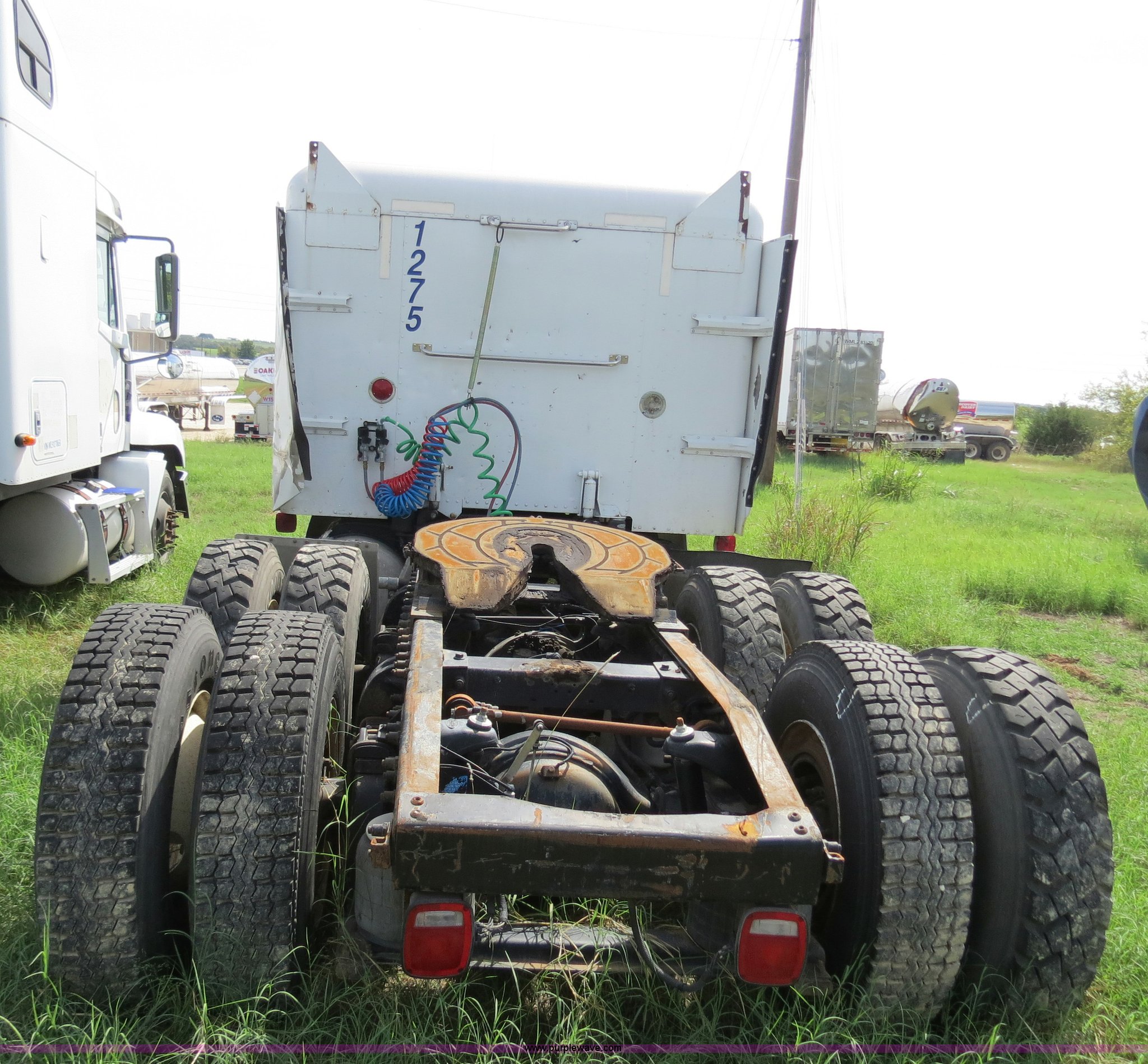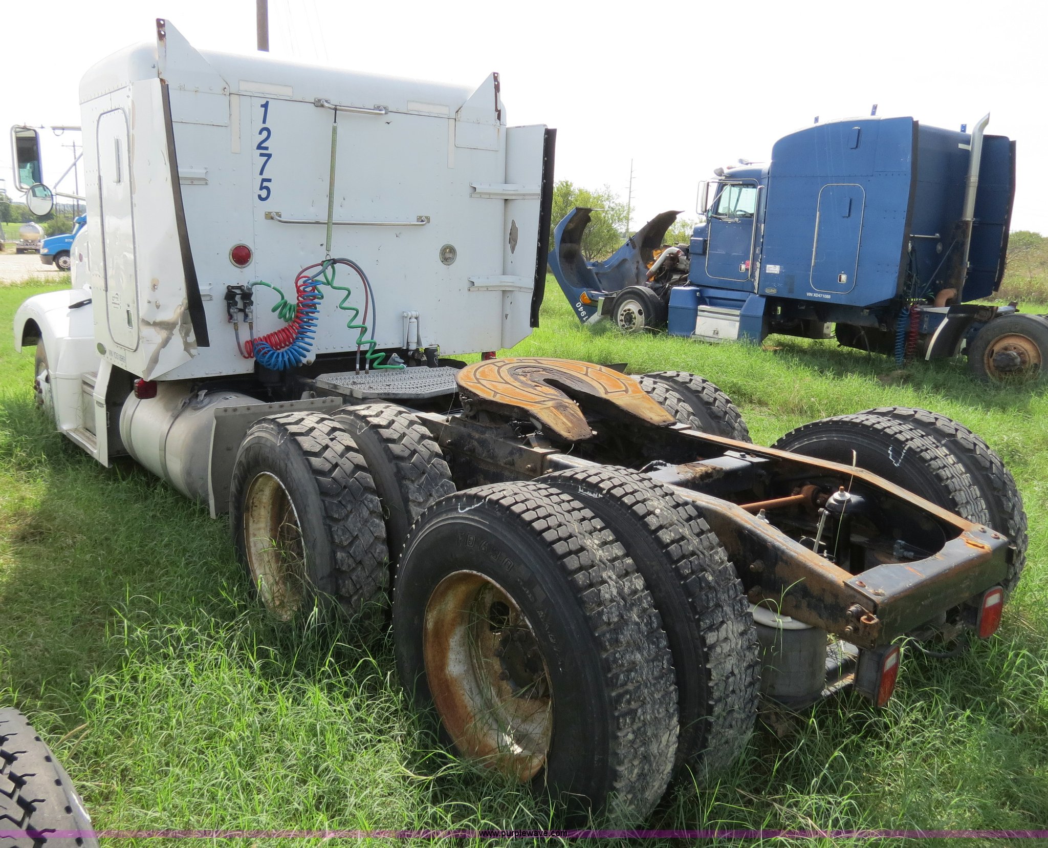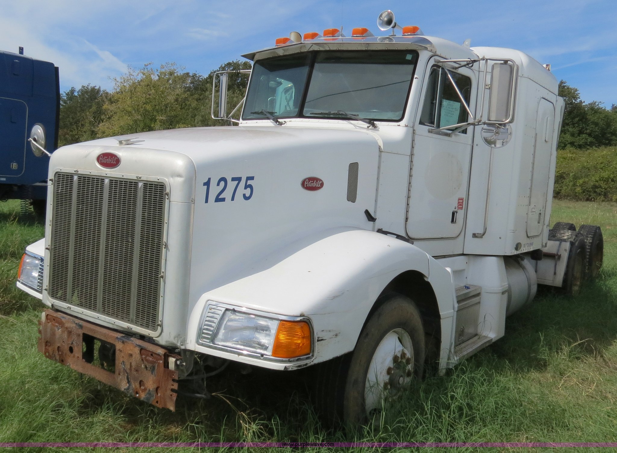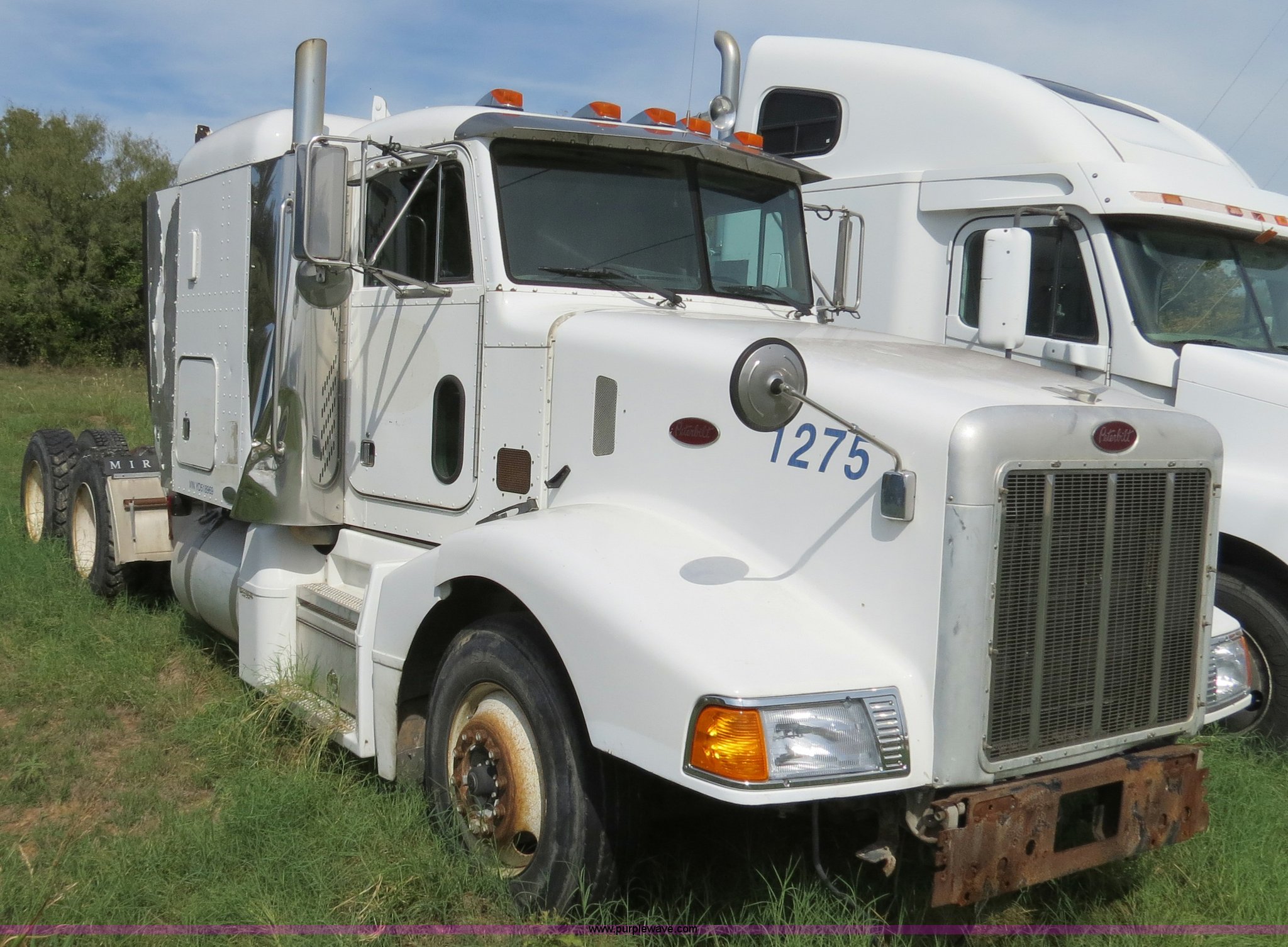 Purple Wave is selling a used Truck Tractor in Texas. This item is a 2000 Peterbilt 377 semi truck with the following: 1,280,544 miles on odometer, Caterpillar C12 12.0L diesel engine, 355 HP, Does not run, Serial 2KS44756, Eaton Fuller 10 speed manual transmission, Model RTLO-14-610-BT2, Twin screw, AC and heat, Tilt, Cruise, AM/FM/cassette, Passenger daylight door, Air suspension seat, Heated mirrors, Air ride cab, Single bunk sleeper, Storage, Visor, Chrome bumper, Dual 110 gallon fuel tanks, Single rear exhaust stack, Aluminum deck plate, Dump valves, Air suspension, Air brakes, 295/75R22.5 tires, GVWR 50,000 lbs, FAWR 12,000 lbs, IAWR 19,000 lbs, RAWR 19,000 lbs, 3.70 gear ratio, Does not run, #6 injector roller problem, Cam lobe worn down, Engine misses, Front bumper missing, Unit# 1275
