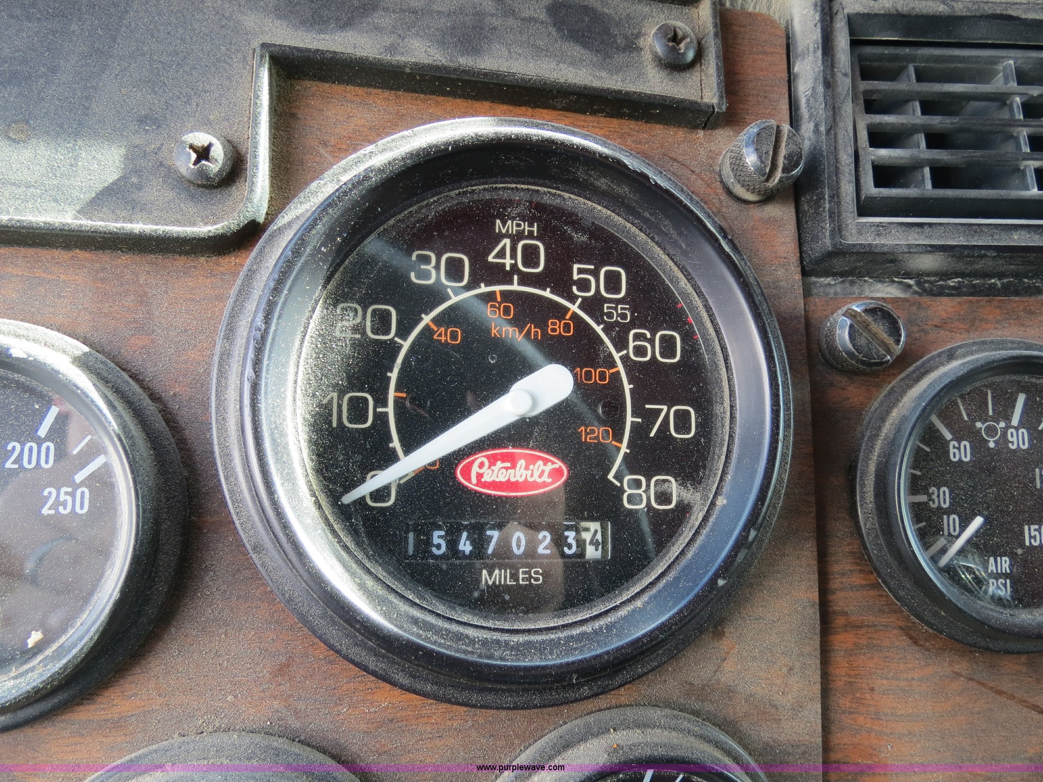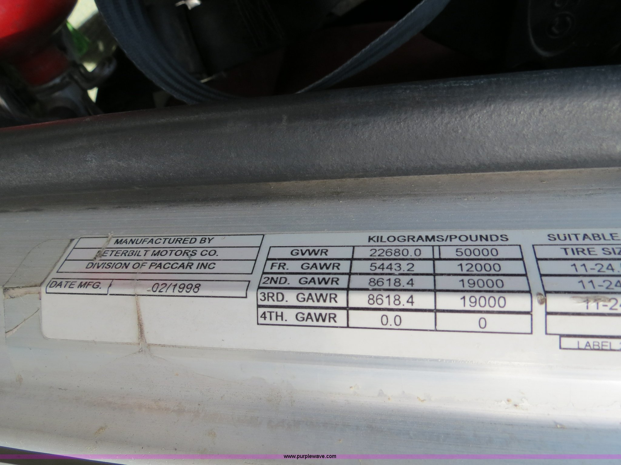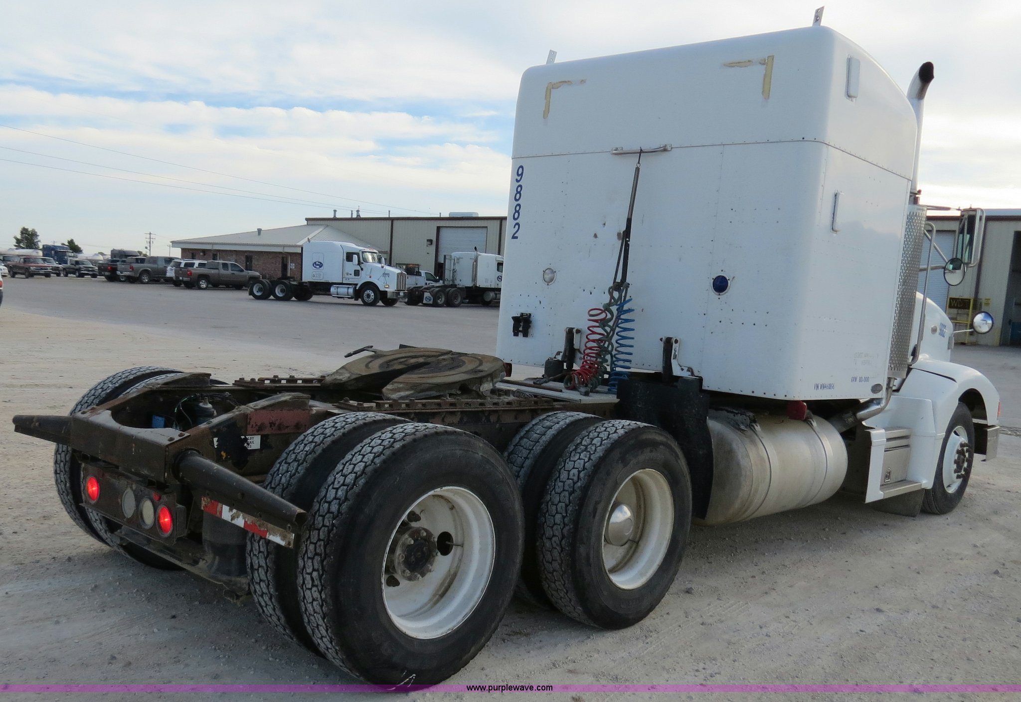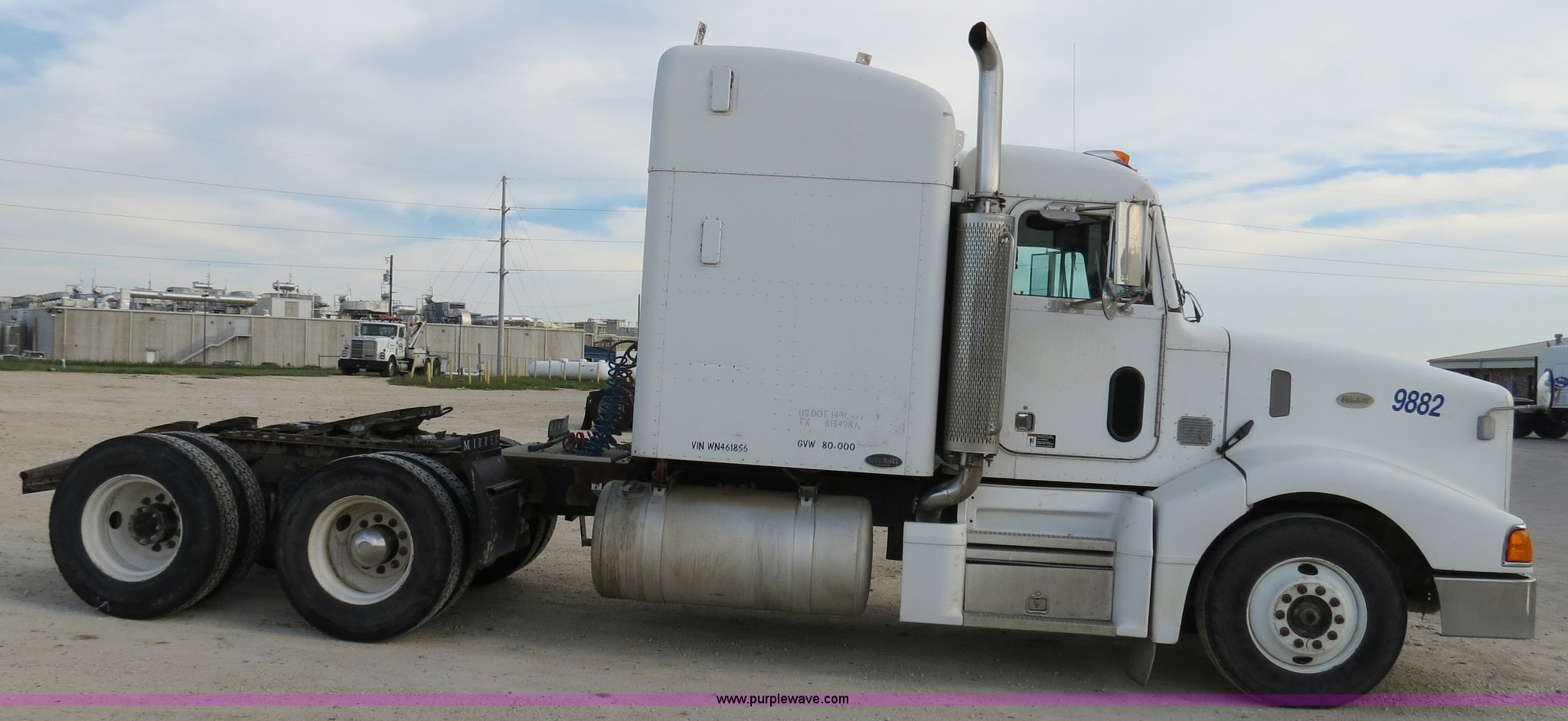 Purple Wave is selling a used Truck Tractor in Texas. This item is a 1998 Peterbilt 377 semi truck with the following: 1,547,023 miles on odometer, Caterpillar 3406 14.6L diesel engine, 435 HP, Serial 1LW04309, Eaton Fuller 10 speed manual transmission, Model FRO16210C, Twin screw, AC and heat, Cruise, AM/FM/CD, Passenger daylight door, Air suspension seat, Power and heated mirrors, Air ride cab, Single bunk sleeper, Storage, Visor, Chrome bumper, Air slide fifth wheel, Dual 110 gallon fuel tanks, Single rear exhaust stack, Aluminum deck plate, Dump valves, Air suspension, Air brakes, 295/75R22.5 tires, GVWR 50,000 lbs, FAWR 12,000 lbs, IAWR 19,000 lbs, RAWR 19,000 lbs, 3.70 gear ratio, Unit# 9882